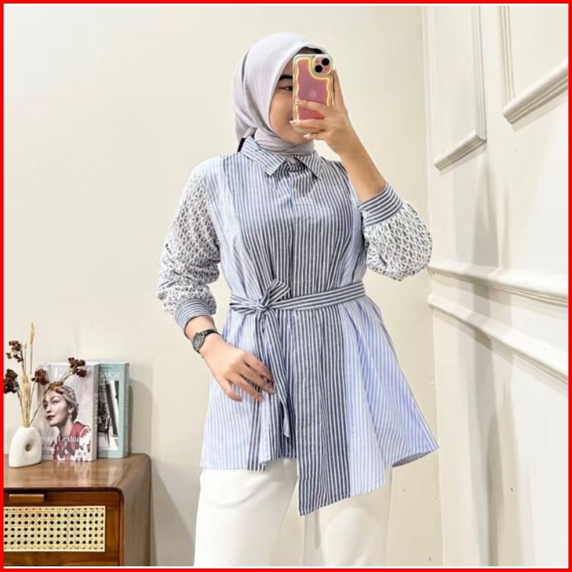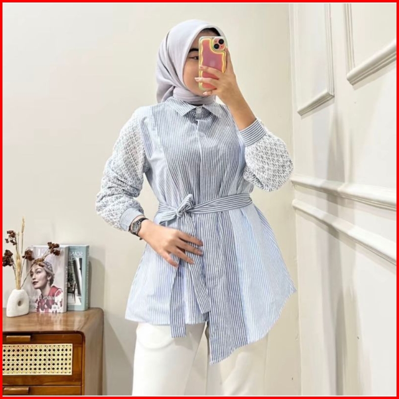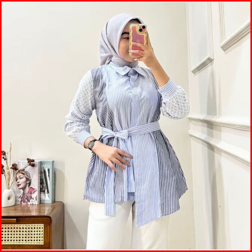 Blouse Kemeja Atasan Salur Kombinasi Lengan Brukat Katun Premium