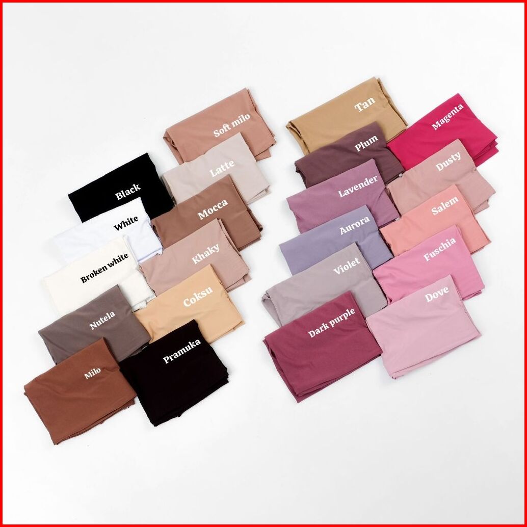 Hitam, Putih, Broken white, Nutella, milo, Sofmilo, Latte, Khaki, pramuka, Coksu, Tan, Plum, Lavender, aurora, Dark purple, magenta, Dusty, salem, Dove, Fuschia, Grey, Darkgrey, navy, denim, Biru elektrik, Burgundy, maroon, Chili, Merah hati, Mustard, lemon, teracotta, Sage, Olive, zaitun, army, tosca, Turkish blue, Wardah, Hijau botol, Hijau lumut