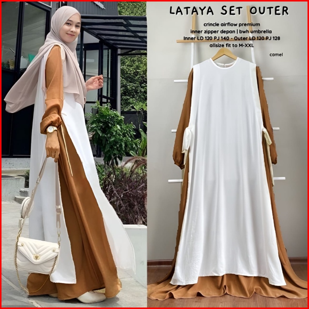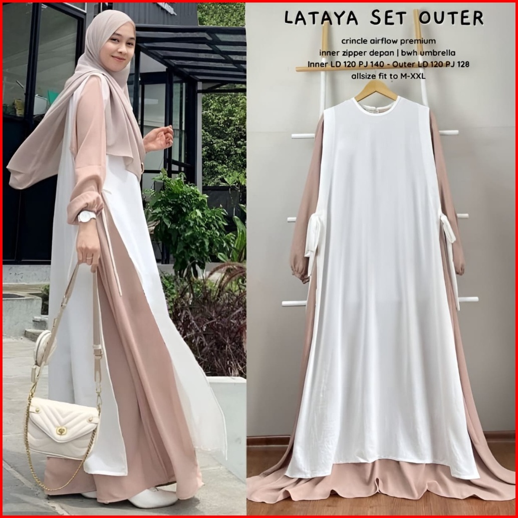 Vallina Outfit - Lataya Set 2in1 Gamis Maxy Outer Wanita Muslim Polos Dress Crinkle Lebaran Premium