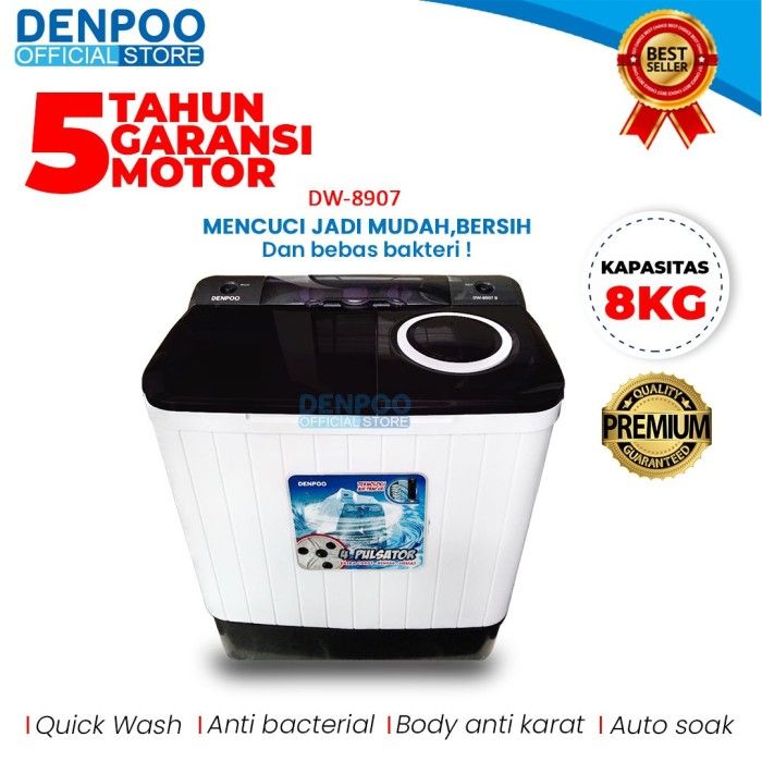 mesin cuci 2 tabung 10 kg DENPOO MESIN CUCI DW 8907 4P 8KG 2 TABUNG - Abu-abu