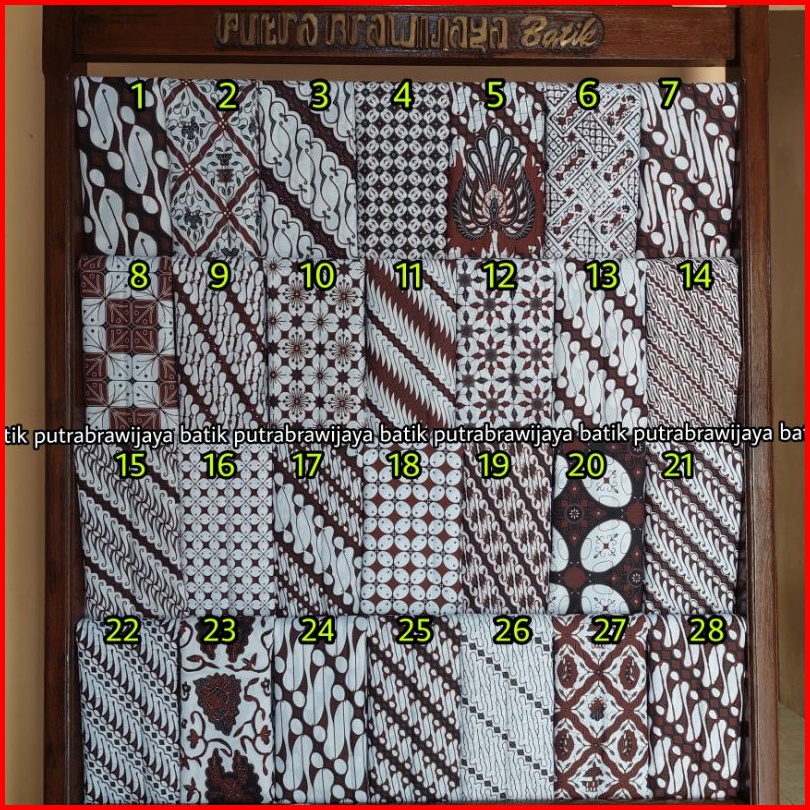 Embos merah, 1, 2, 3, 4, 5, 6, 7, 8, 9, 10, 11, 12, 13, 14, 15, 16, 17, 18, 19, 20, 21, 22, 23, 24, 25, 26, 27, 28, Motif bambu, Parang rencong, Parang kang adi, Kipas, Kawung mini garuda, Gajah mada, Seno liris, Parang seno, Liris garuda, Truntum garuda, Parang bunga kantil, Trumtum, Liris, Parang kletik
