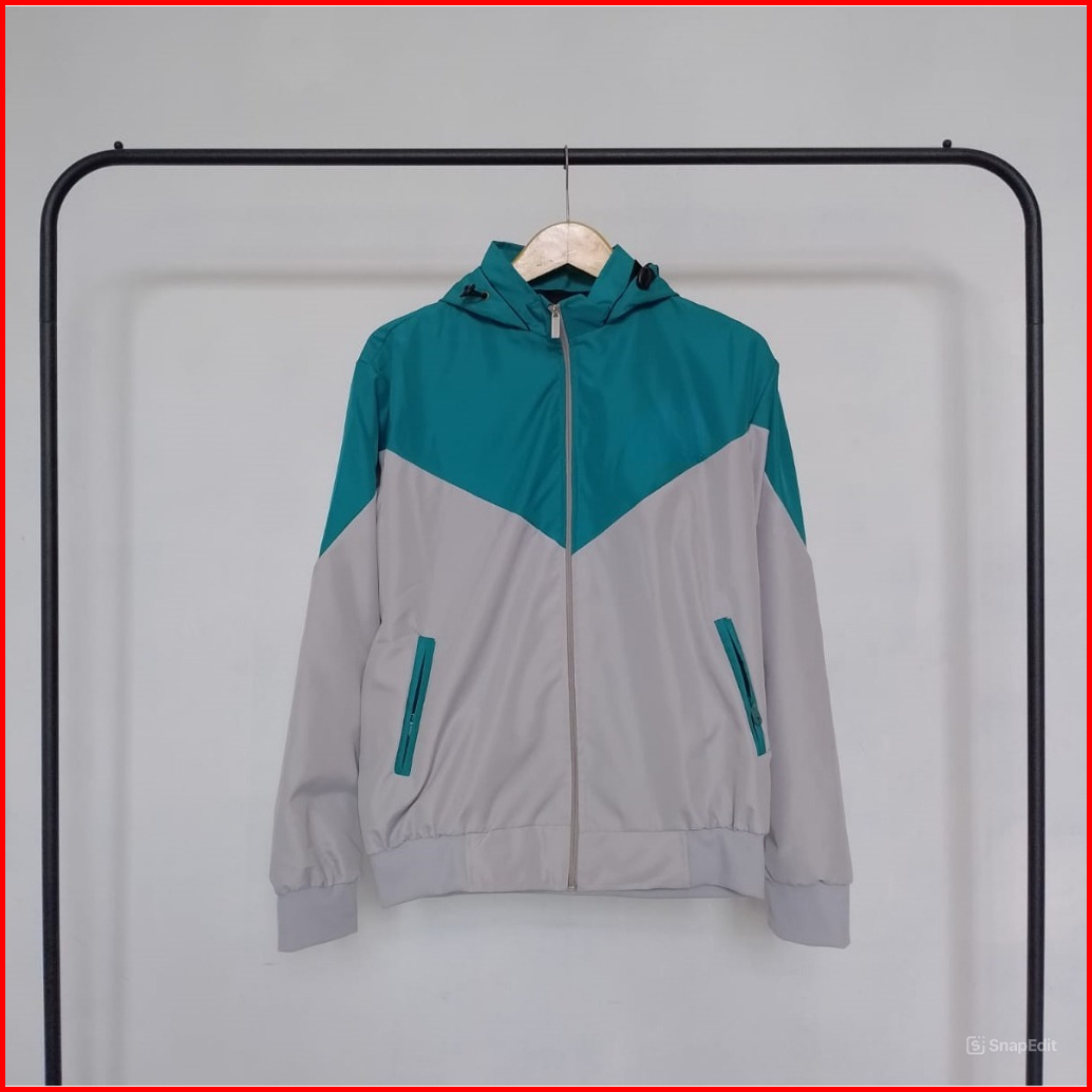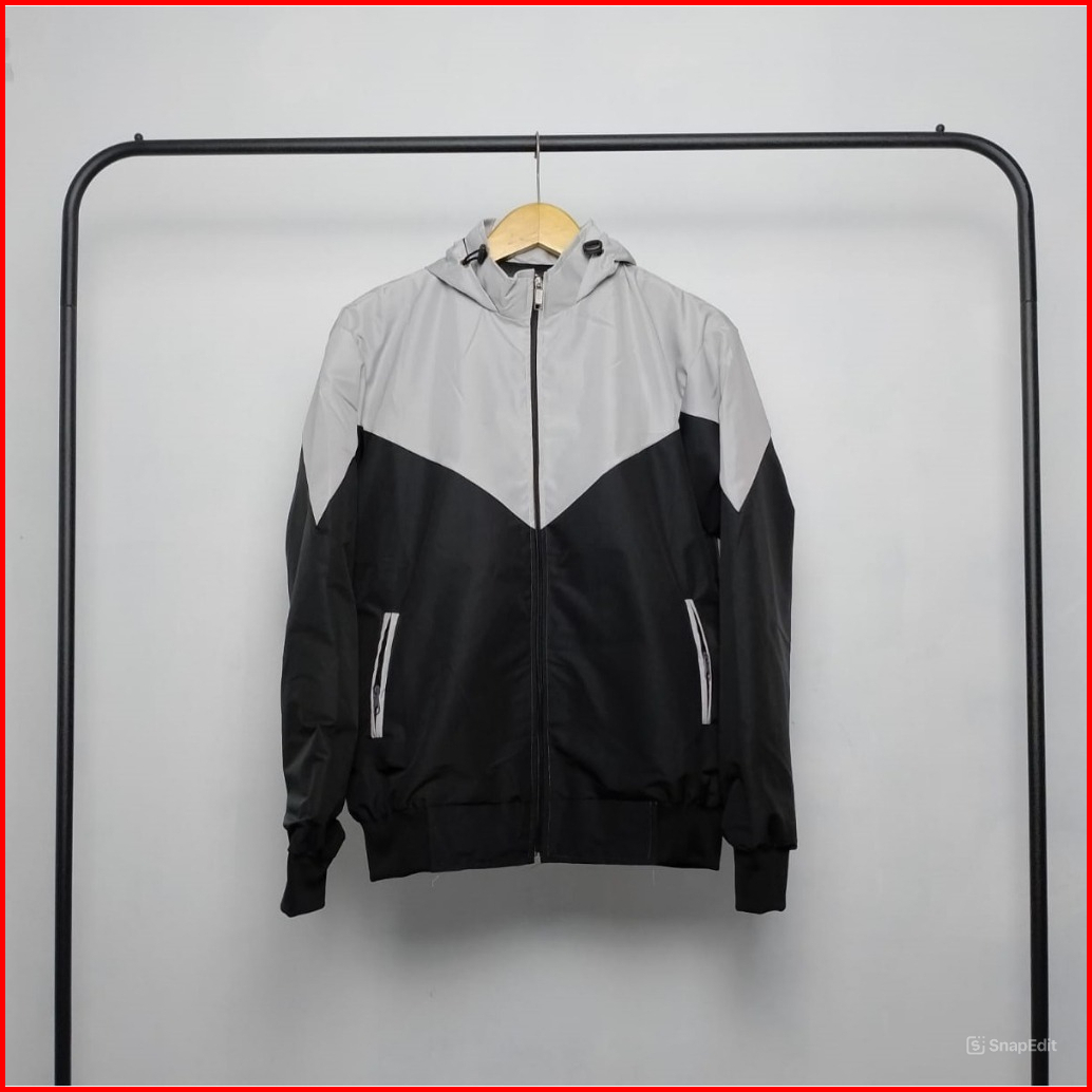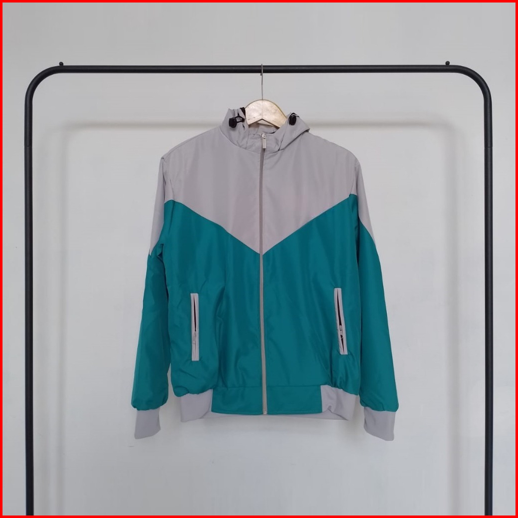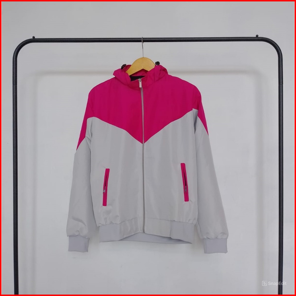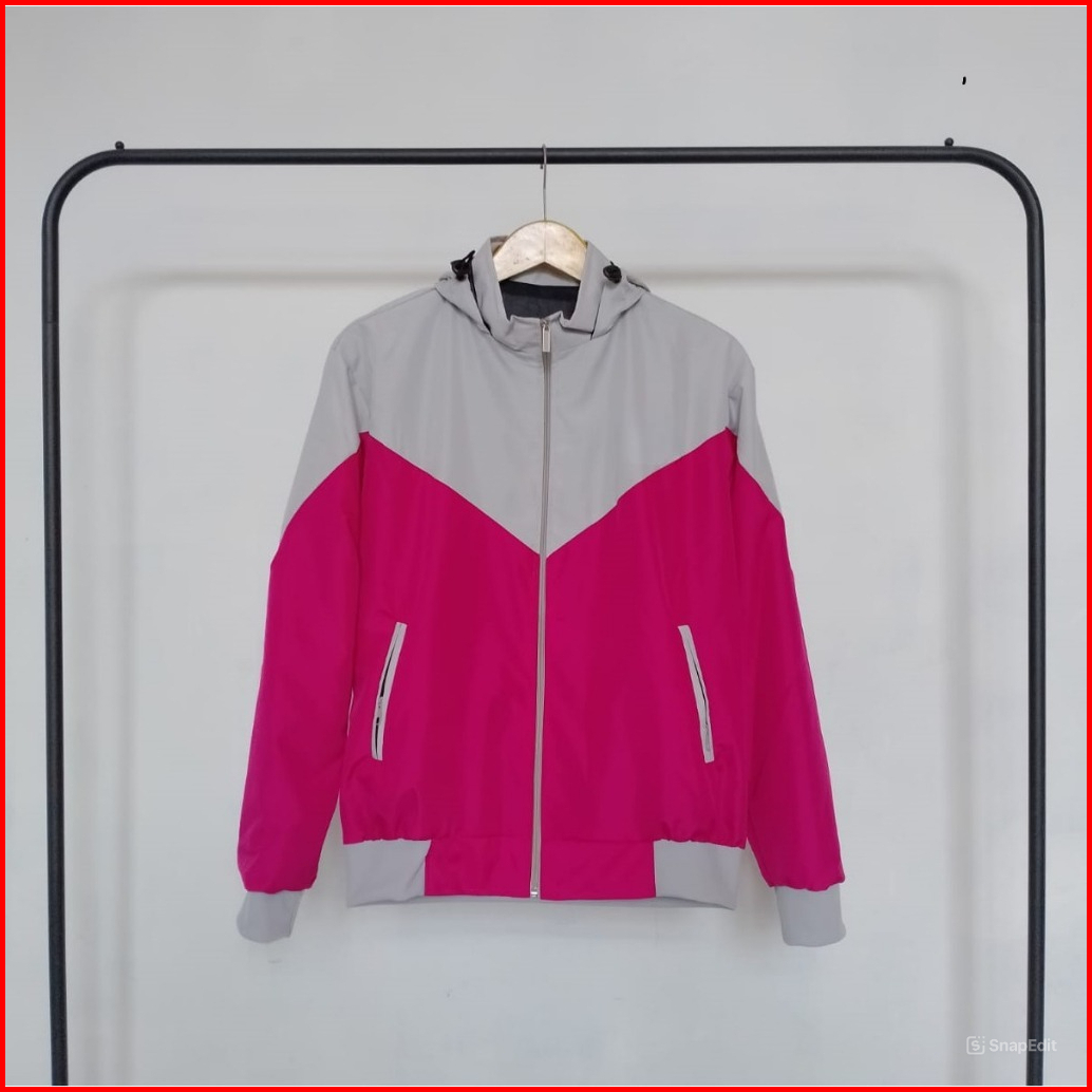 Jaket Parasut Wanita Pink Abu Dengan Kupluk Dan Saku Resleting