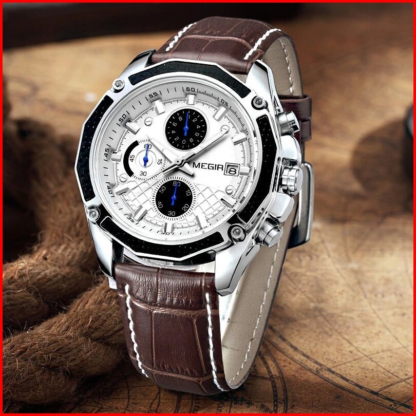 Megir 2015 Jam Tangan Pria Analog Chronograph Tanggal Aktif Tali Kulit Mgos