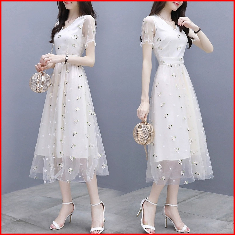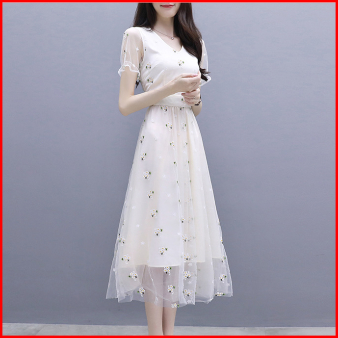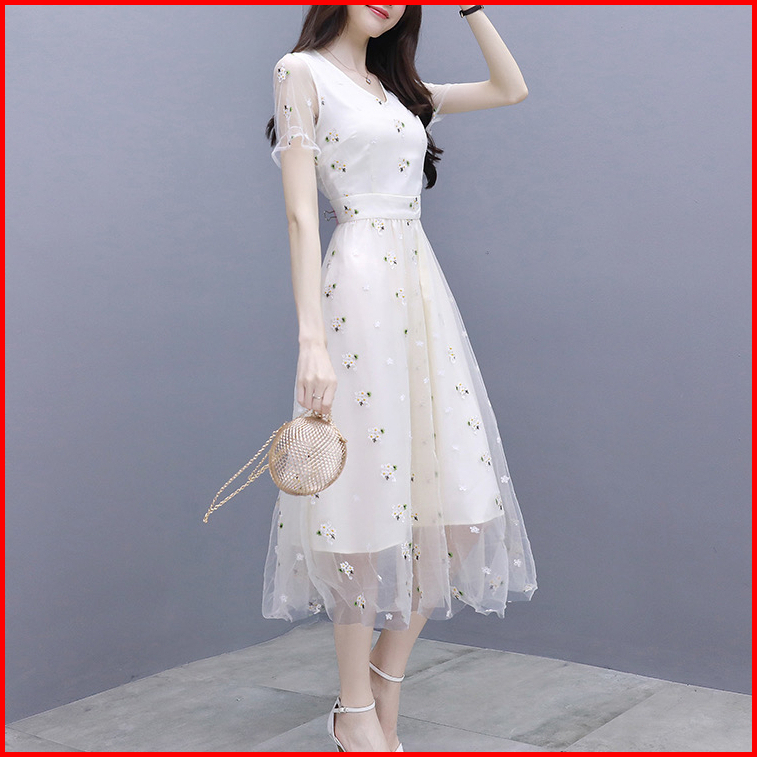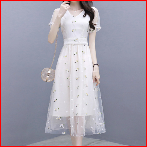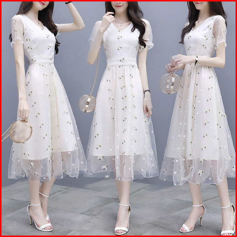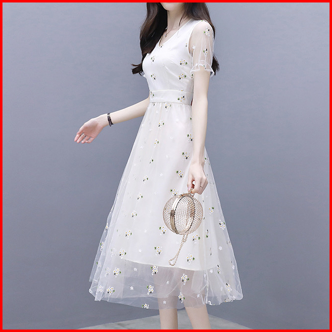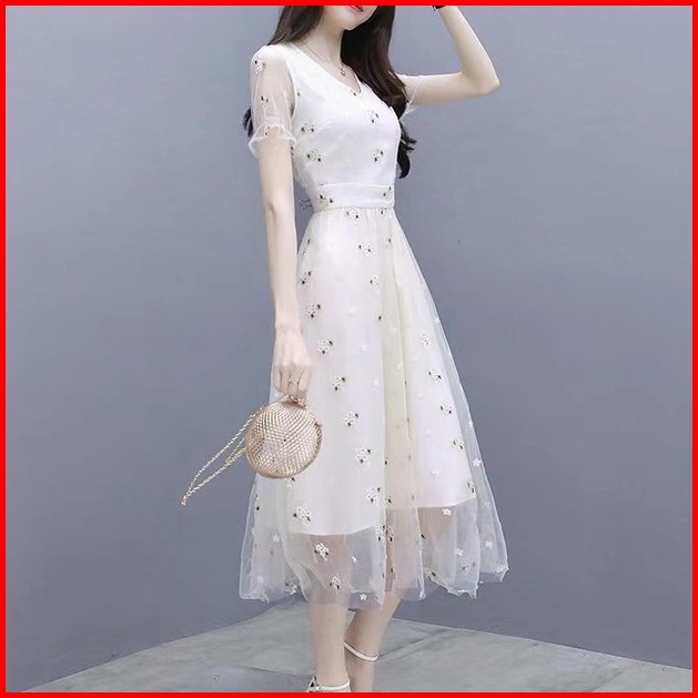 Gaun Putih Wanita 2023 Sifon Bunga Tipis Pinggang Baru A -rine Rok Dress Chiffon