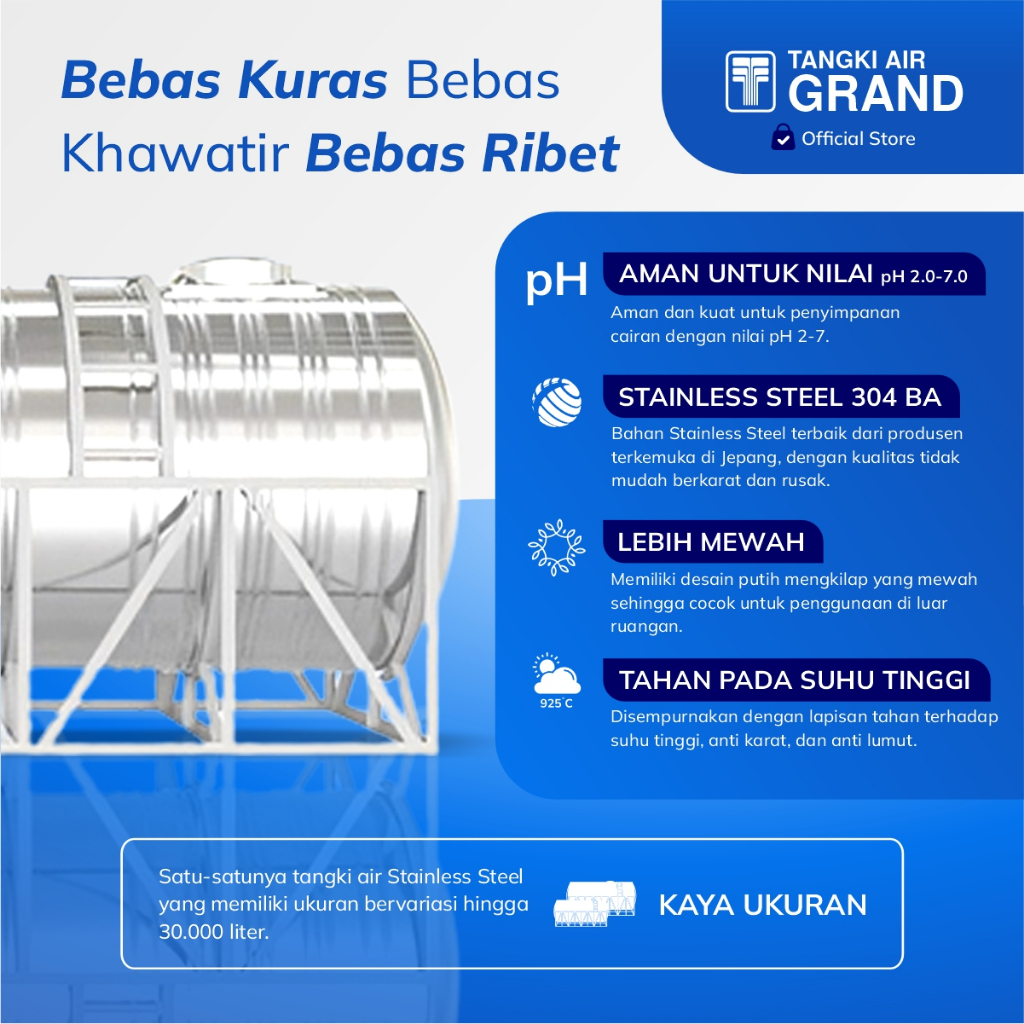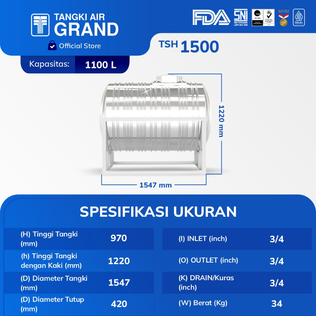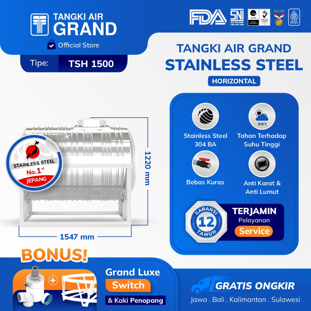 Toren Tangki Air Tandon Stainless Horizontal Grand TSH 1500 Anti Lumut Halal Garansi 12 Tahun