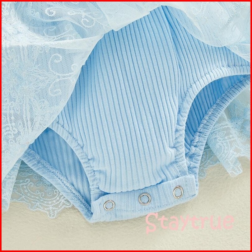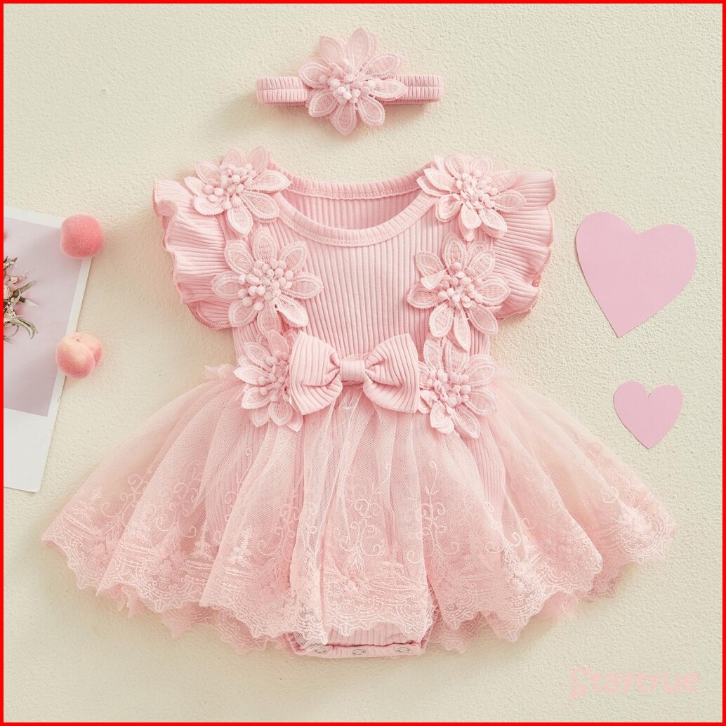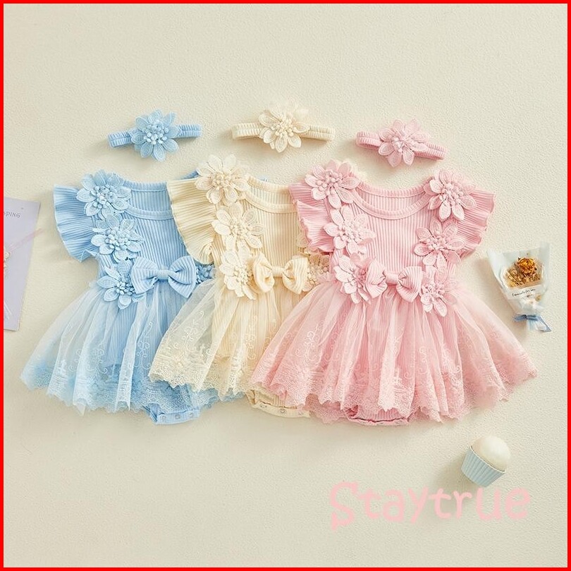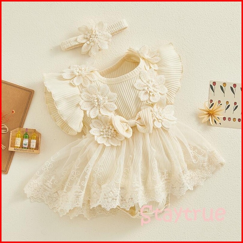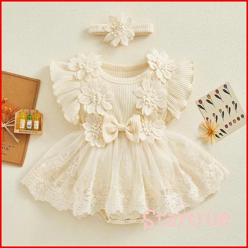 Pakaian Bayi Perempuan 2 Potong Gaun Baju Monyet Ruffle Tambal Sulam Renda Jaring Dan Ikat Kepala Pakaian Musim Panas Mo