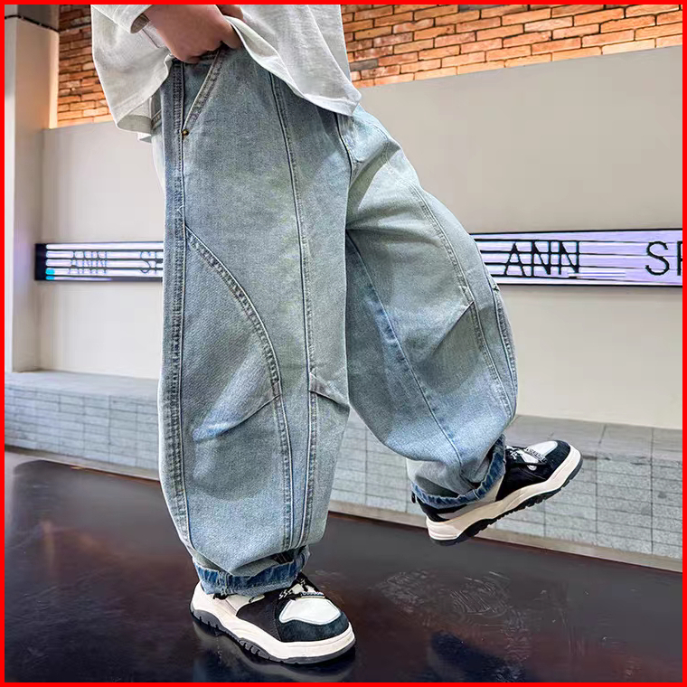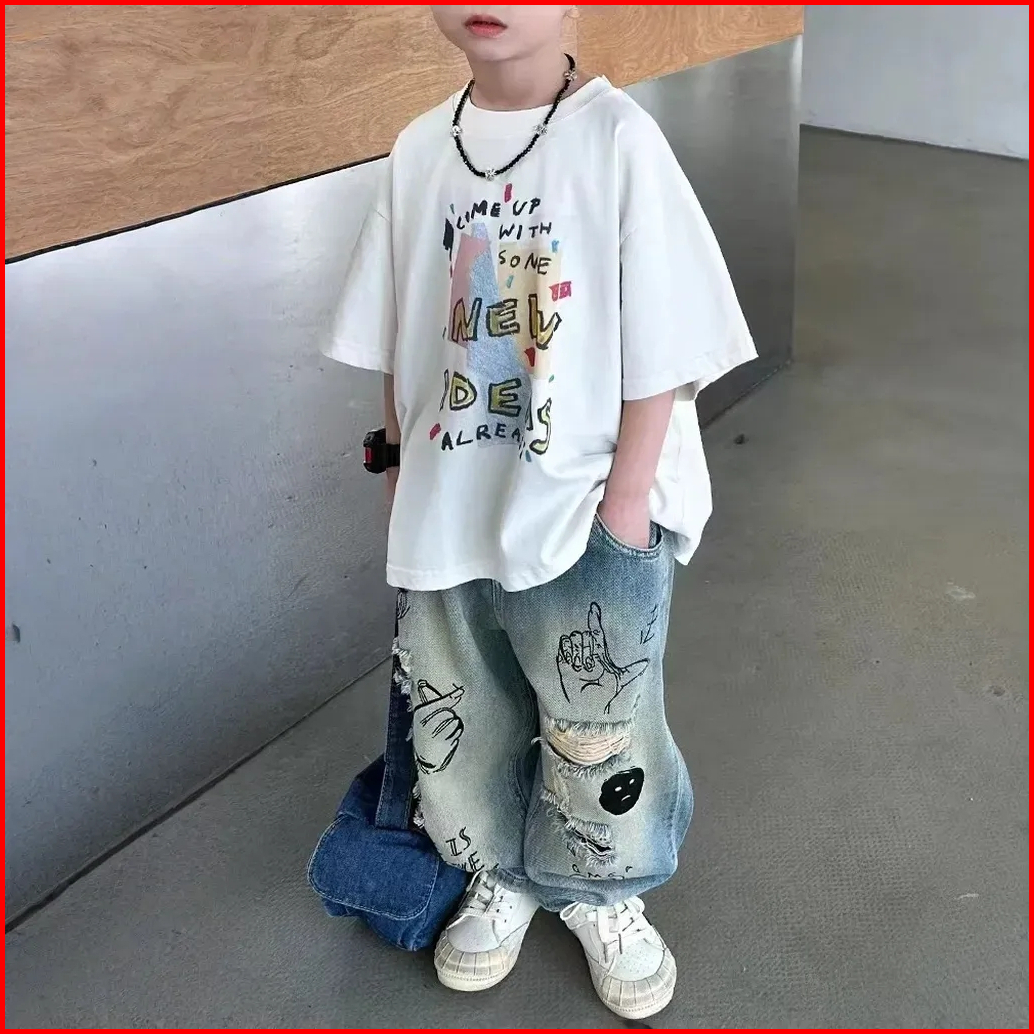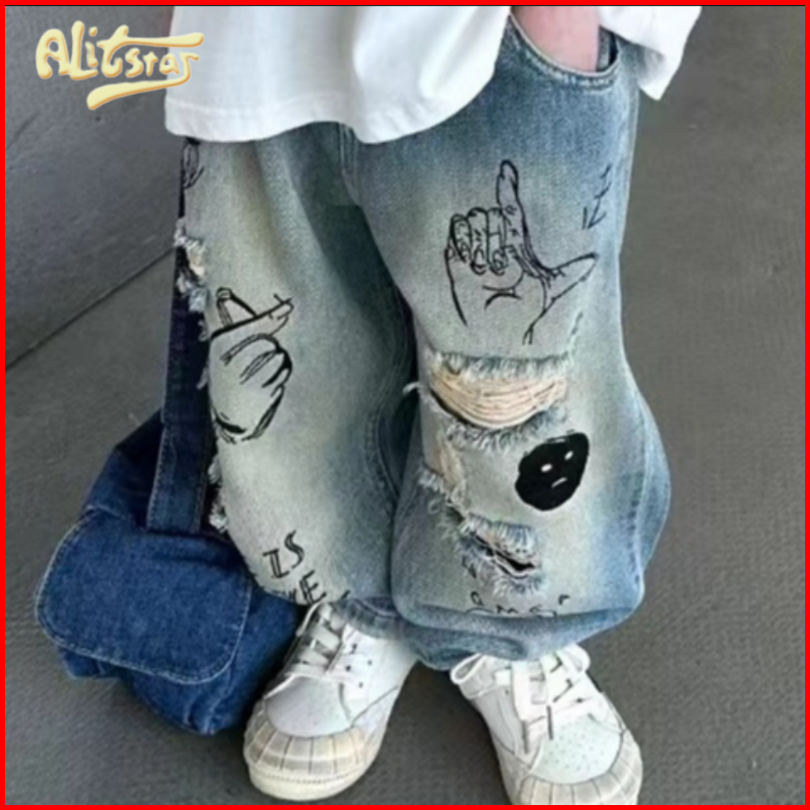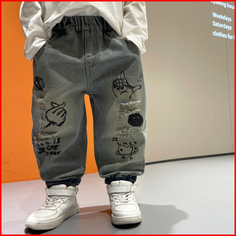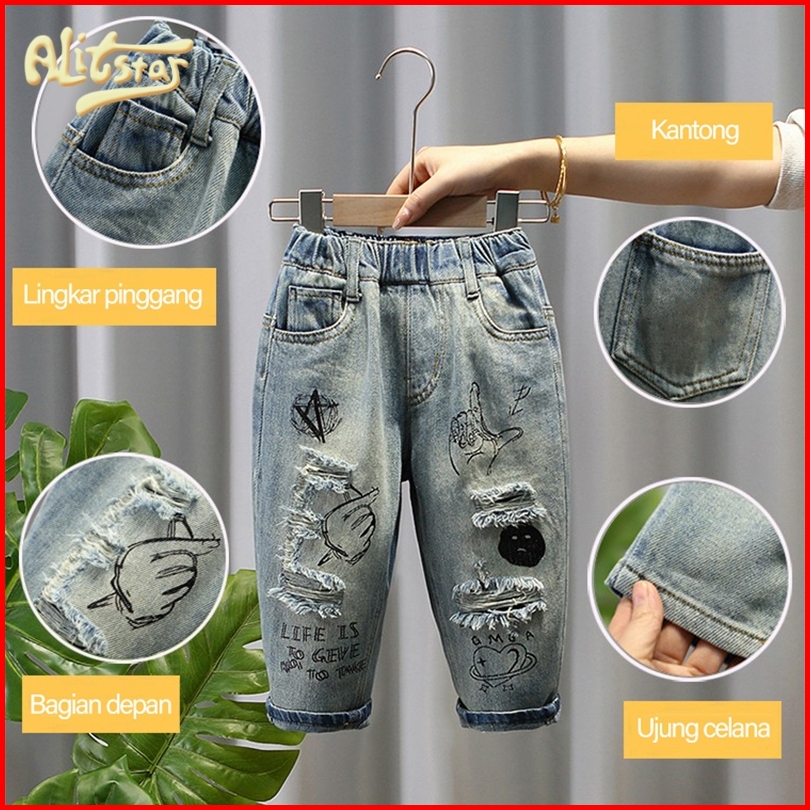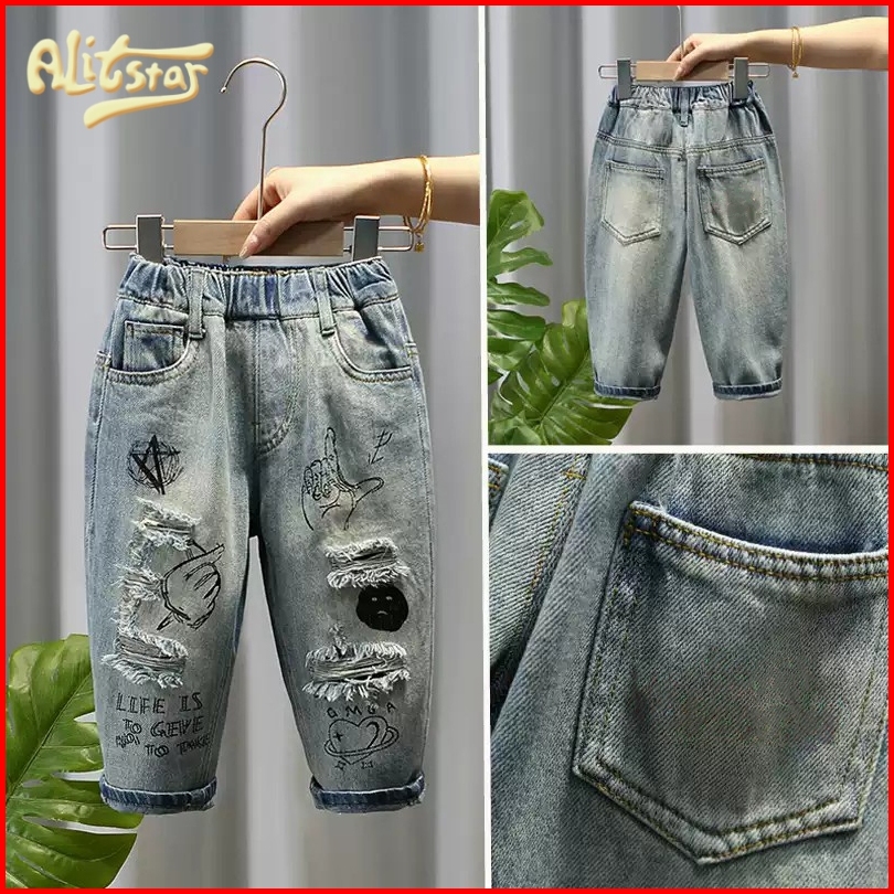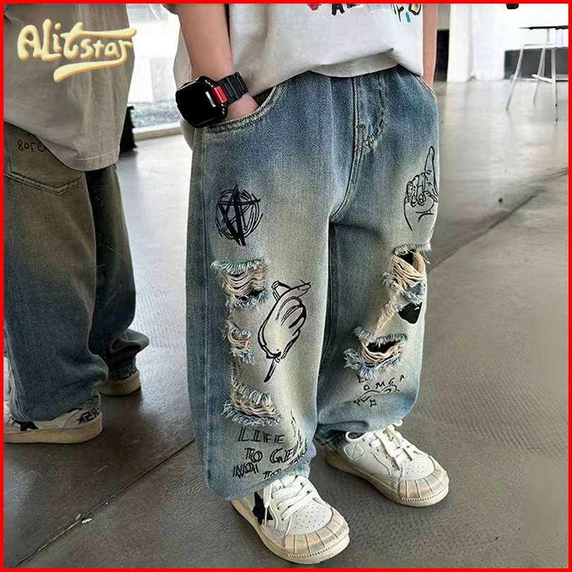 Alitstar Celana Jeans Panjang Anak Laki Laki Usia 2-10 Tahun Sobek Graffiti Pattern Baggy Jeans