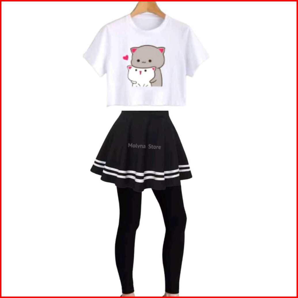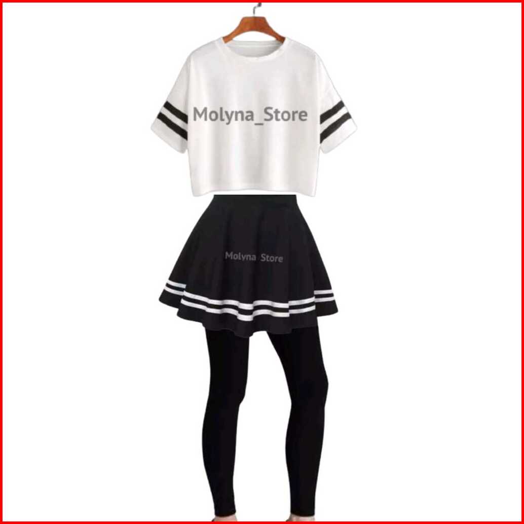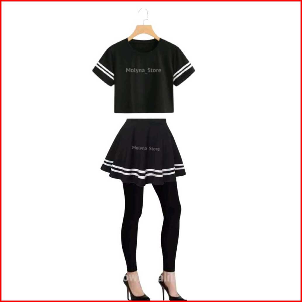 One Set Setelan Olahraga Wanita Rok Legging Kaos Croptop