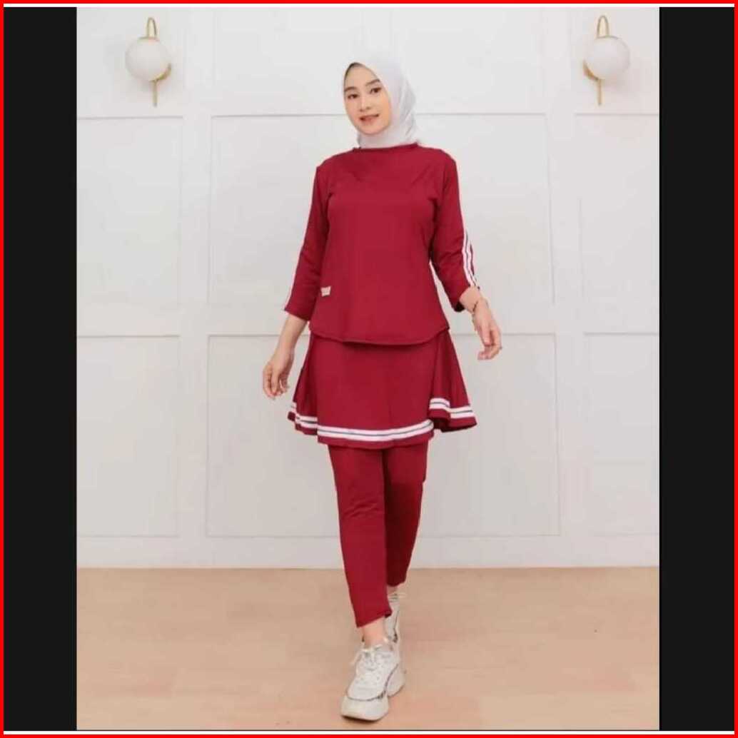 Setelan Kaos Olahraga Wanita Kaos Rok Celana 1 Set Lengan Panjang Syar I Bahan Double Super