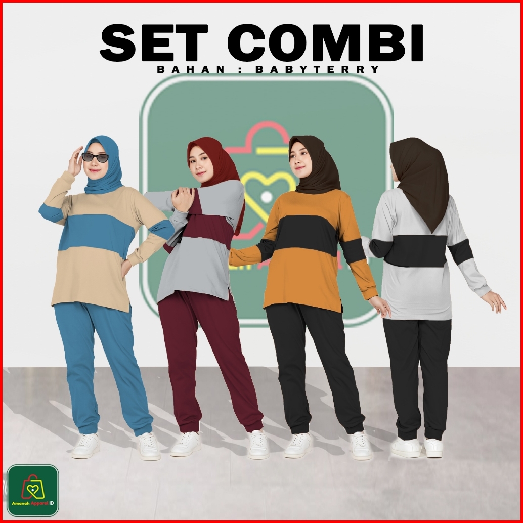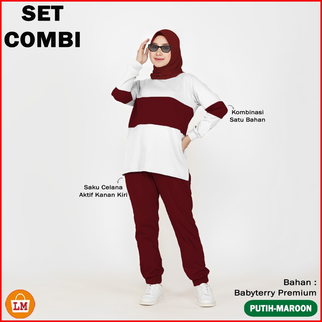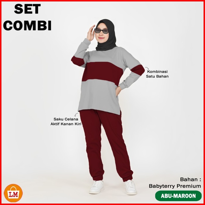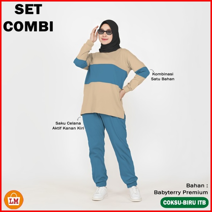 Set Combi Big Size Setelan Kaos Celana Olahraga Wanita Muslimah Kombinasi Warna Lengan Panjang Bahan Babyterry Adem Size