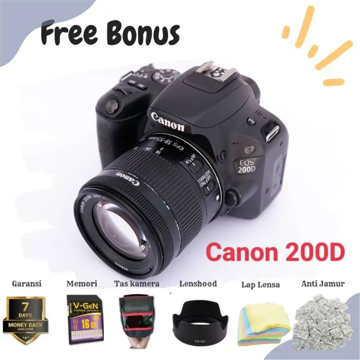 Kamera Canon EOS 200D Lensa Kit 18-55mm Sudah Wifi Layar Flip No Vignet Bergaransi Free Bonus