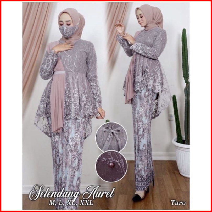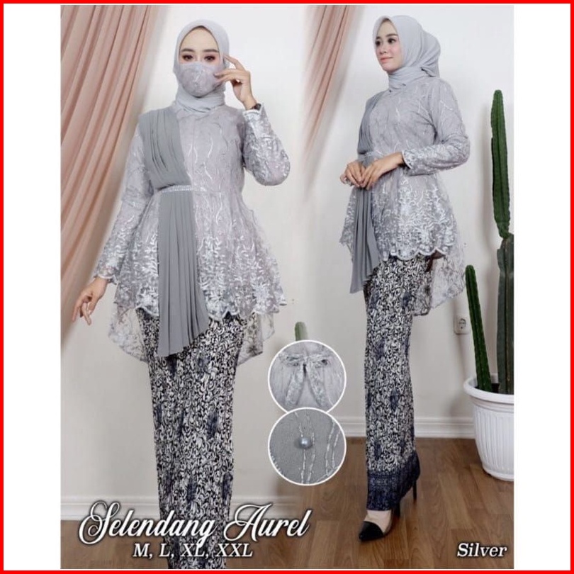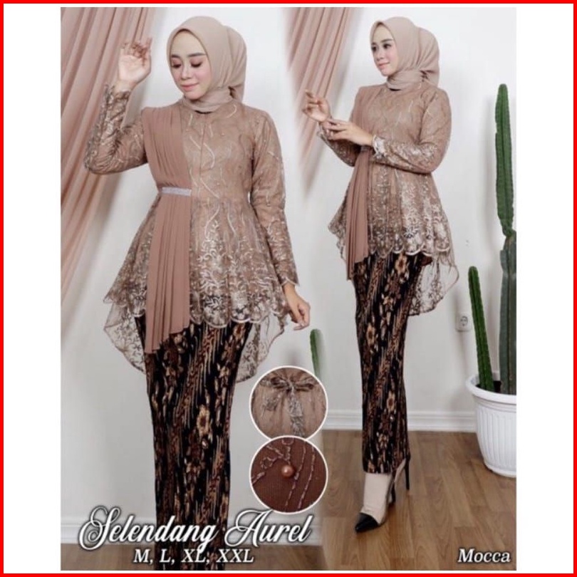 Setelan Baju Kebaya Modern Slendang Aurel Hijab Muslim Bahan Tille Untuk Wisuda Kondangan Mix Rok Plisket Batik Kekinian