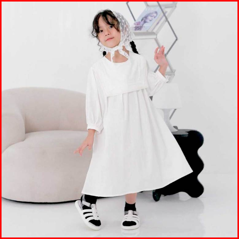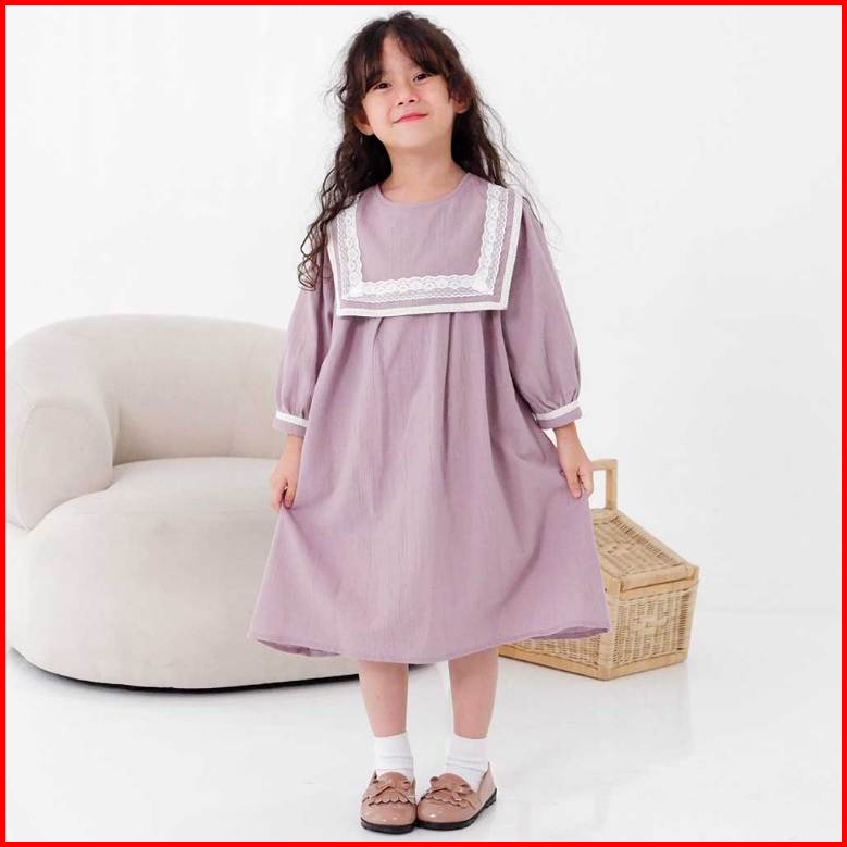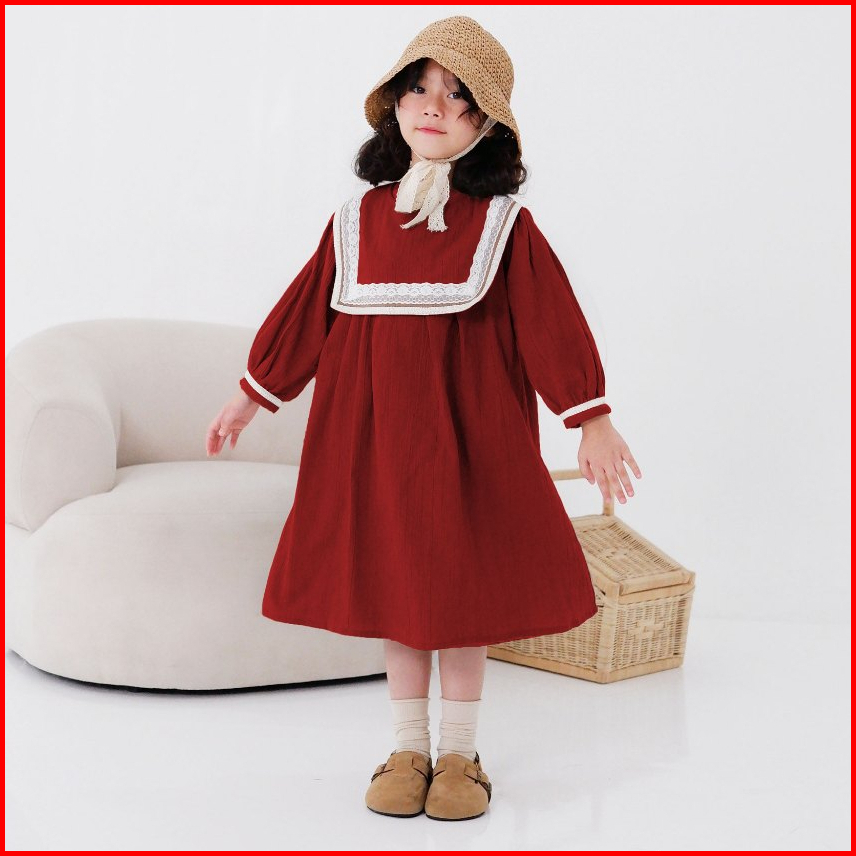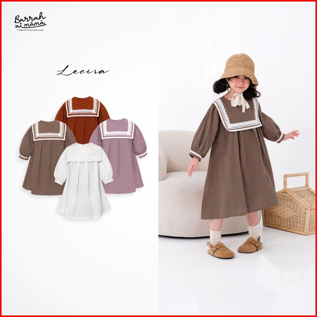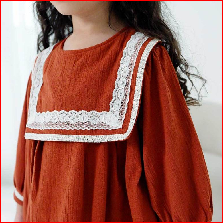 Barrahaimama - Dress Anak Perempuan Renda Brukat Vintage Lengan Panjang Bahan Katun Linen Polos