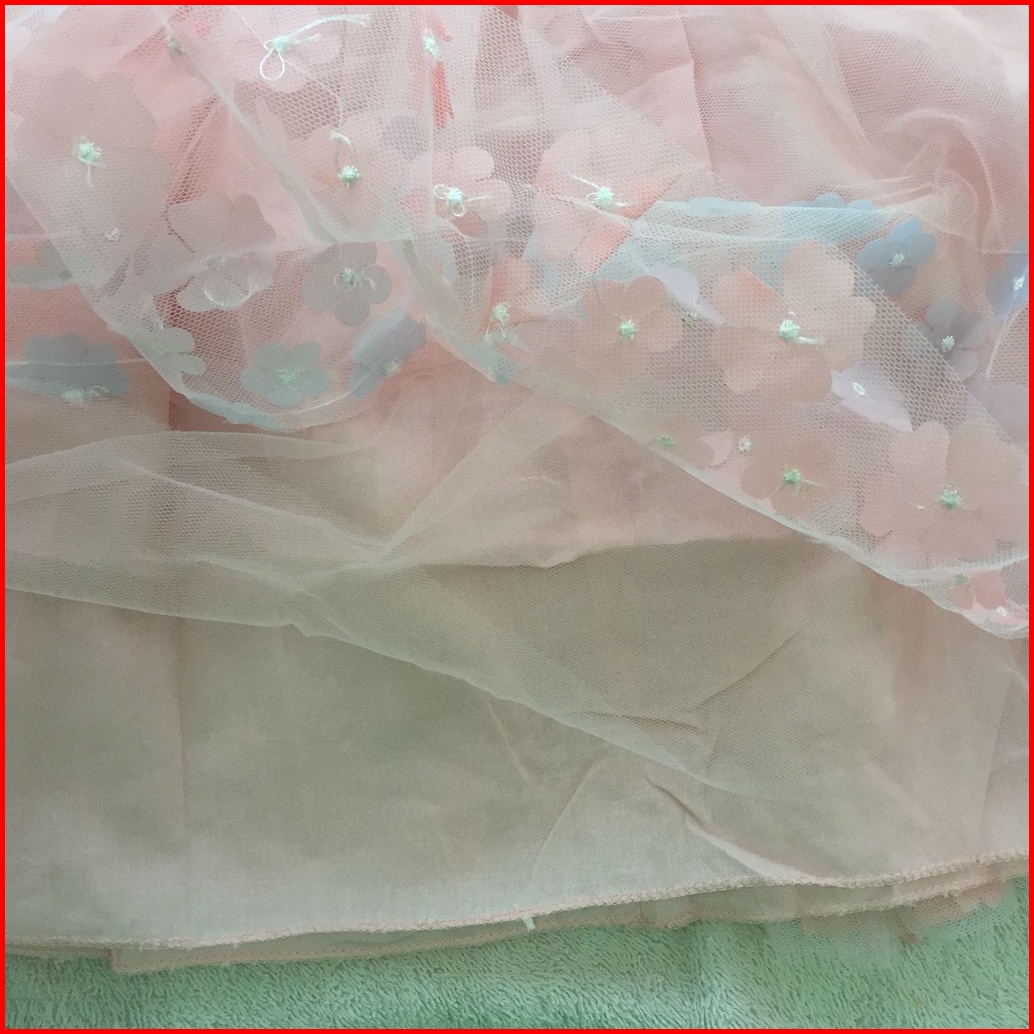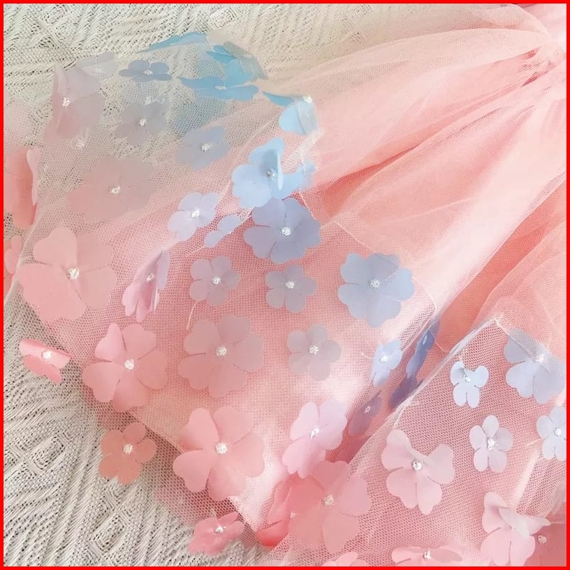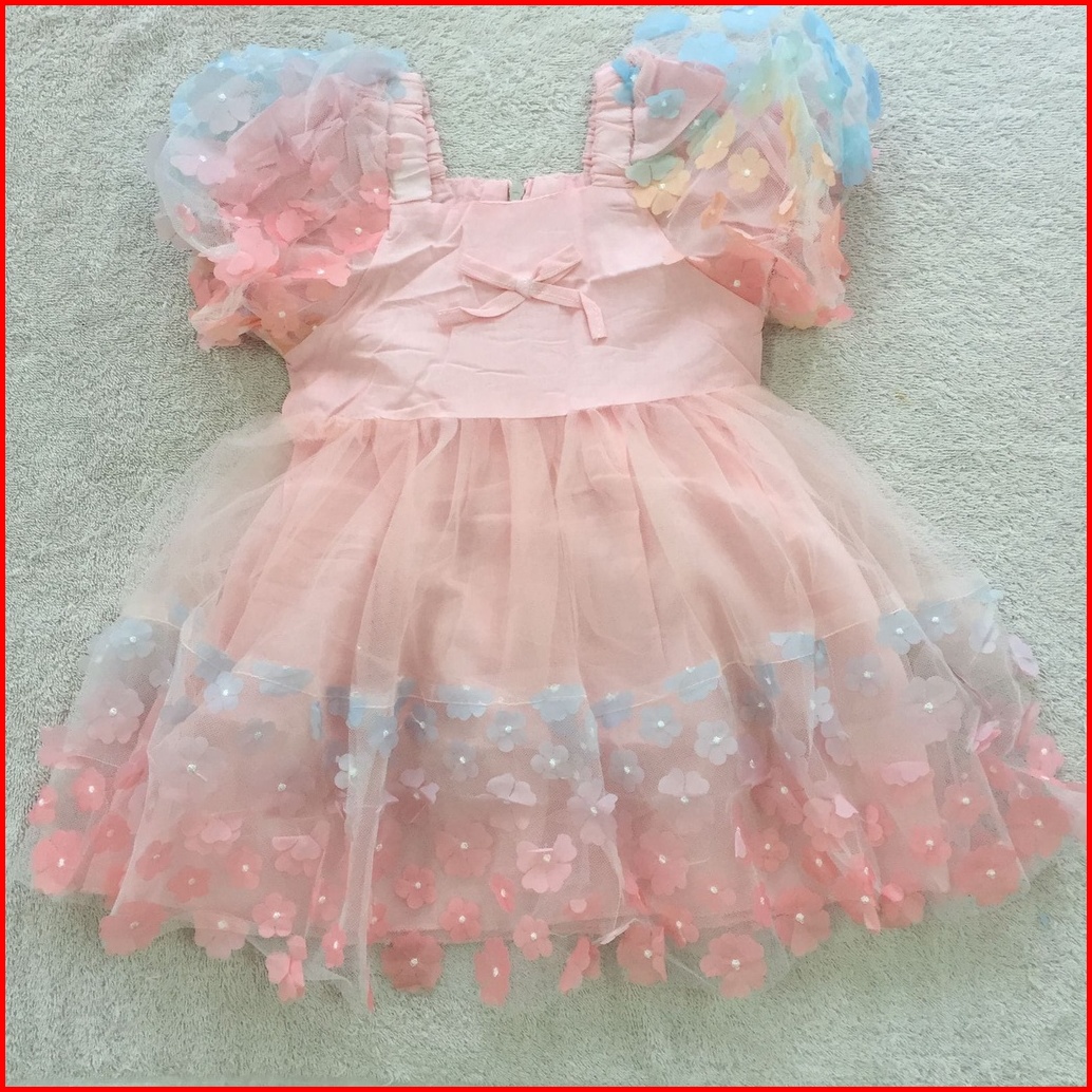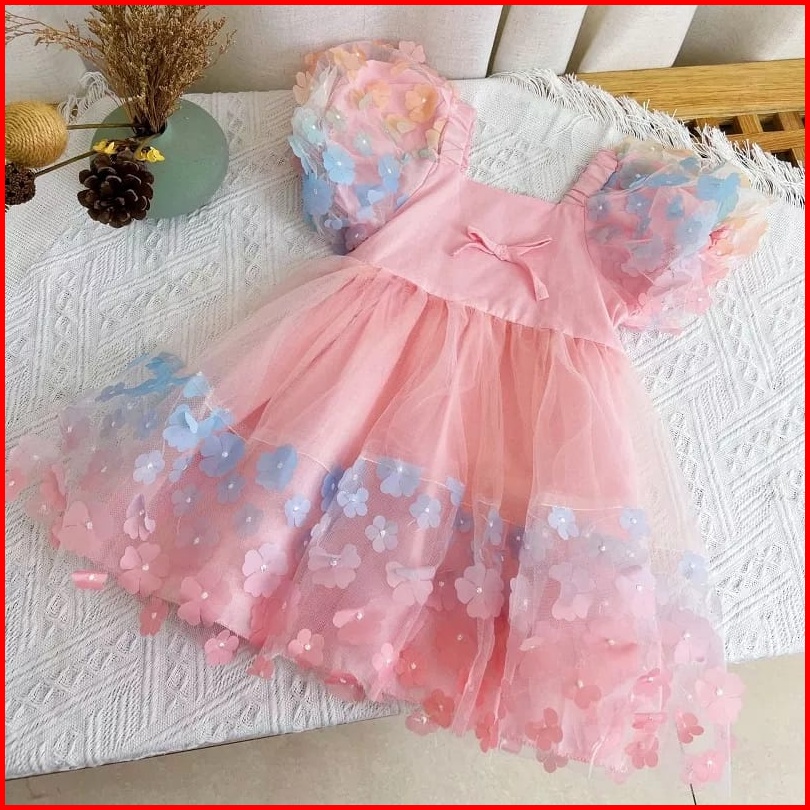 Dress Bunga 3d Pink Rainbow 1-7th Impor Lengan Puff Gaun Pesta Anak Merah Muda
