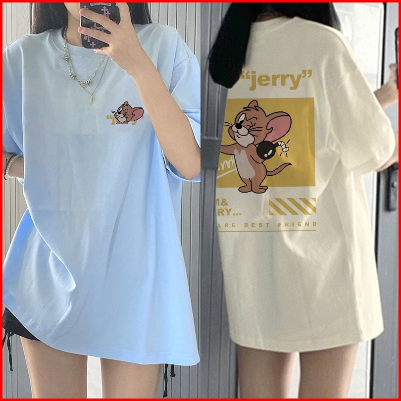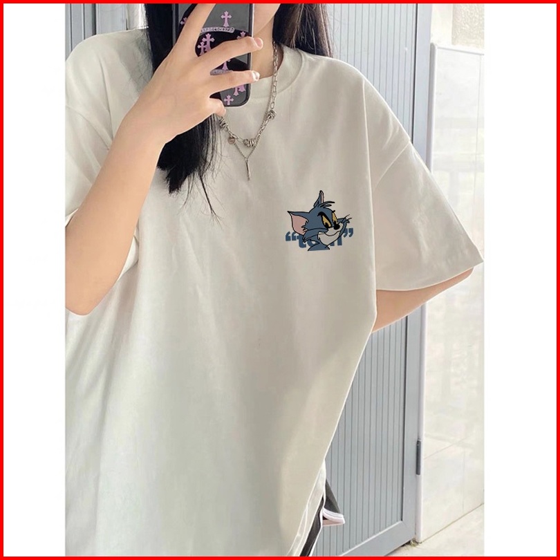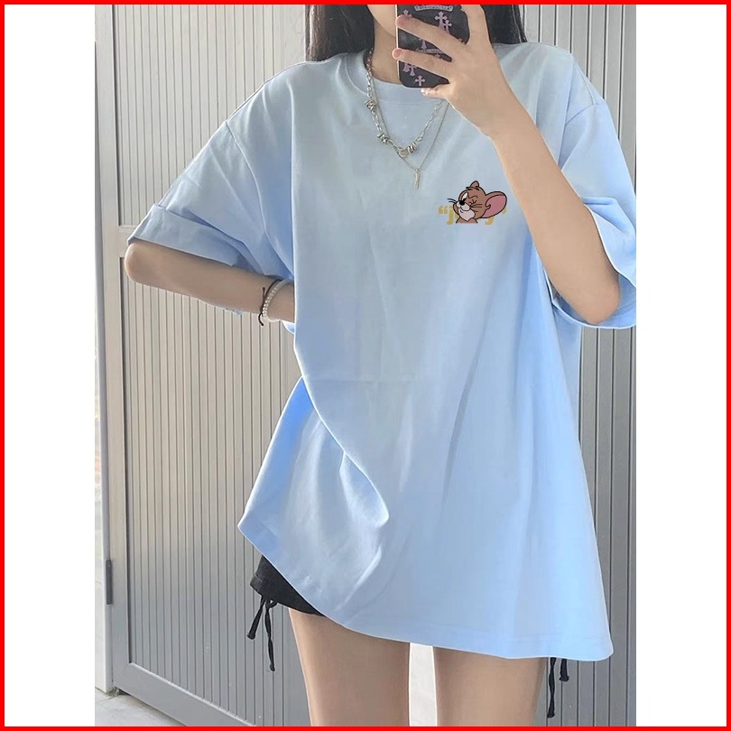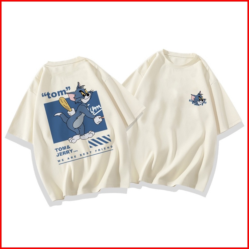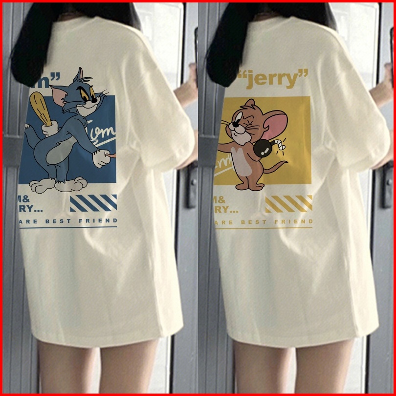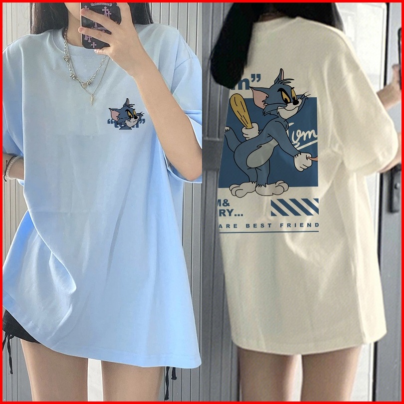 Kaos Lengan Pendek Oversize Wanita Tom And Jerry Reconciliation Baju Atasan Wanita Terbaru Krim Dan Biru Muda Korean Sty