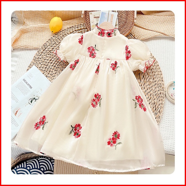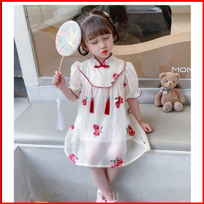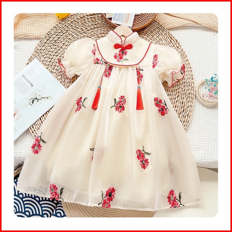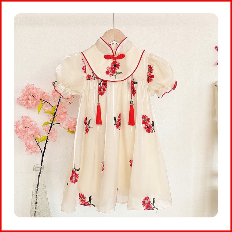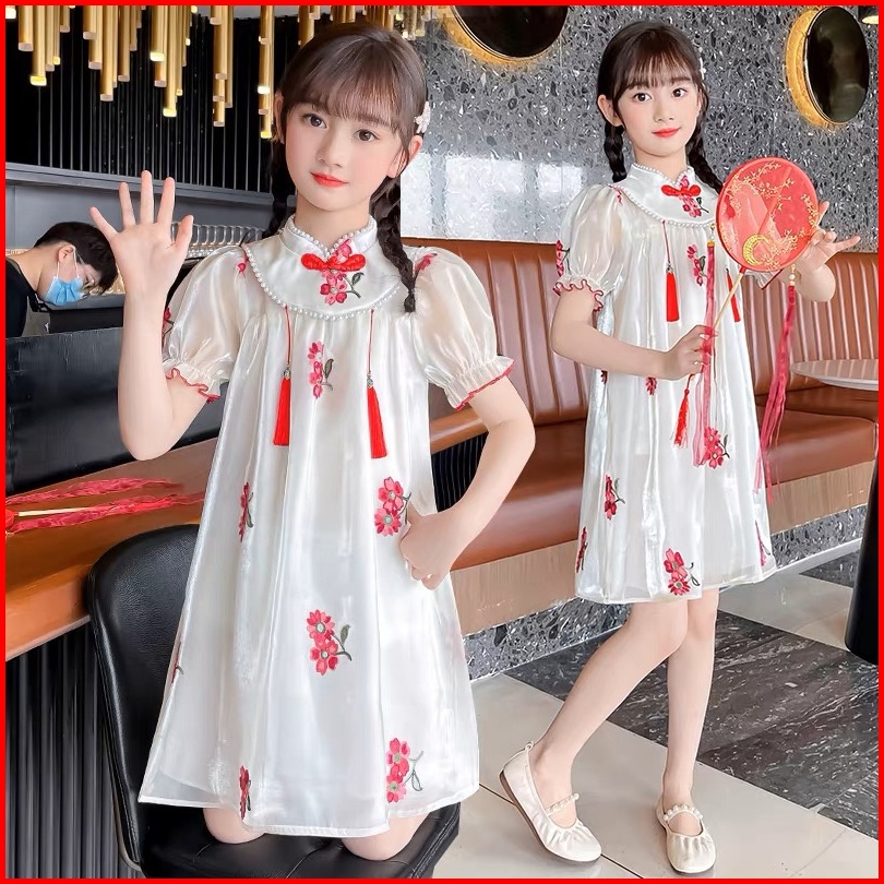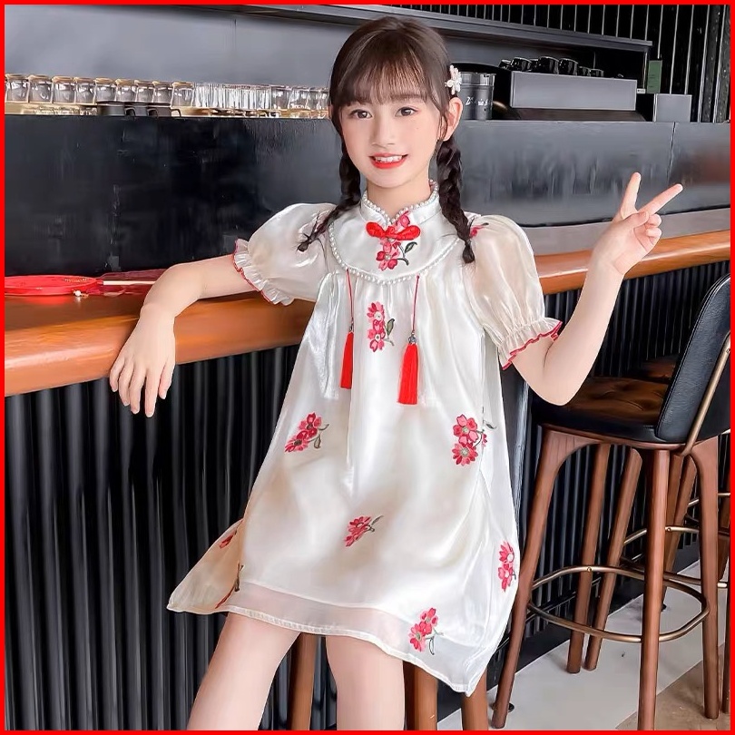 Kidsfashionkoleksi Dress Anak Perempuan Cheonsam Satin Merah Cream Mutiara Impor Premium