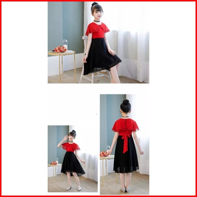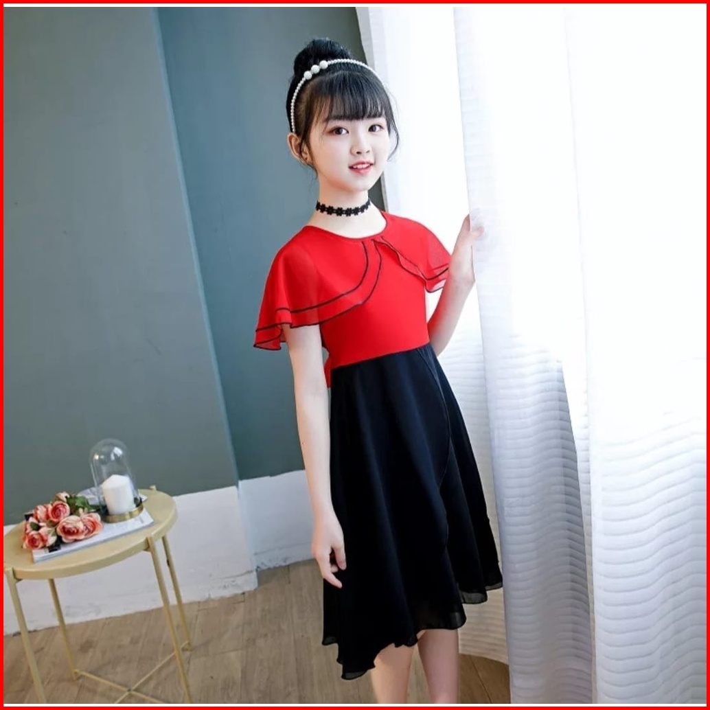 Inv - Dress Kids Sms 615 Red Black Terbaru Korea Bangkok Umur 5 Sampai 12 Tahun