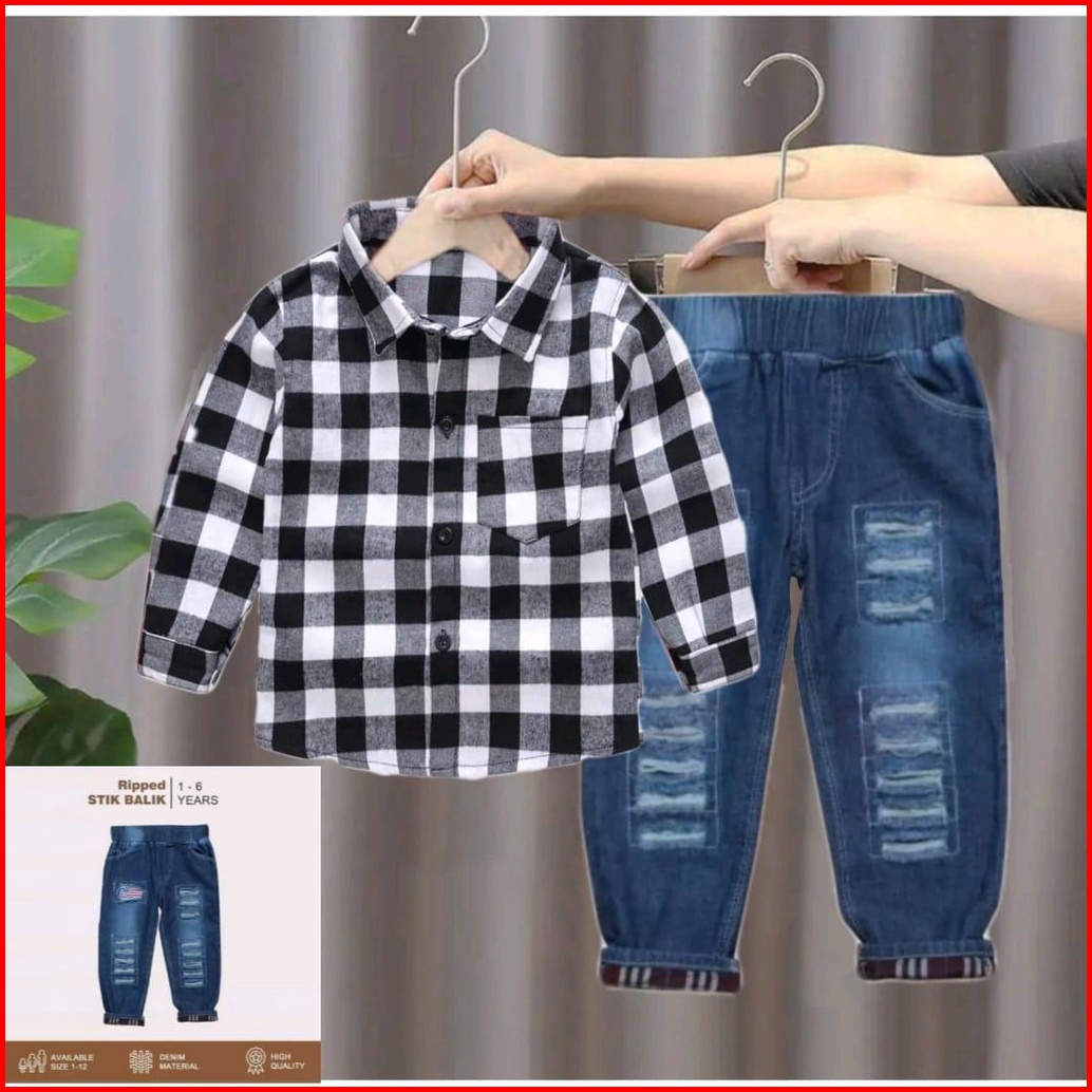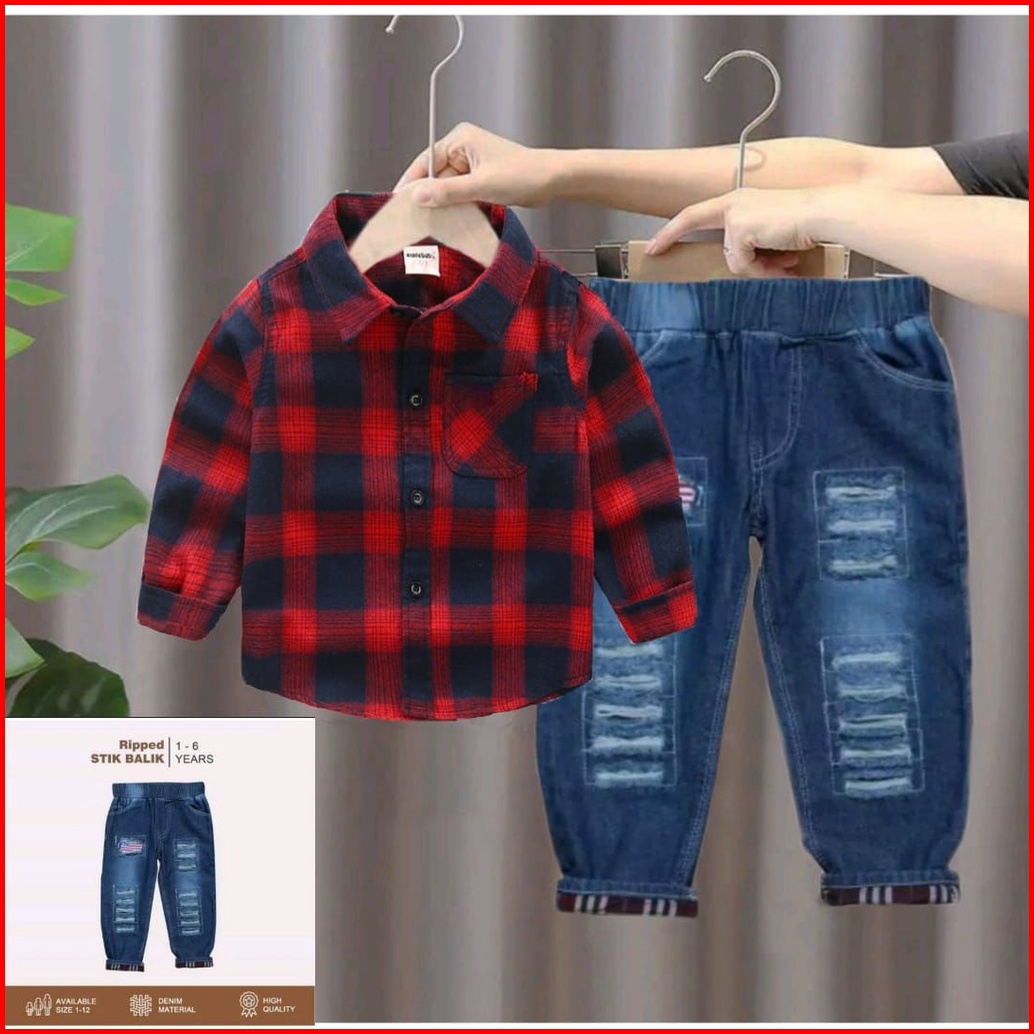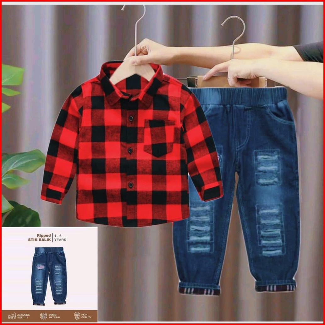 Setelan Kemeja Flanel Anak Dan Jeans Stik Balik Anak Laki Laki 1-7 Tahun Terlaris Setelan Kemeja Dan Levis Panjang Anak
