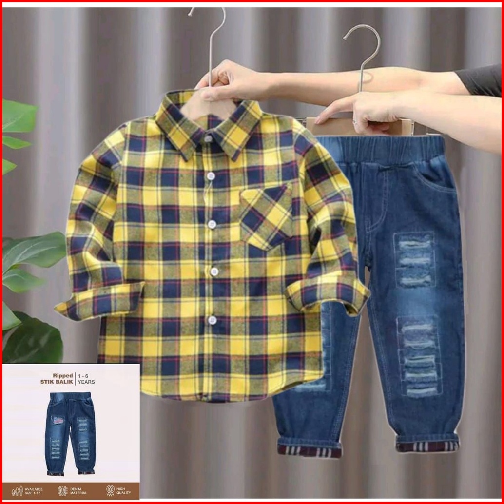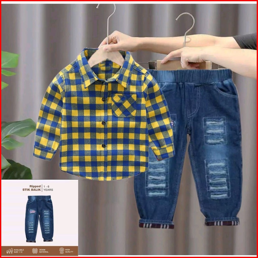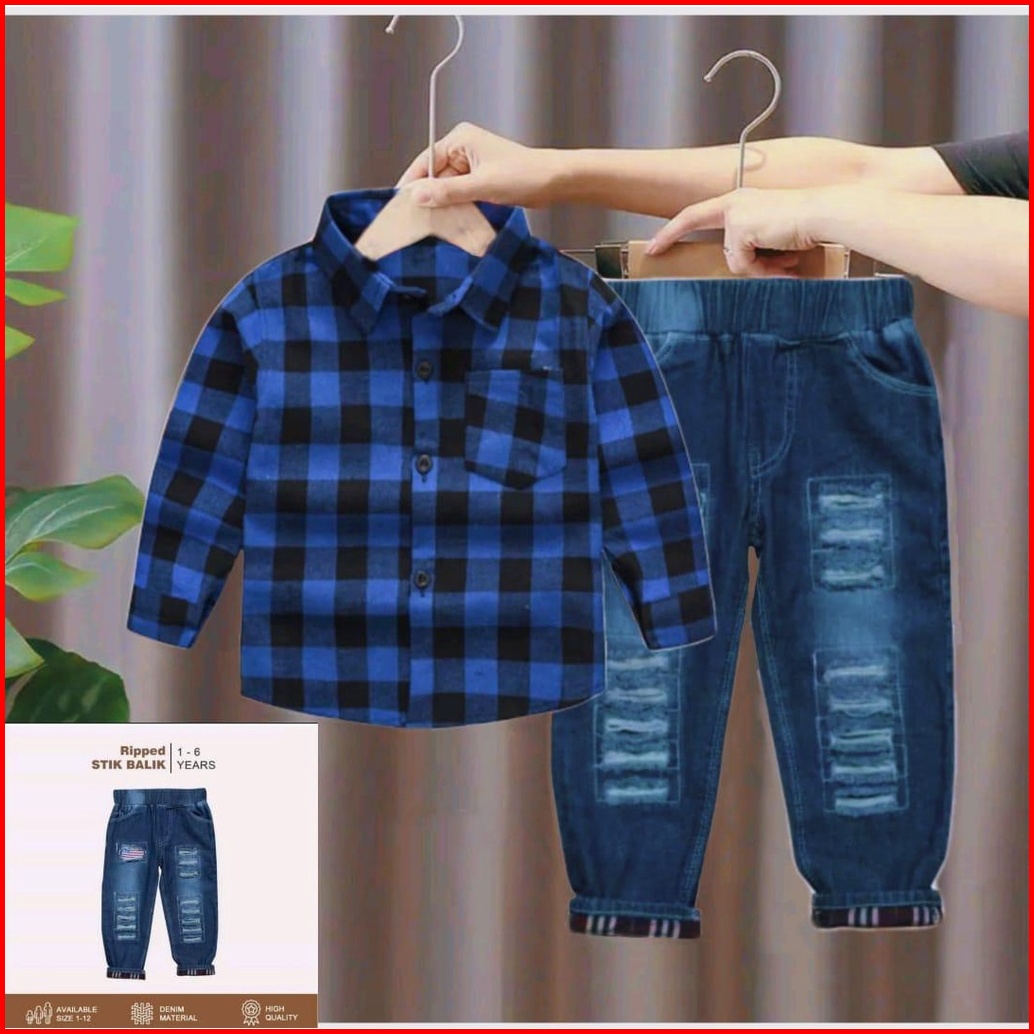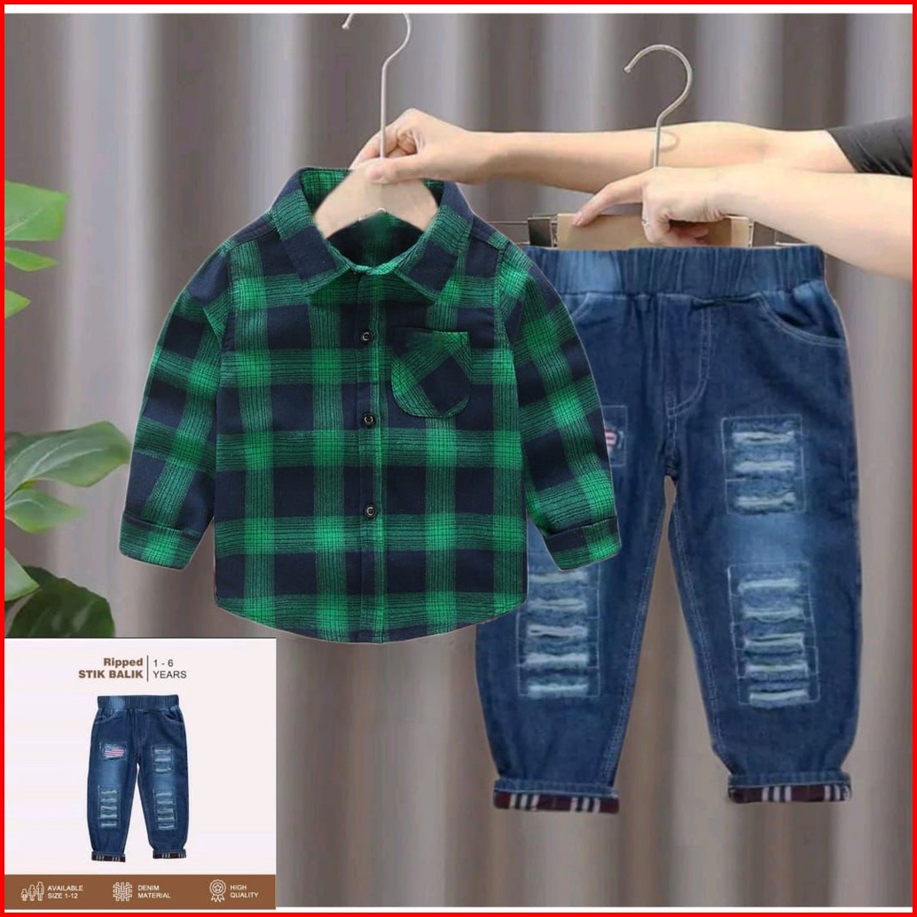 Setelan Kemeja Flanel Anak Dan Jeans Stik Balik Anak Laki Laki 1-7 Tahun Terlaris Setelan Kemeja Dan Levis Panjang Anak