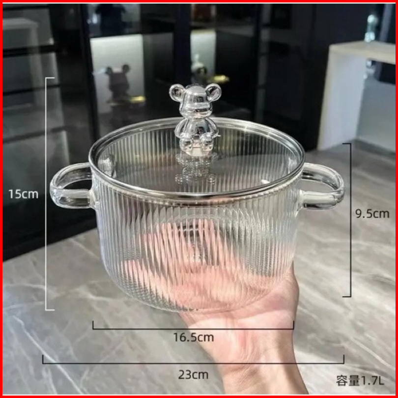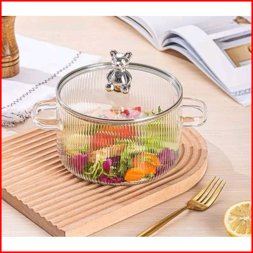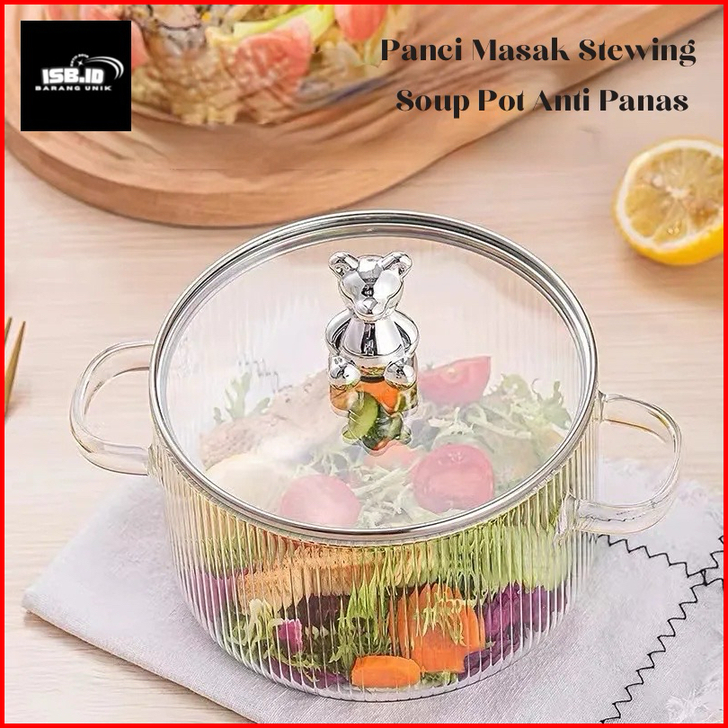 Panci Masak Kaca Tahan Panas Stewing Soup Pot Borosilicate Glass Tutup Beruang