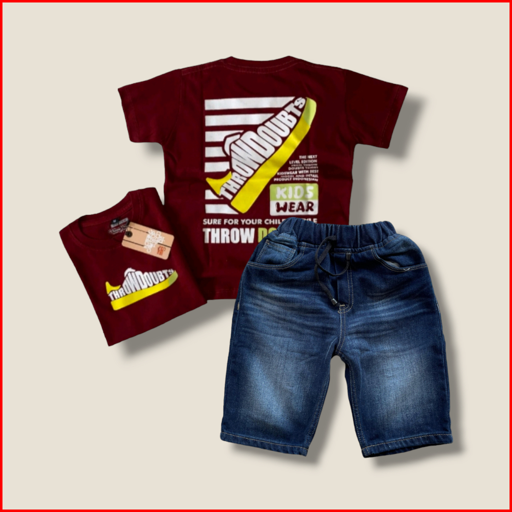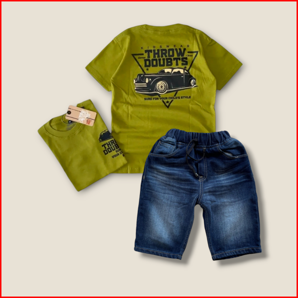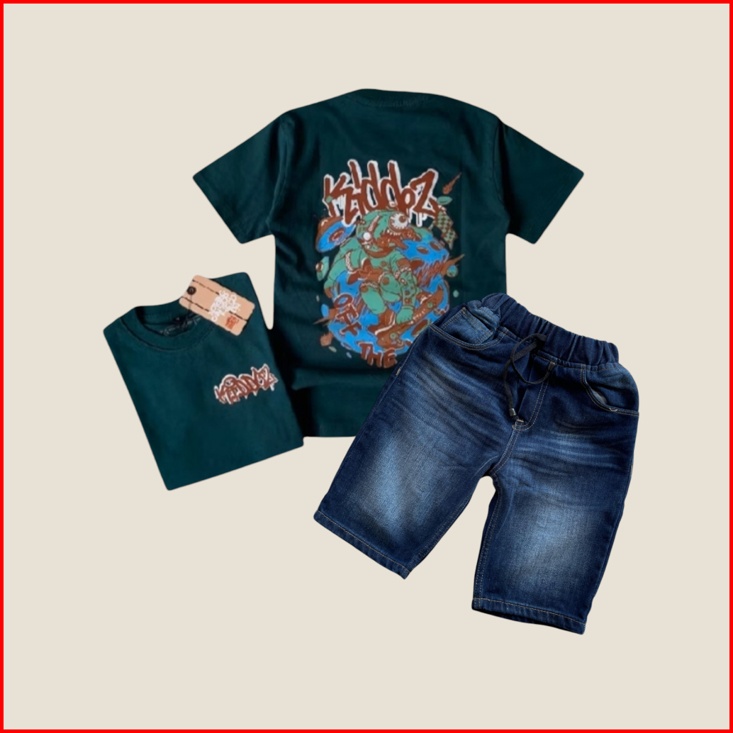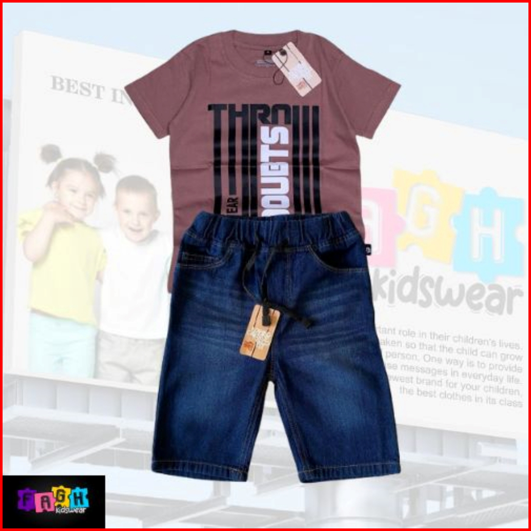 Setelan Jeans Pendek Motif Slim Anak Laki-laki Dan Baju Kaos Distro Bahan Cotton
