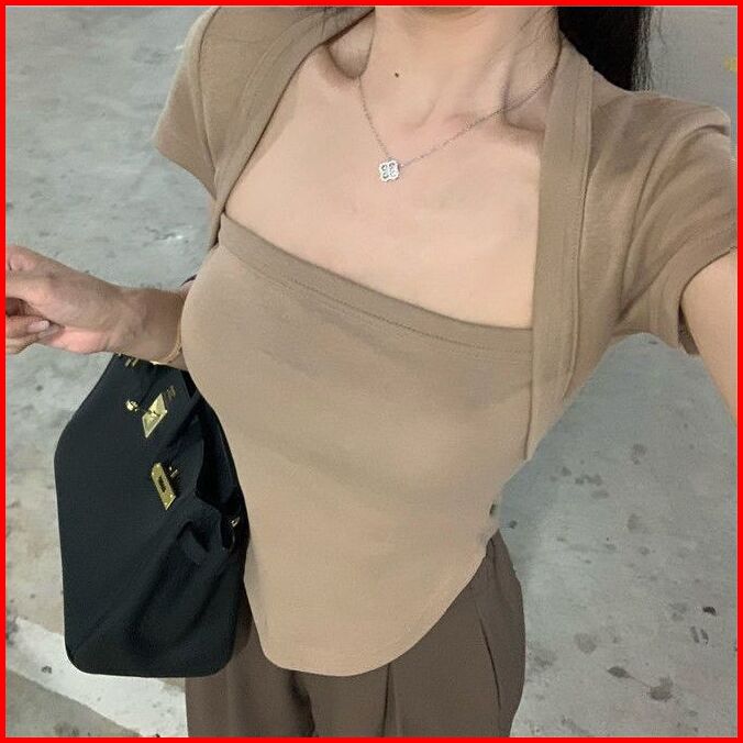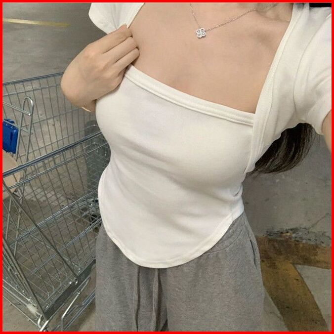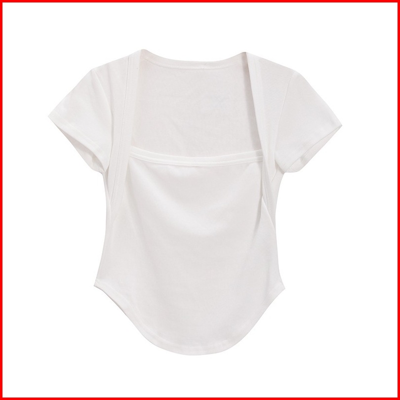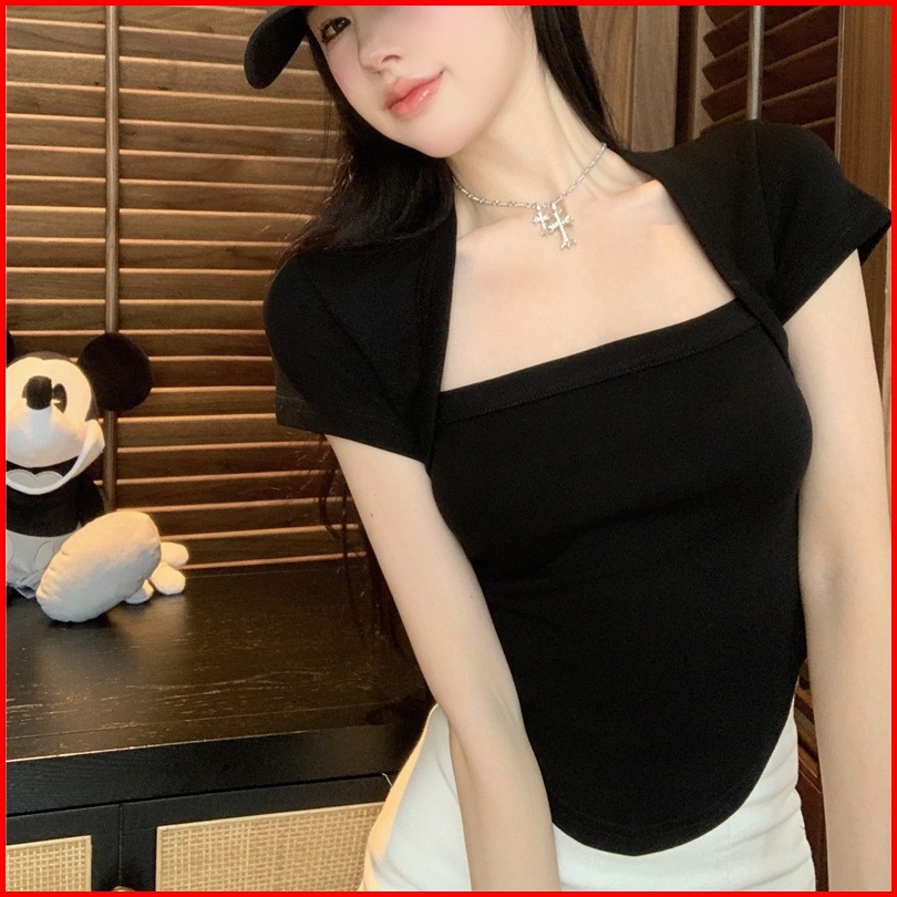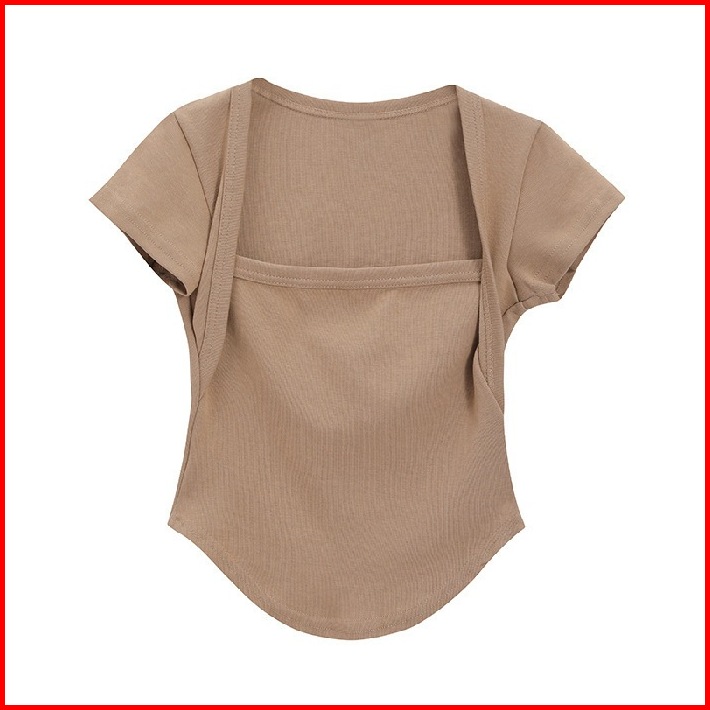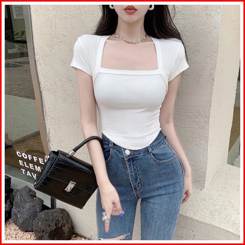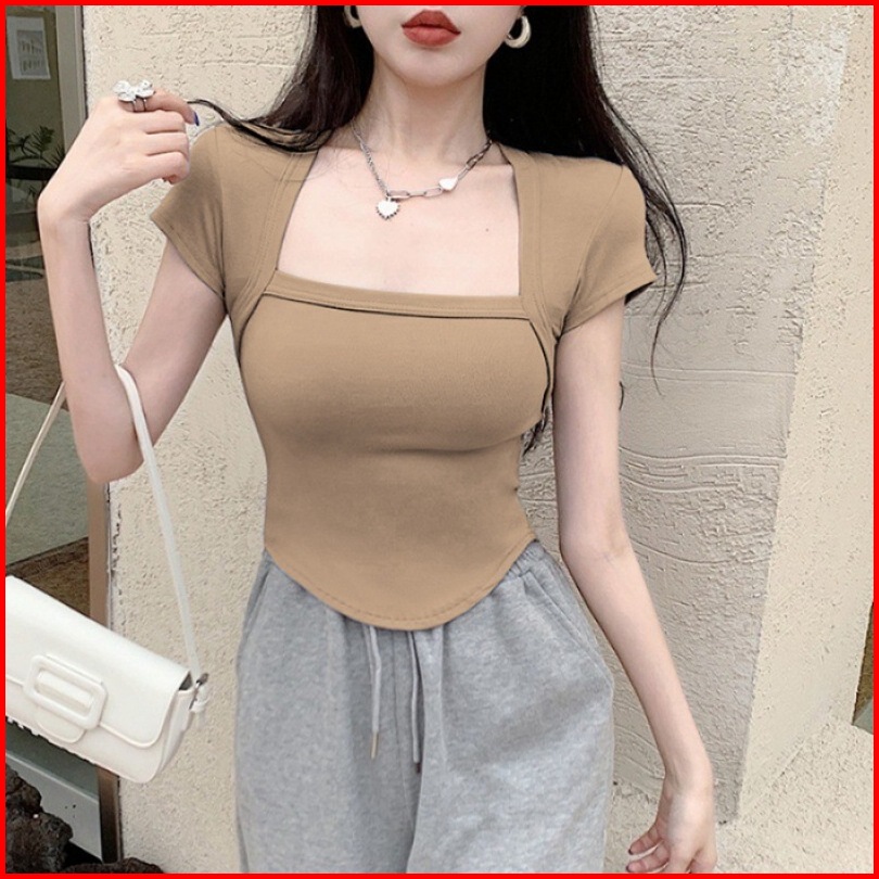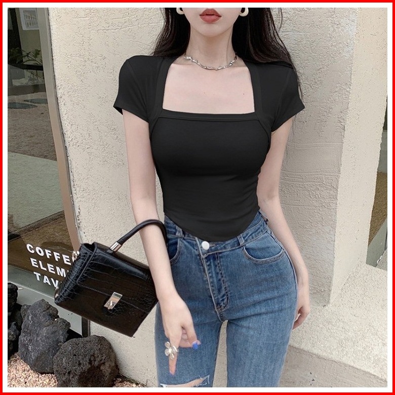 Sm Bj1501 Baju Atasan Kaos Crop Top Spandex Korean Wanita Sexy Lengan Pendek Square Sleeve Croptop Fashion