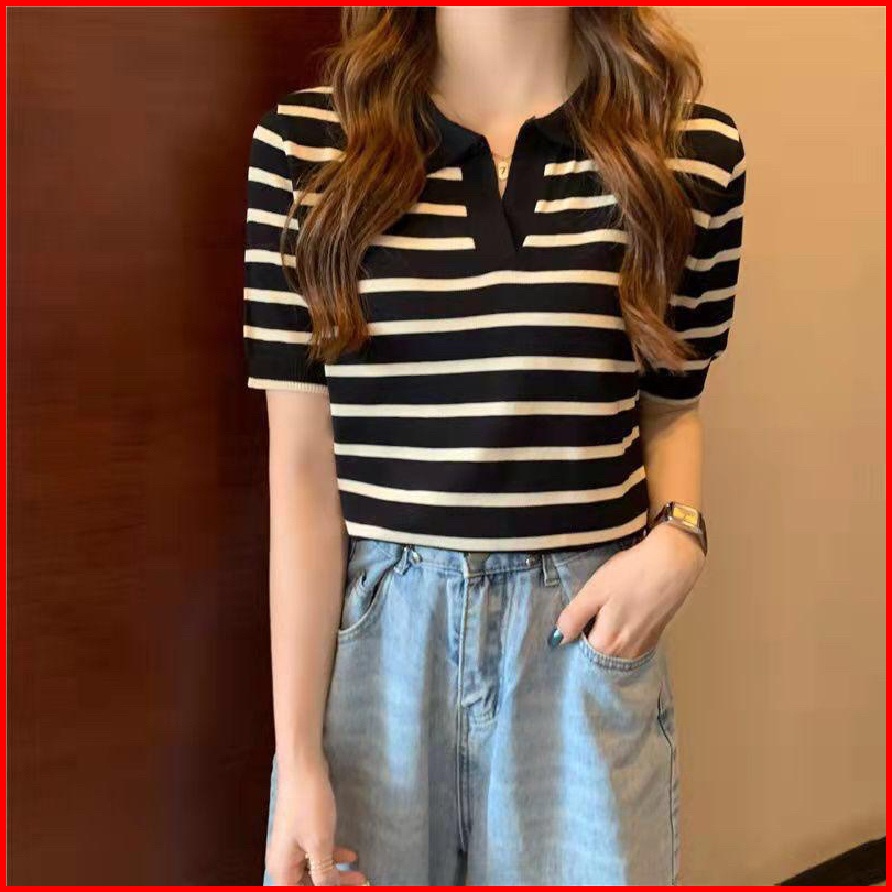 Kaos Berkerah Polo Salur - Atasan Rajut Lengan Pendek Korean Style Knit Stripe T-shirt
