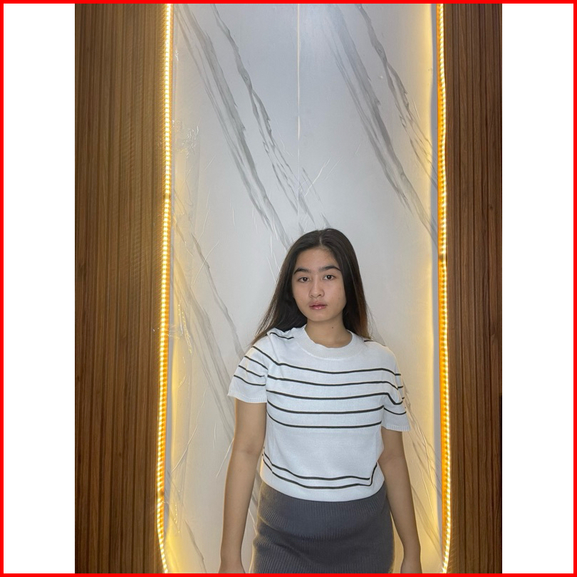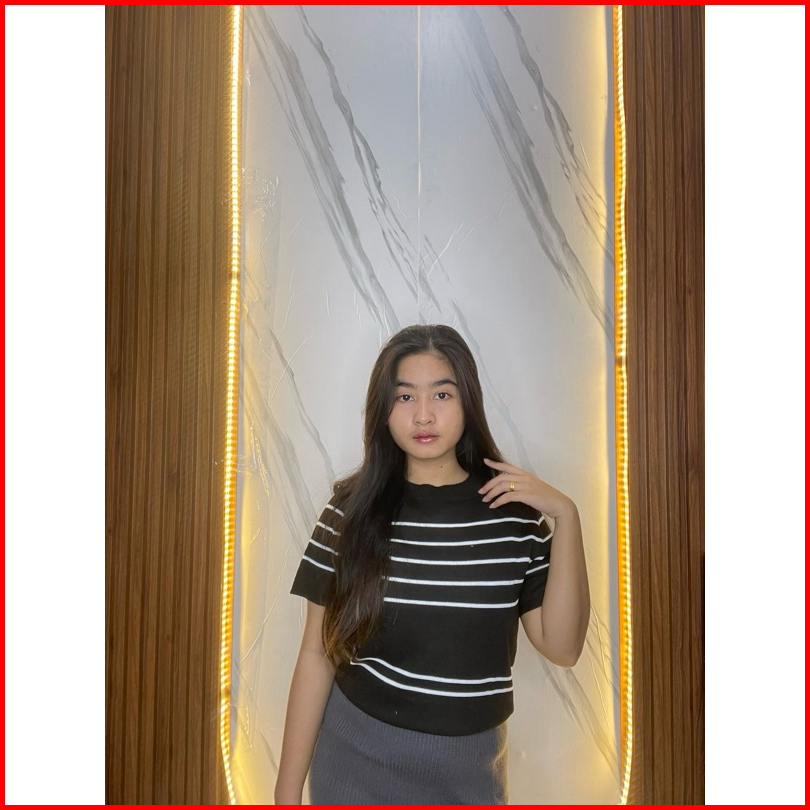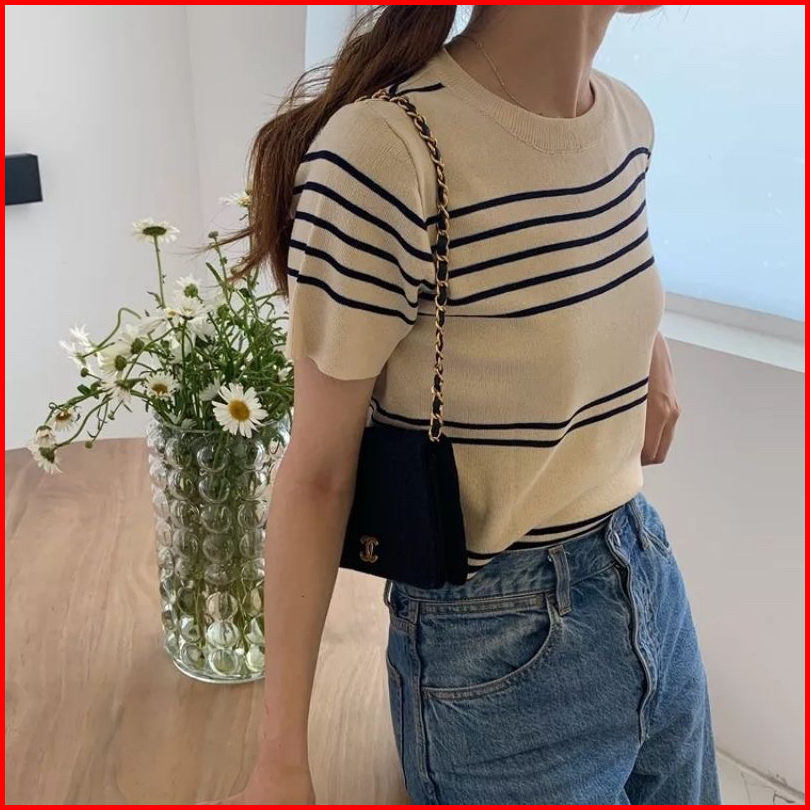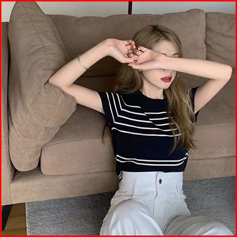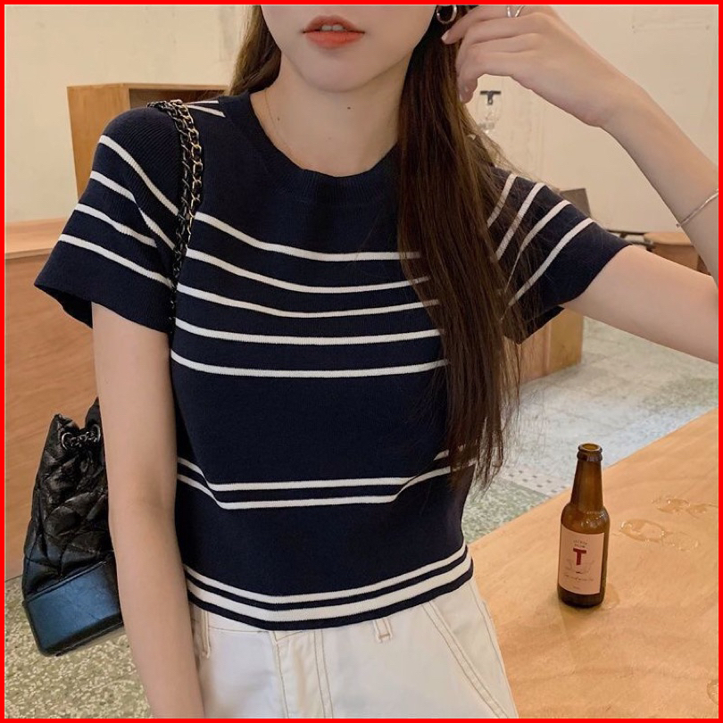 Kaos Lengan Pendek Wanita Atasan Rajut Korean Style Knit Crop Top Stripe T-shirt