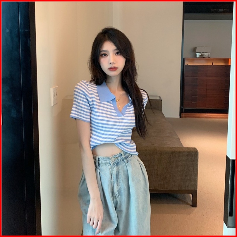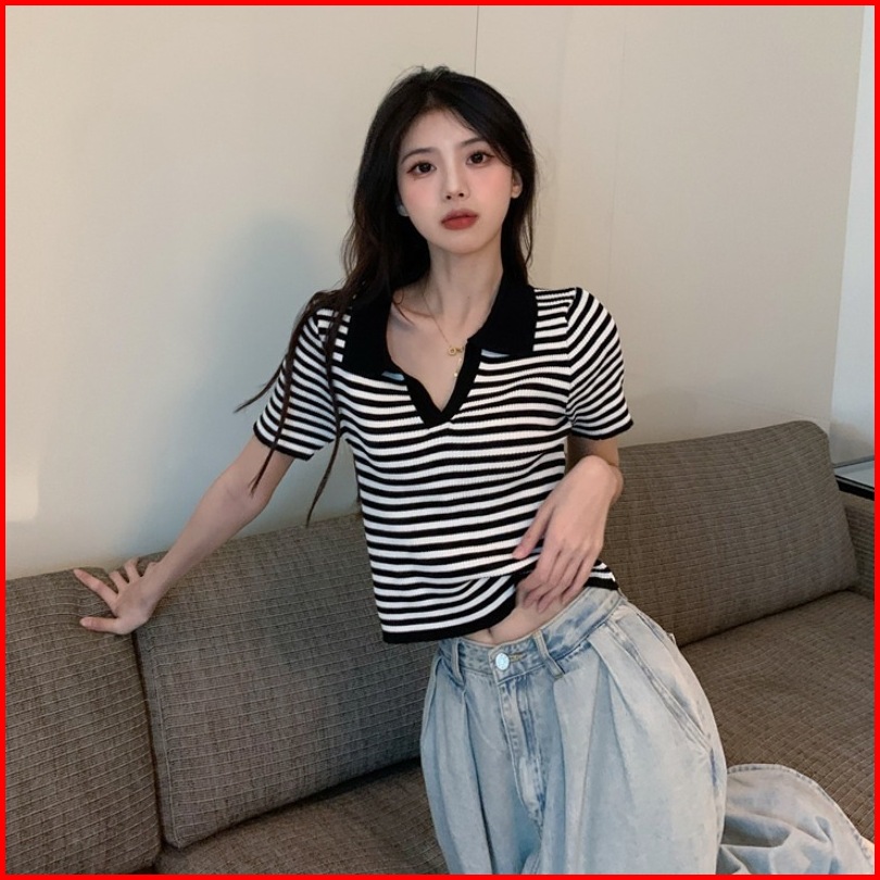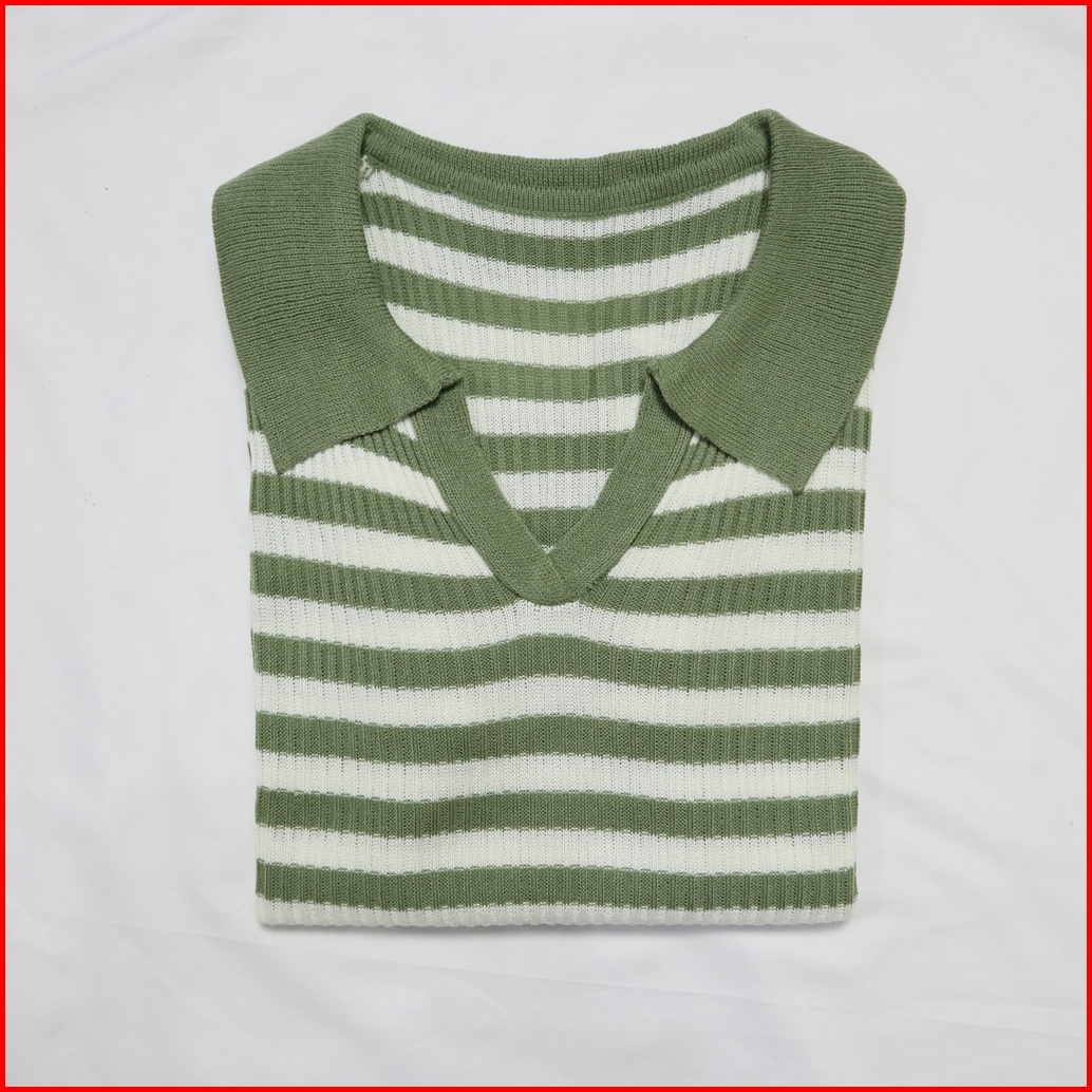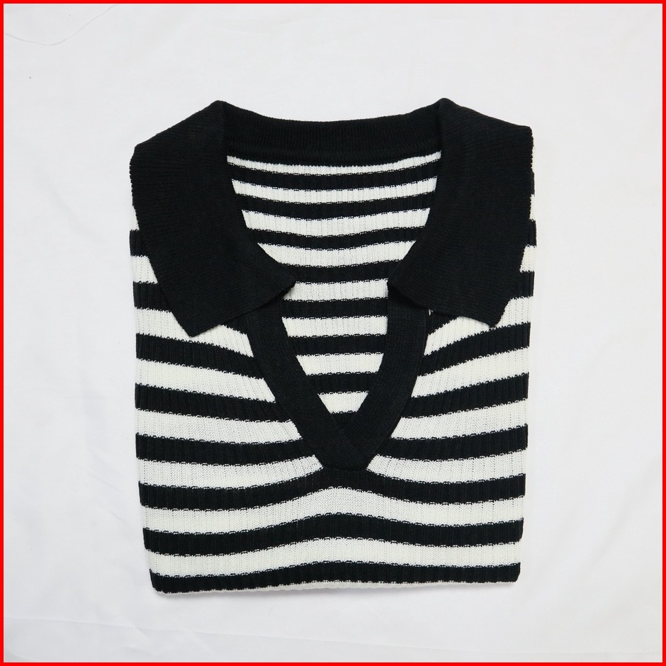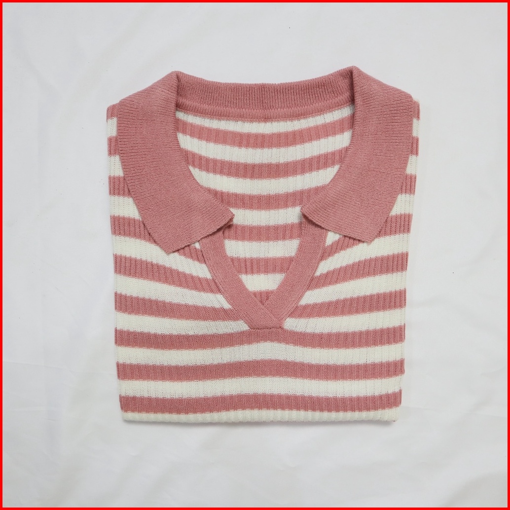 Atasan Kerah Salur Polo Kaus Rajut Wanita Korean Vneck Blouse