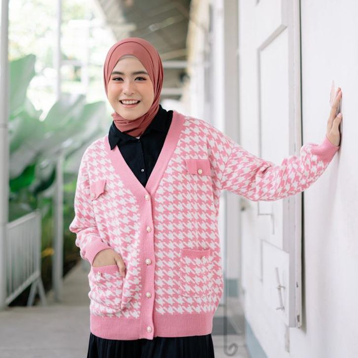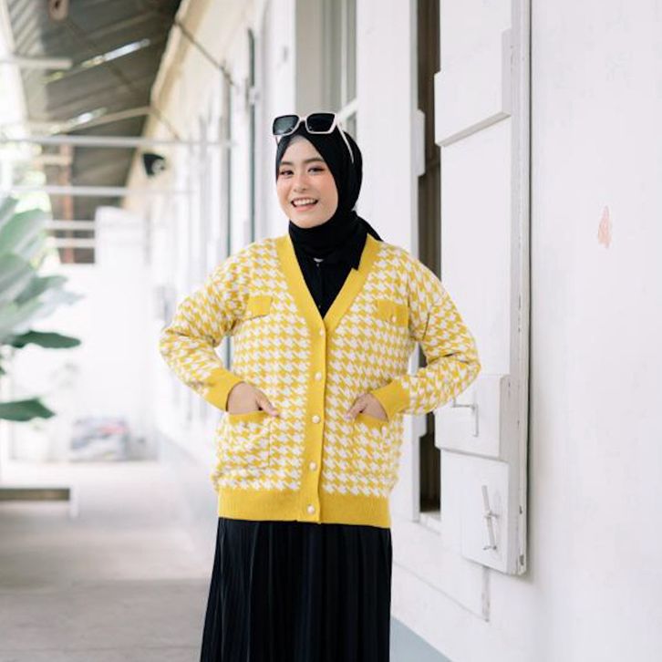FAFOUR Alyssa Cardigan Rajut Wanita Saku Houndstooth Knitwear TOP PRODUCT