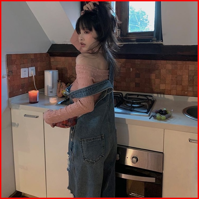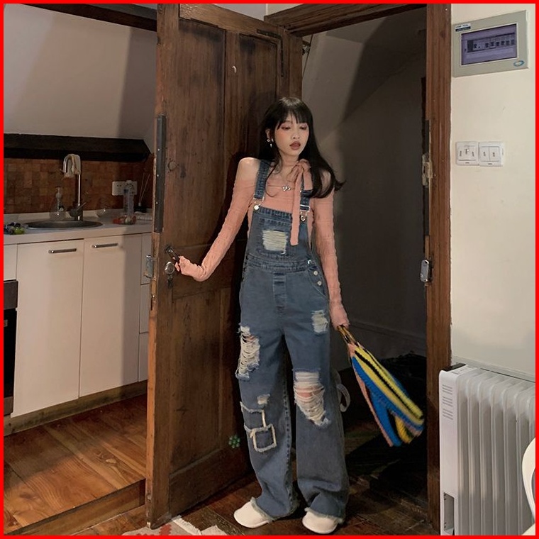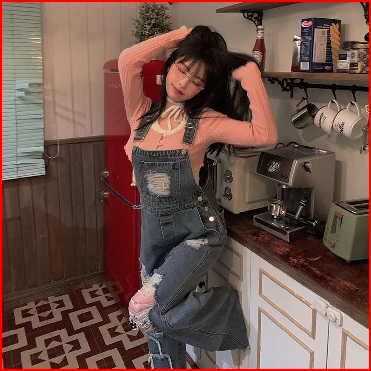 Retro Overall Denim Robek Wanita Pinggang Tinggi Retro Mengepel Celana Lebar Kaki