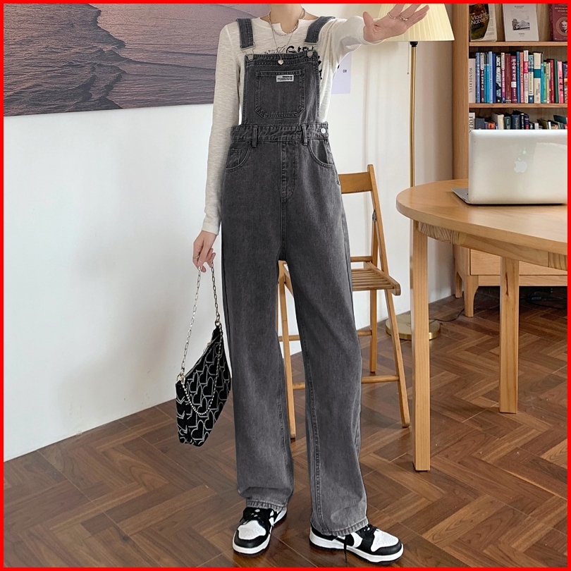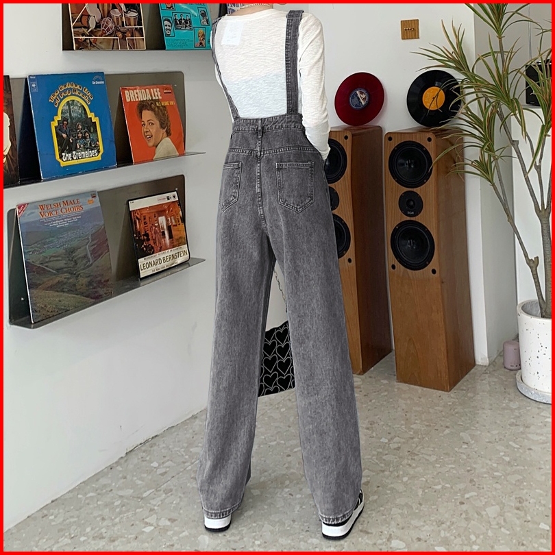 Abu Abu Overall Kaki Lebar Longgar Pinggang Tinggi Gaya Korea Wanita---celana Kodok Jeans Wanita