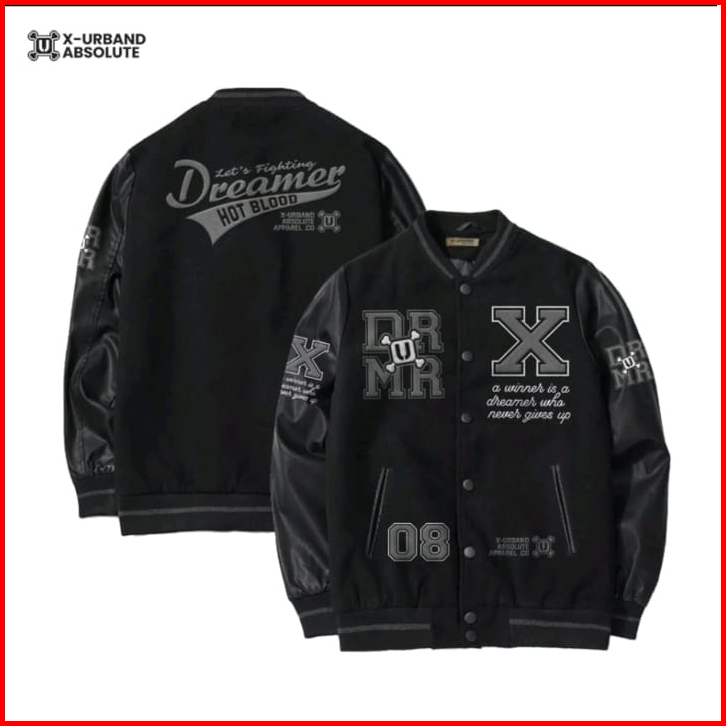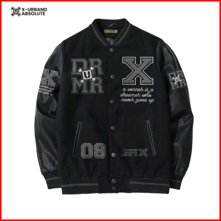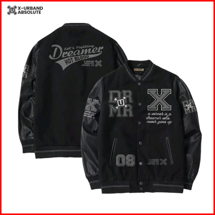 Jaket Varsity Kombinasi Tangan Kulit Leader Motif Bordir Atasan Basebal Unisex Casual Pria Dan Wanita
