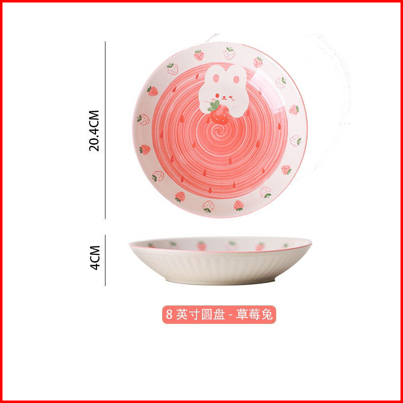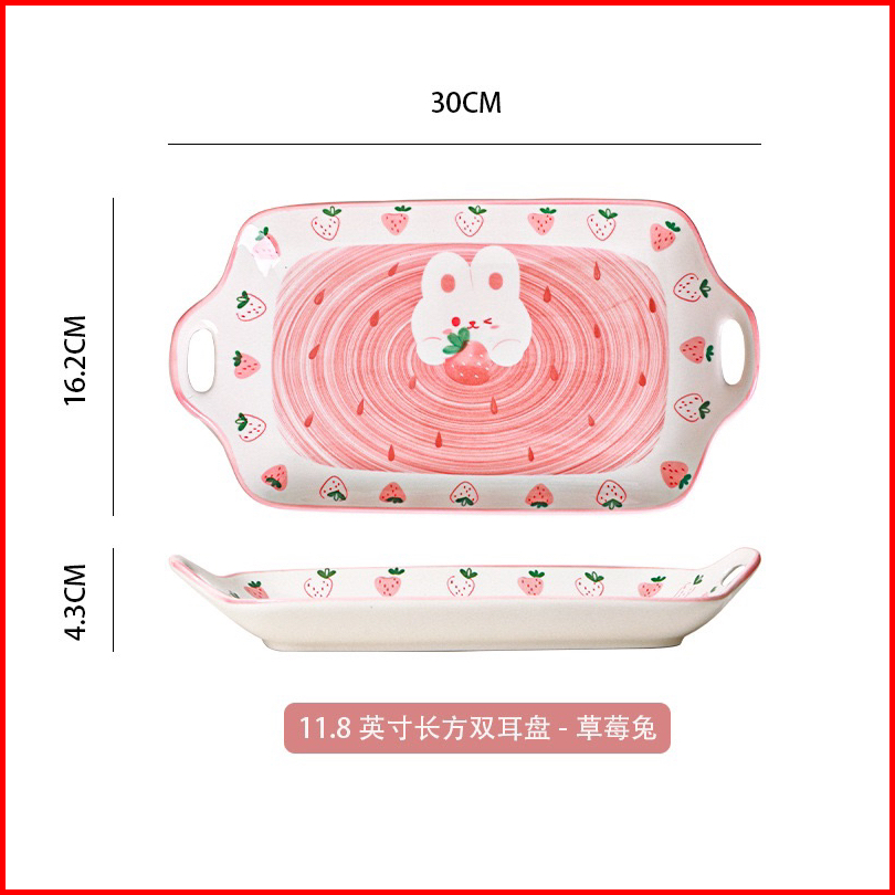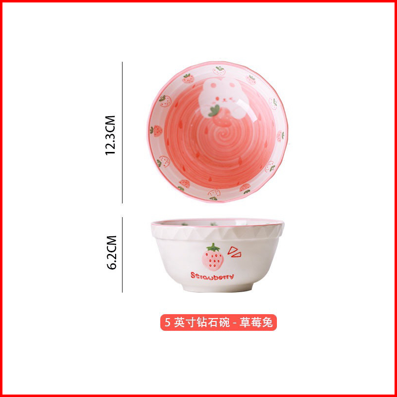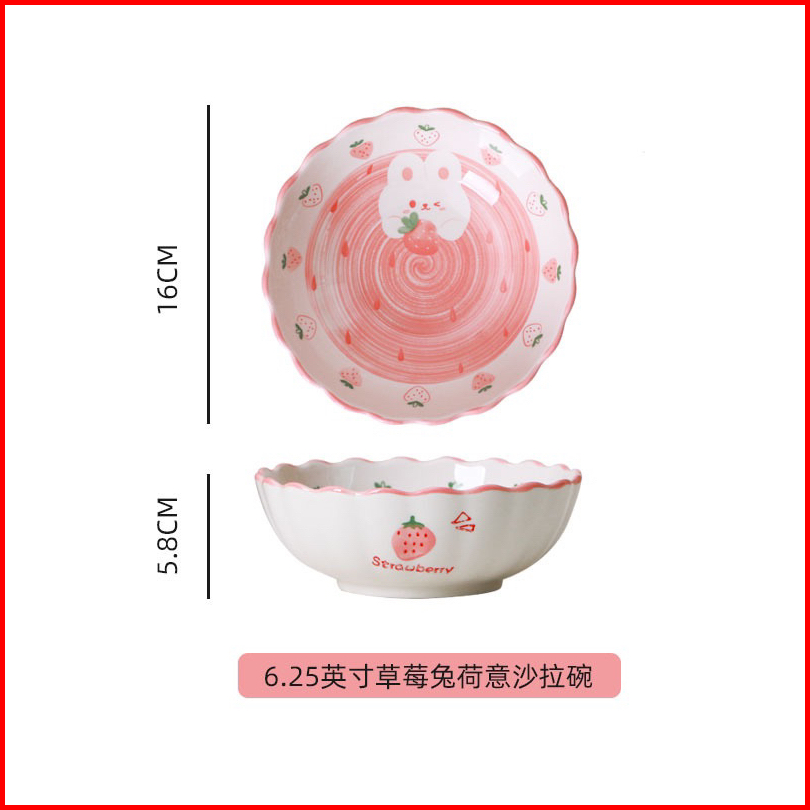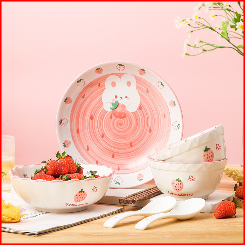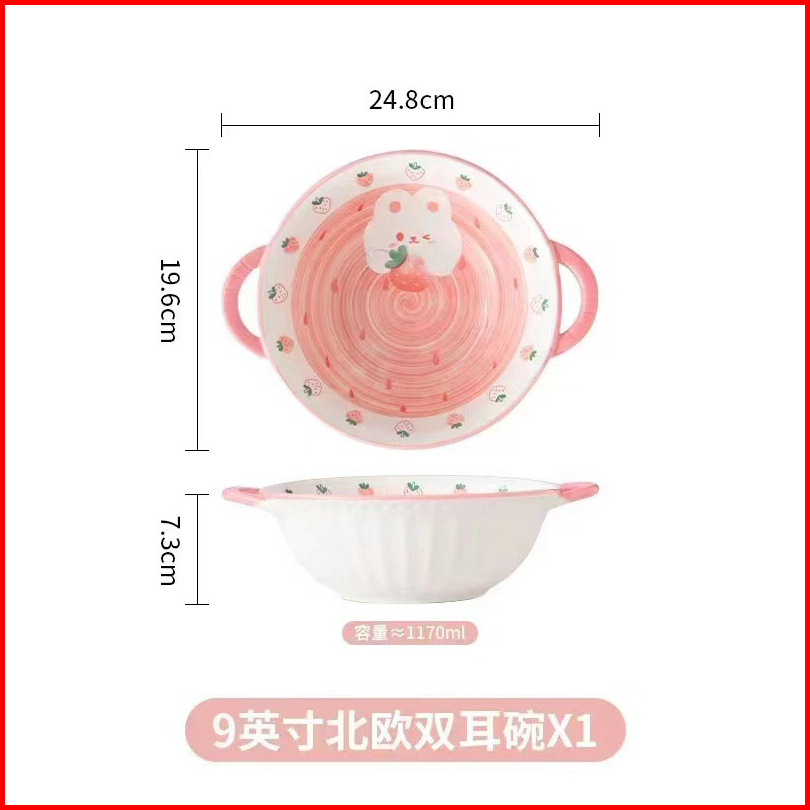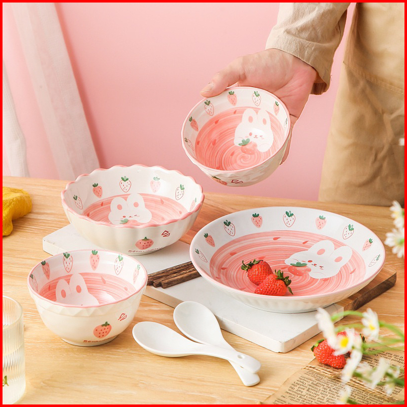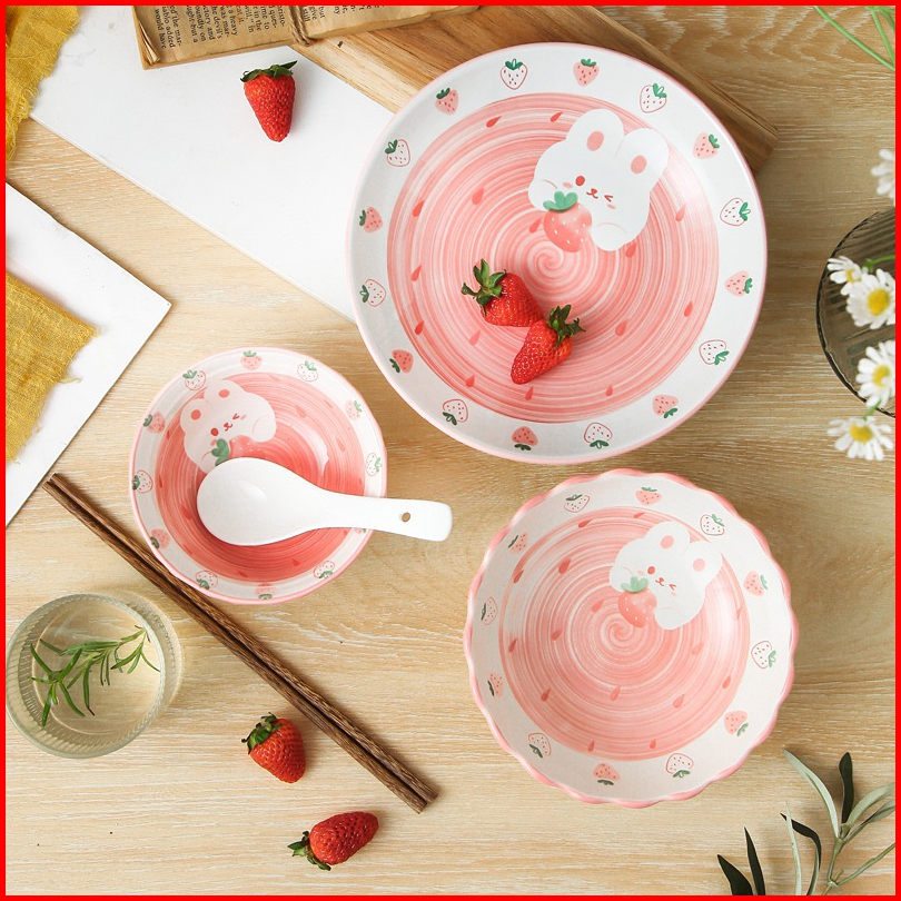 Piring Mangkok Keramik Kelinci Bunny Strawberry Pink Ala Korea
