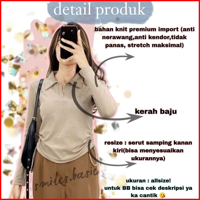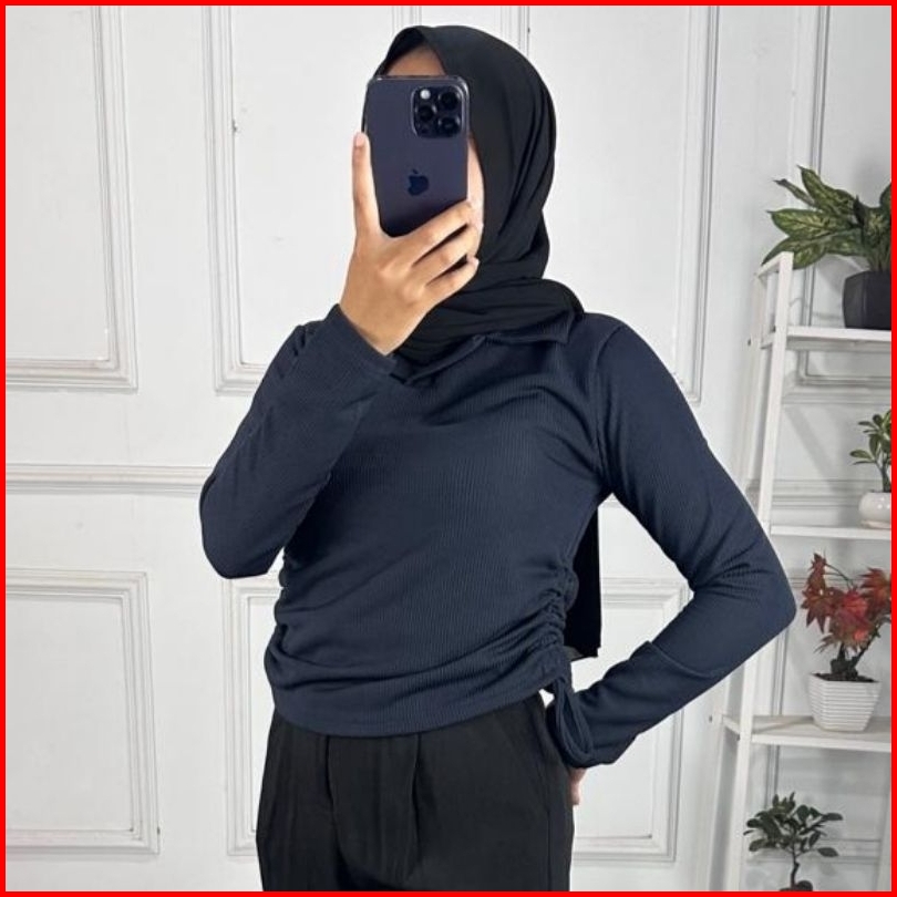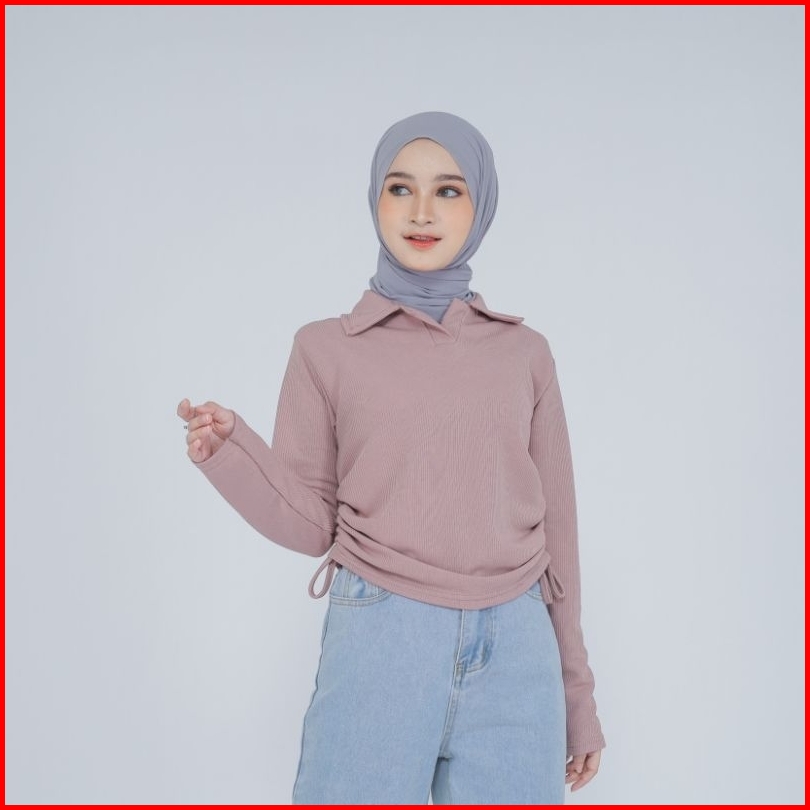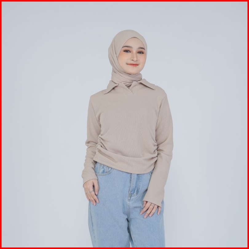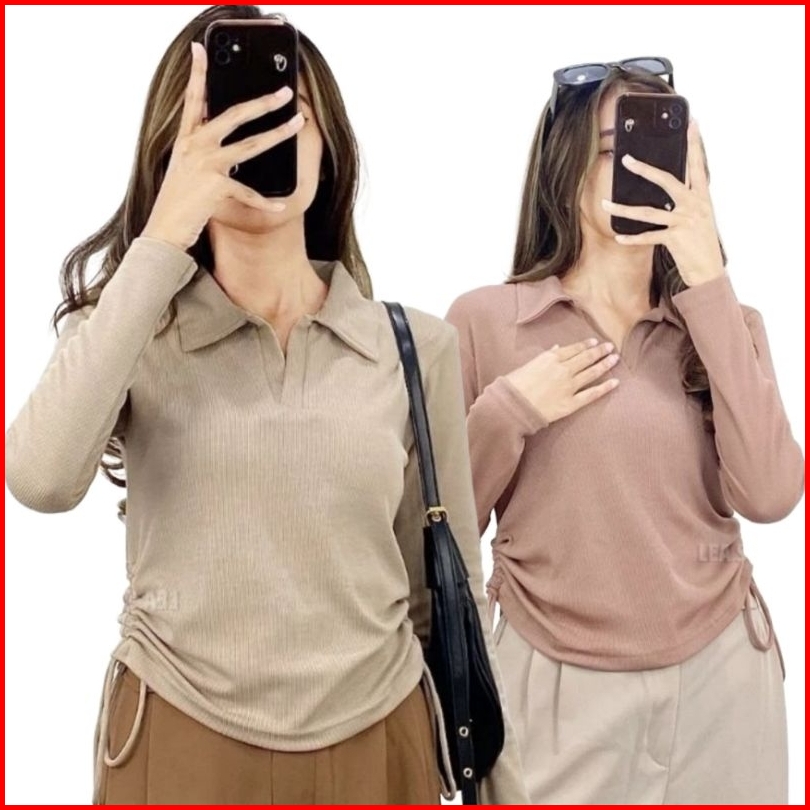 Polo Basic Top Blouse Knit Wanita Premium Lengan Panjang Serut Samping Atasan Cewek Kerah Kekinian Korean Style Smiles B