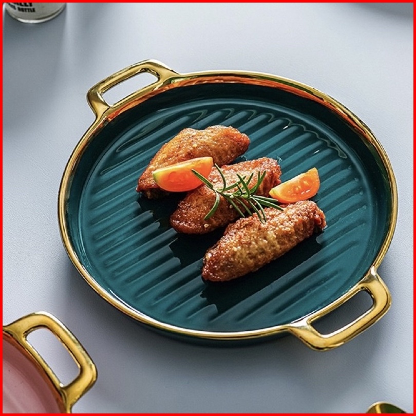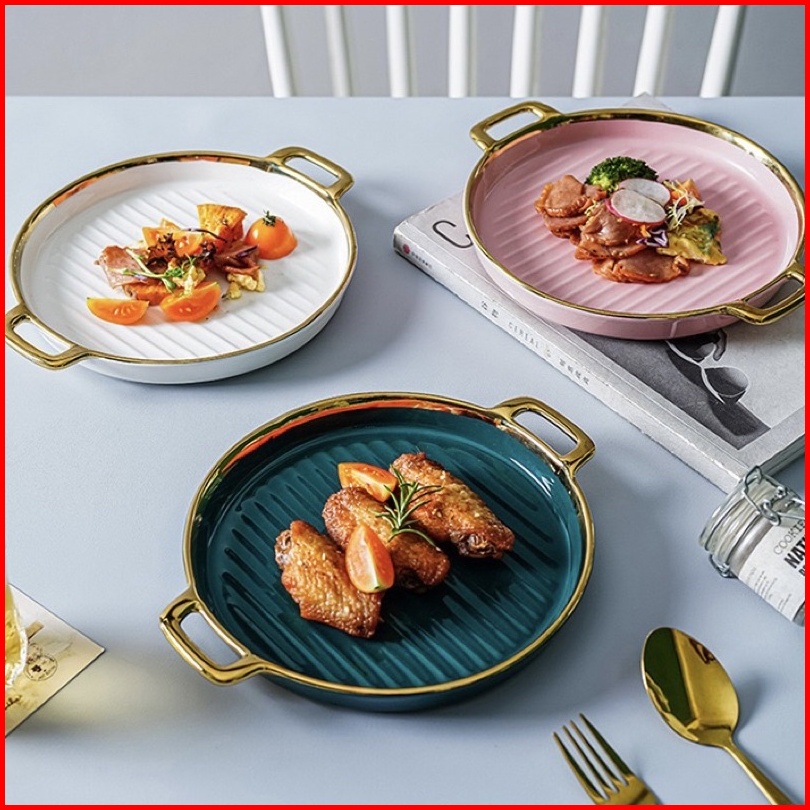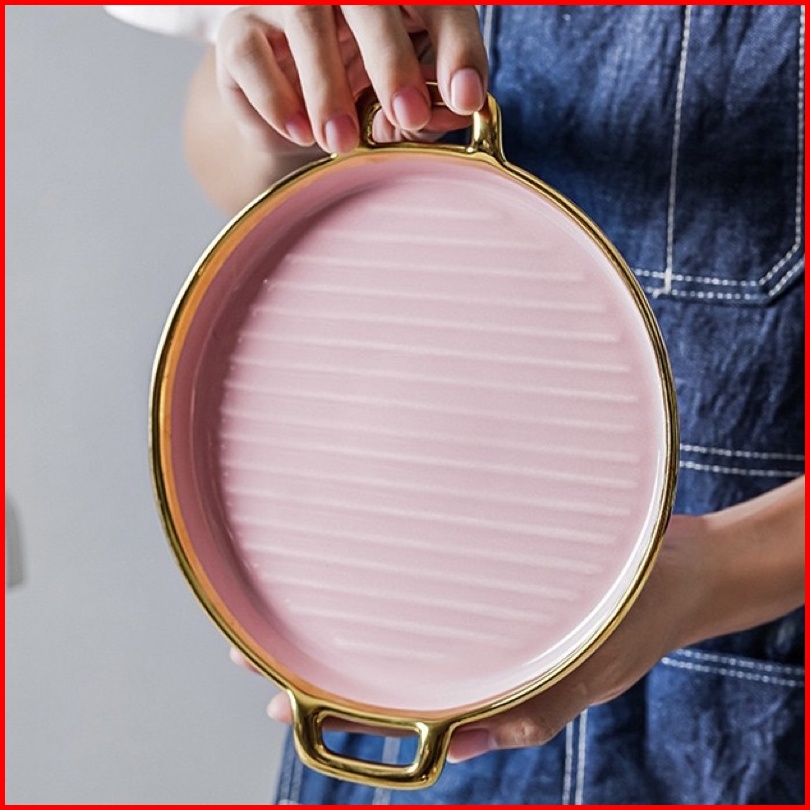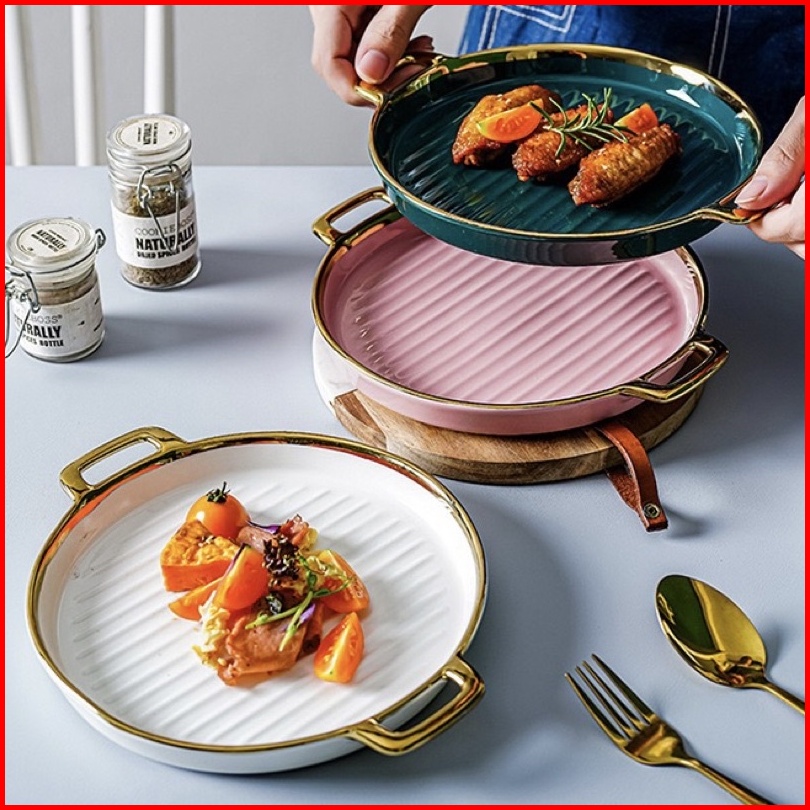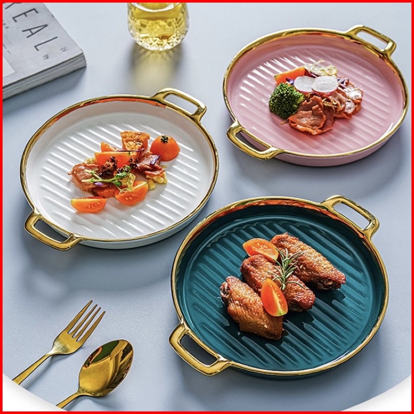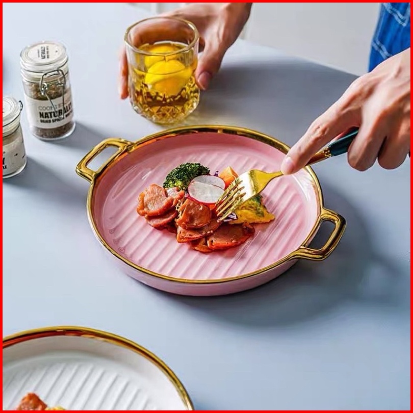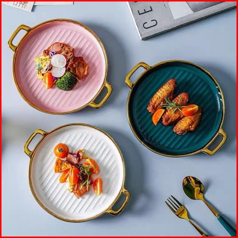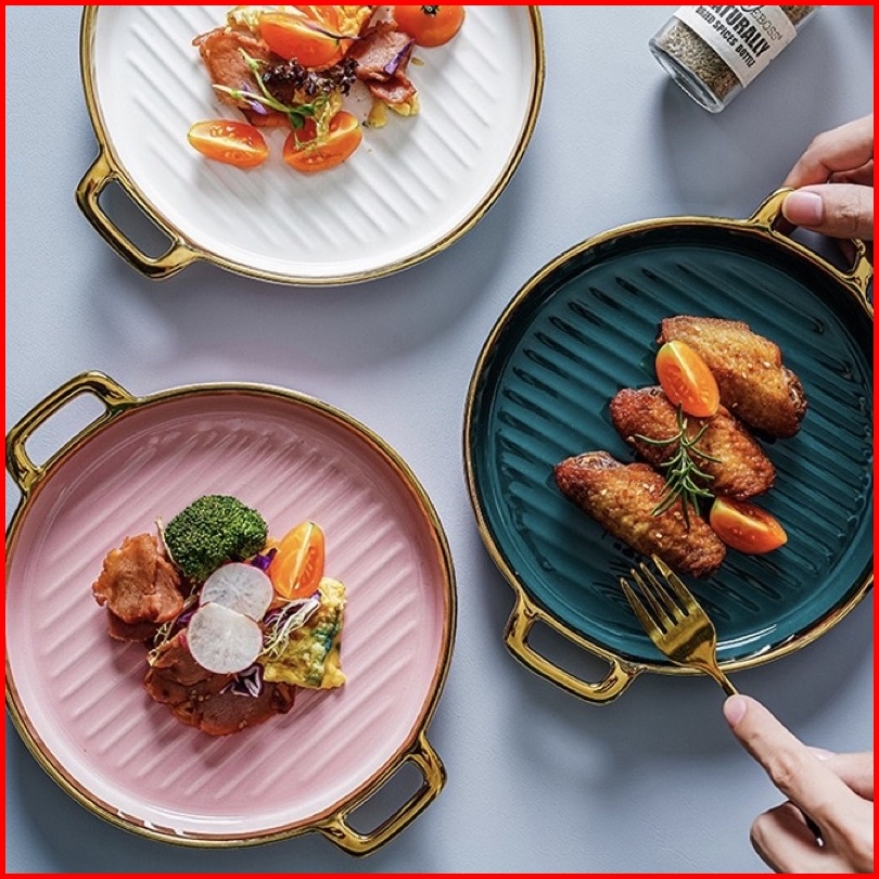 Ricci Plate Piring Saji Keramik Bulat Dua Pegangan List Pink Putih Hijau