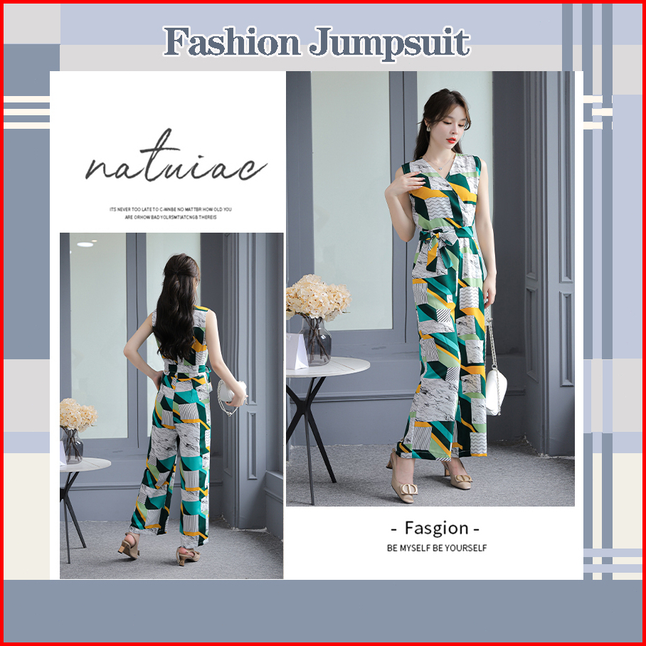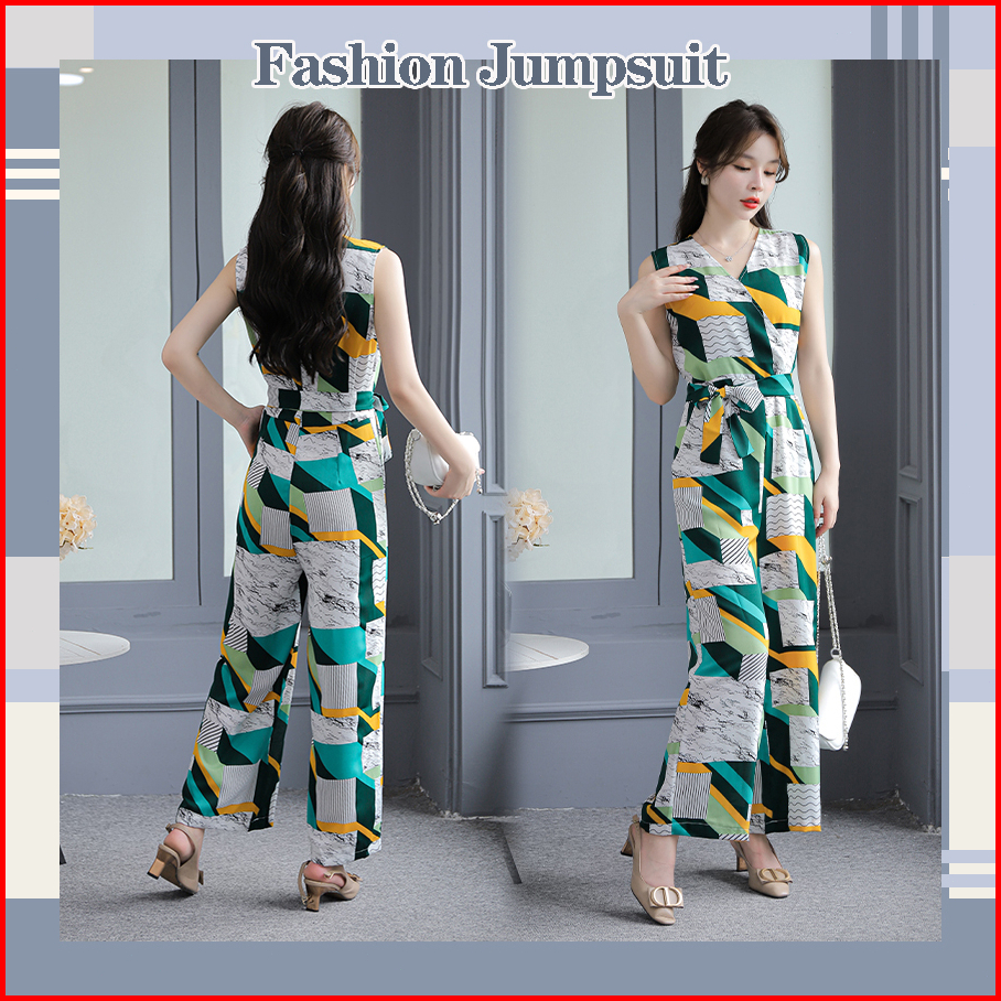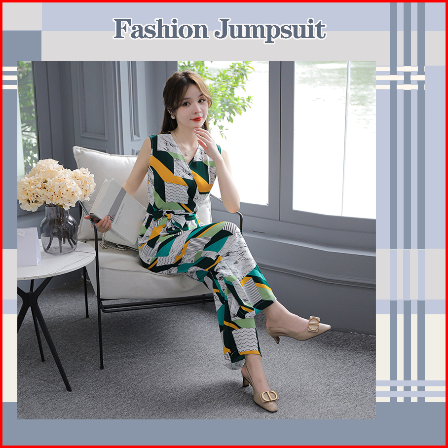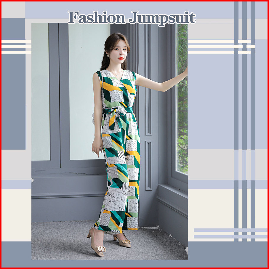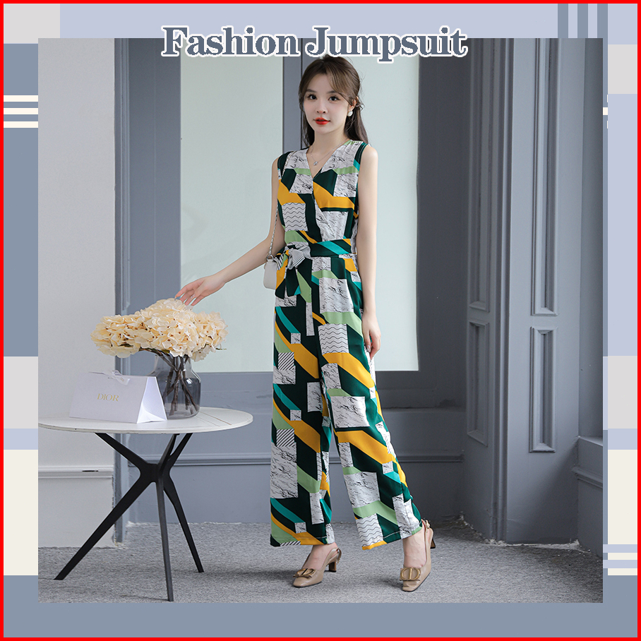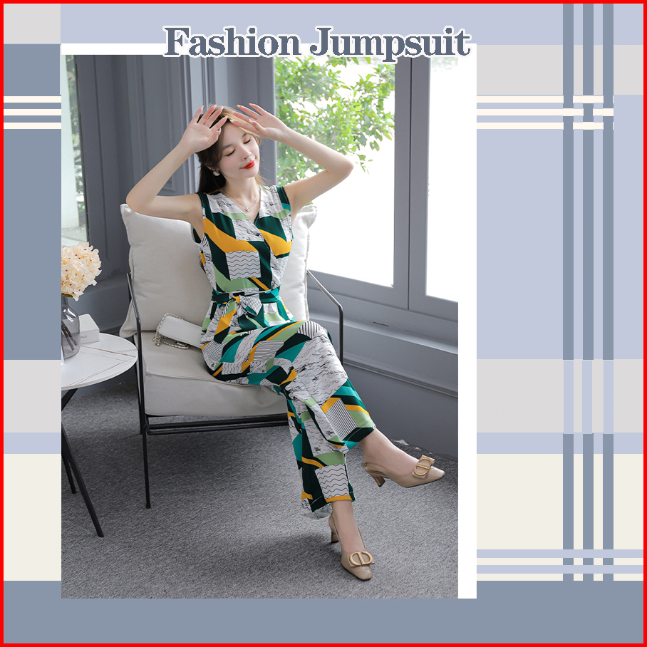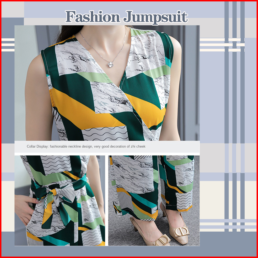 Jumpsuit Leher V-leher Tanpa Lengan Busana Cetak Versi Korea Dengan Saku Kain Lapis Tunggal Tanpa Peregangan