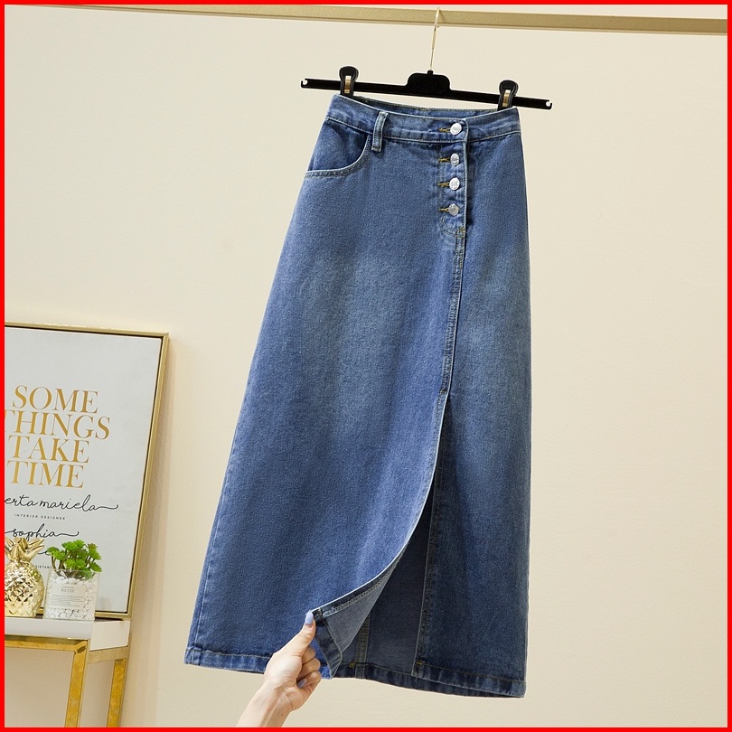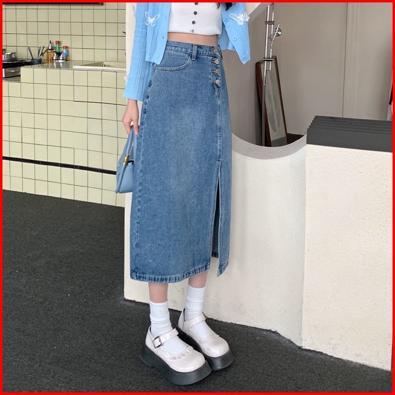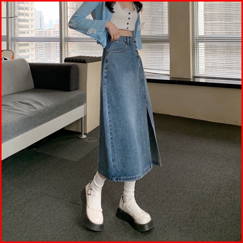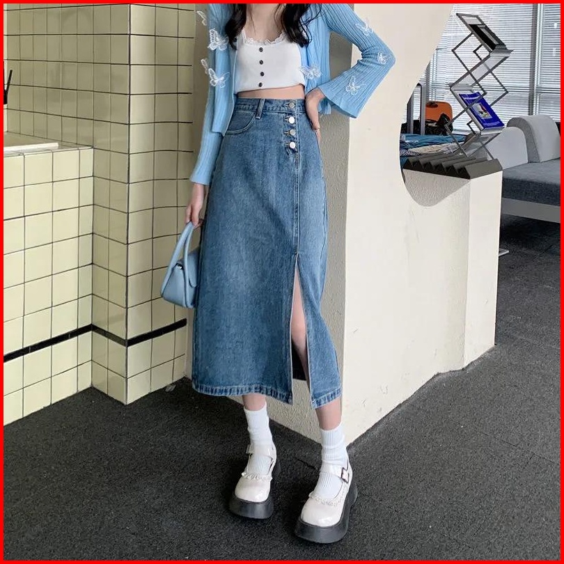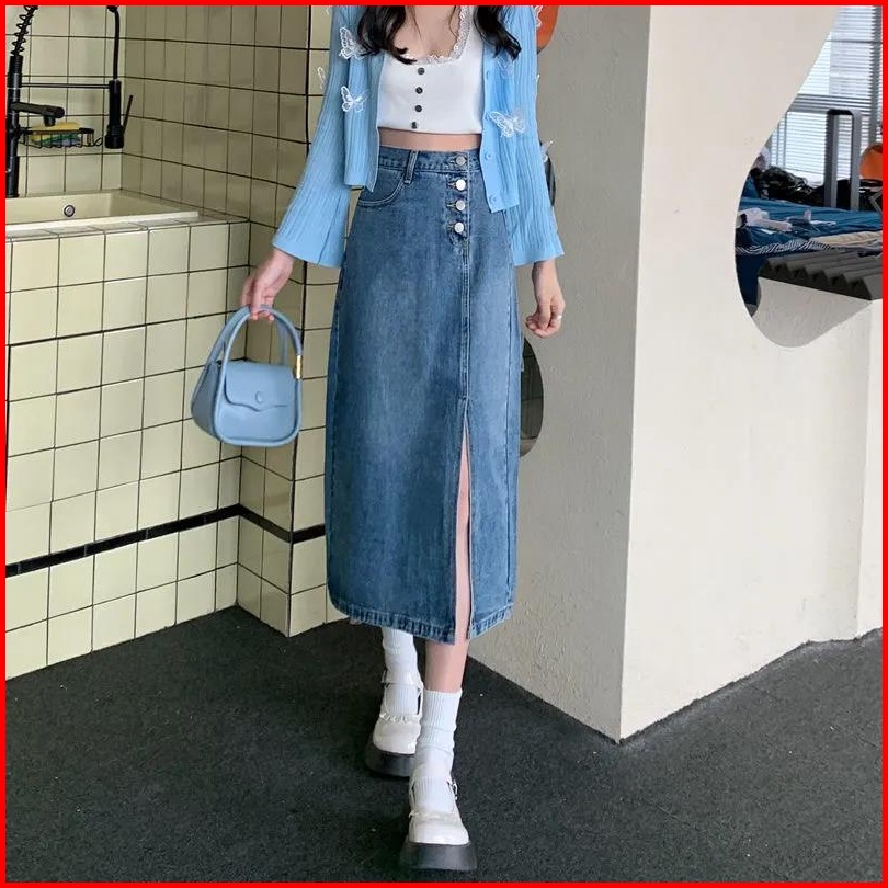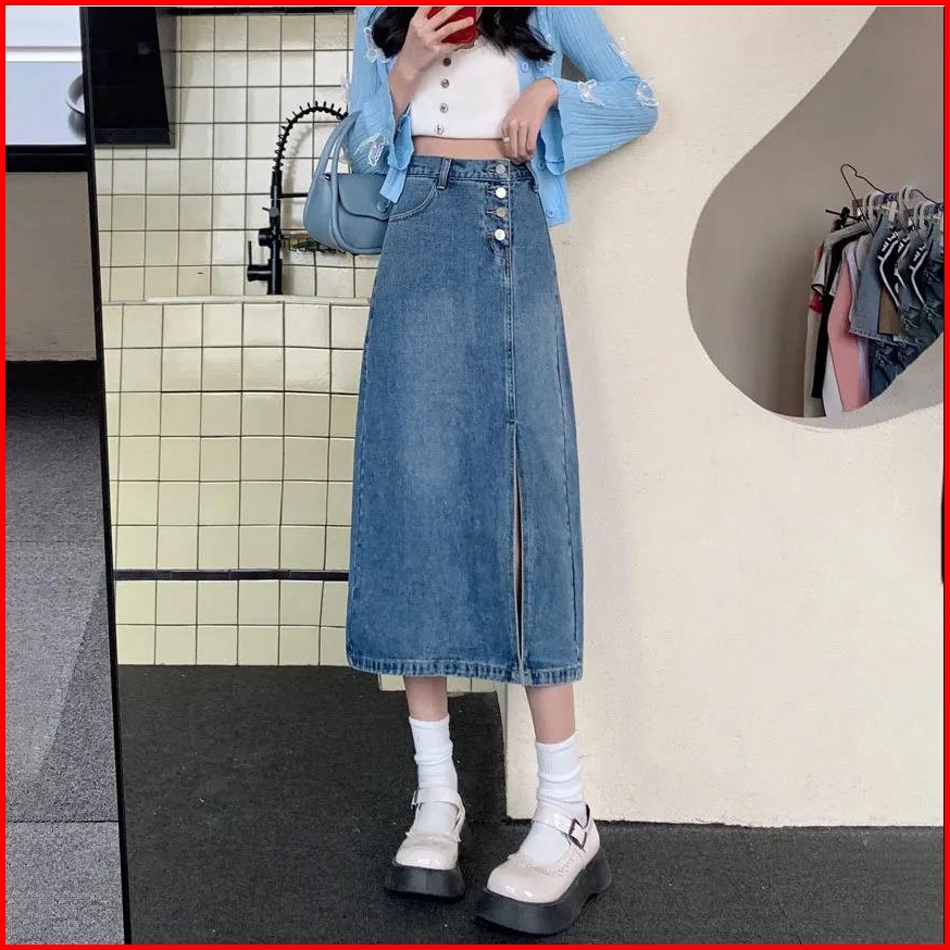 A-line Rok Jeans Wanita Korea Kekinian Highwaist Rok Jeans Wanita