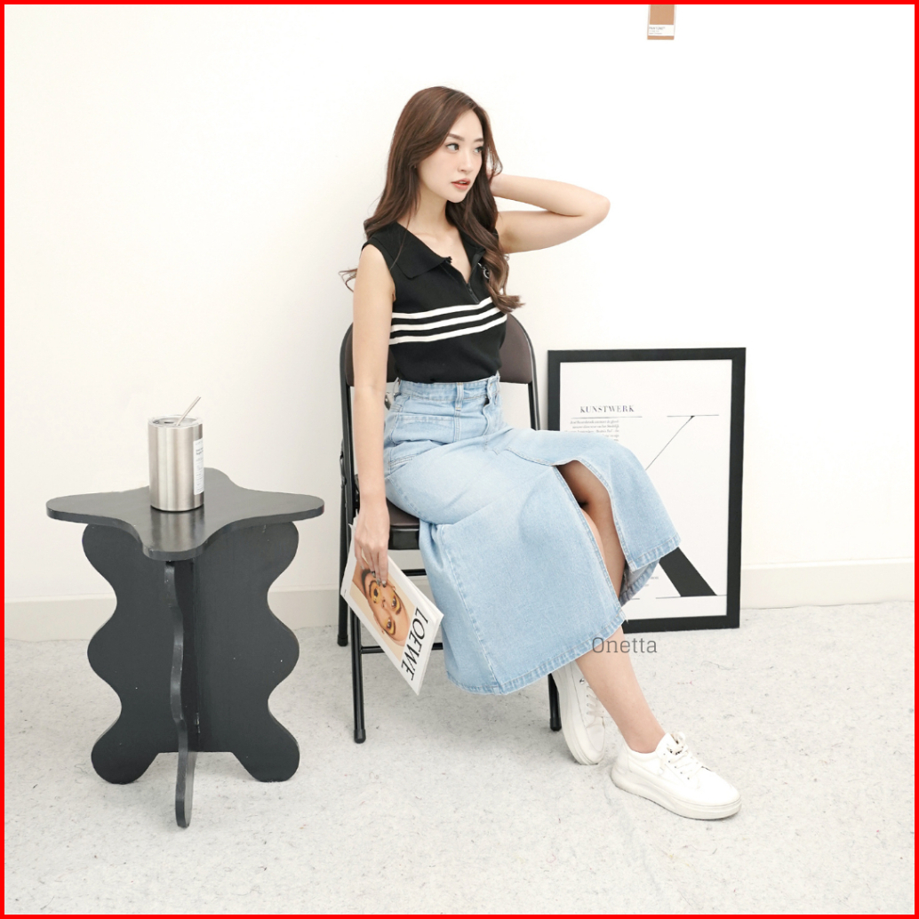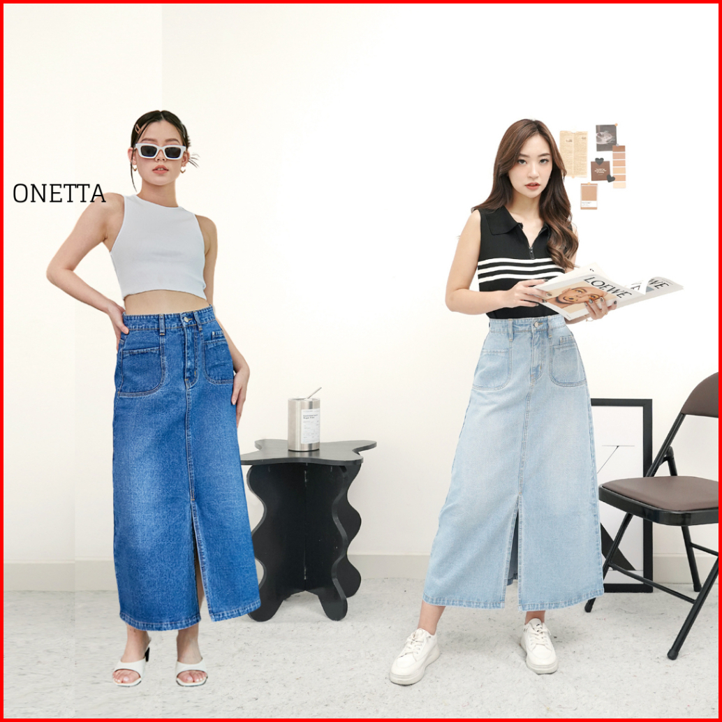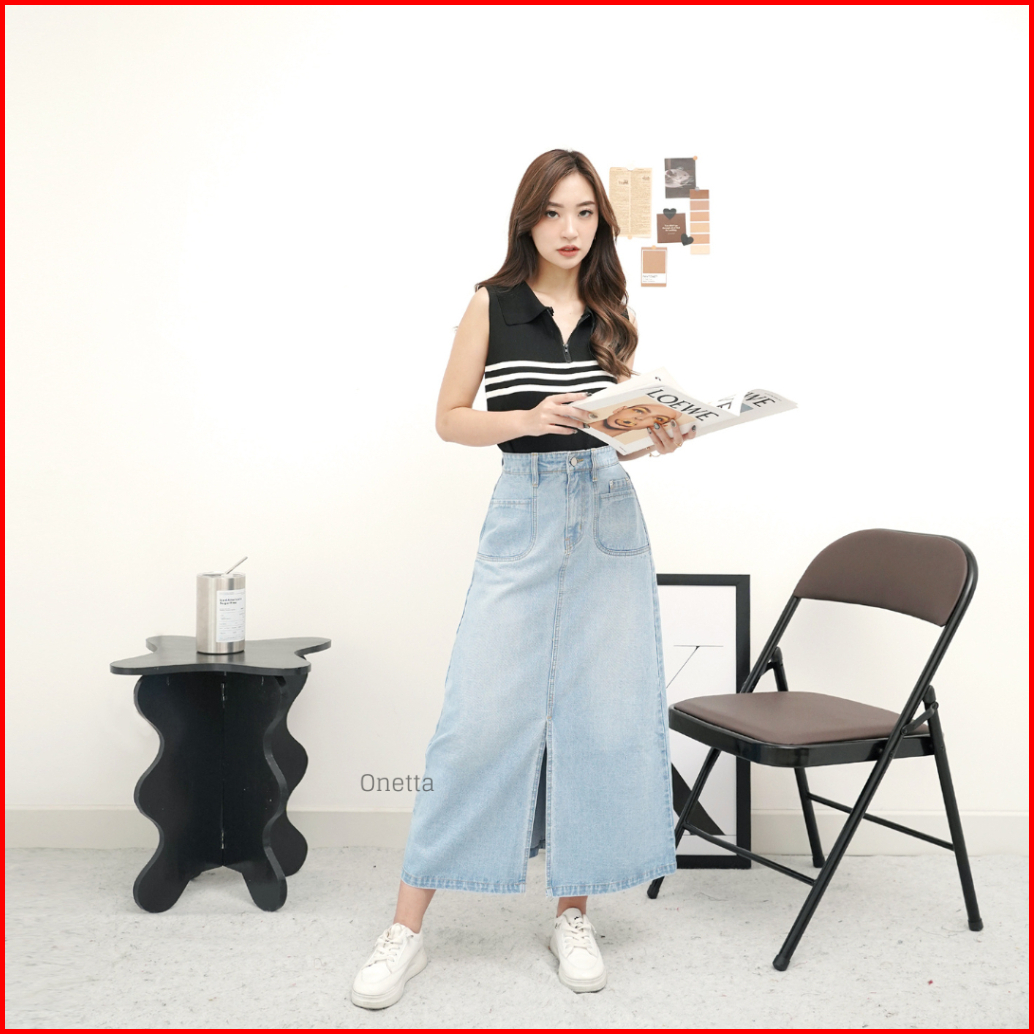 Onetta - Rok High Waist Jeans Wanita A Line Denim Skirt - Emerie Aqua Scrub