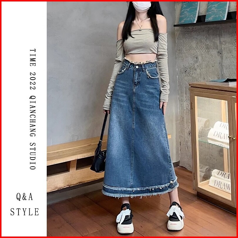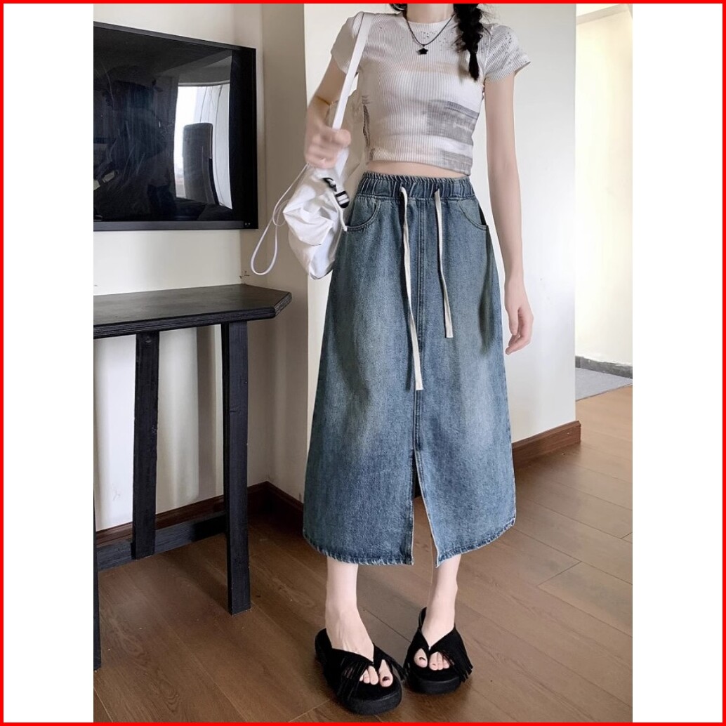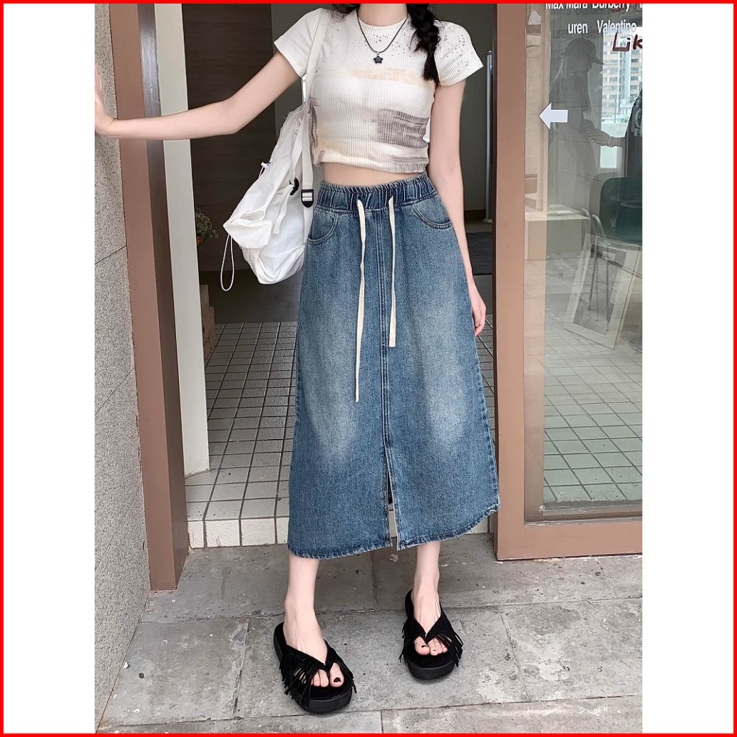 Keygirl Rok Kekinian New Karet Jeans Rok Split Depan Fashion Kasual Midi Denim Skirt Highwaist Jumbo Size Wanita