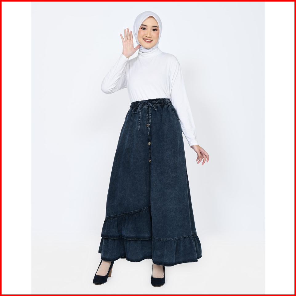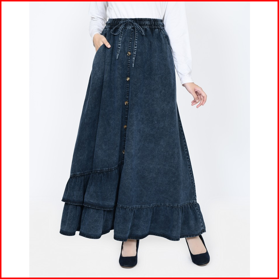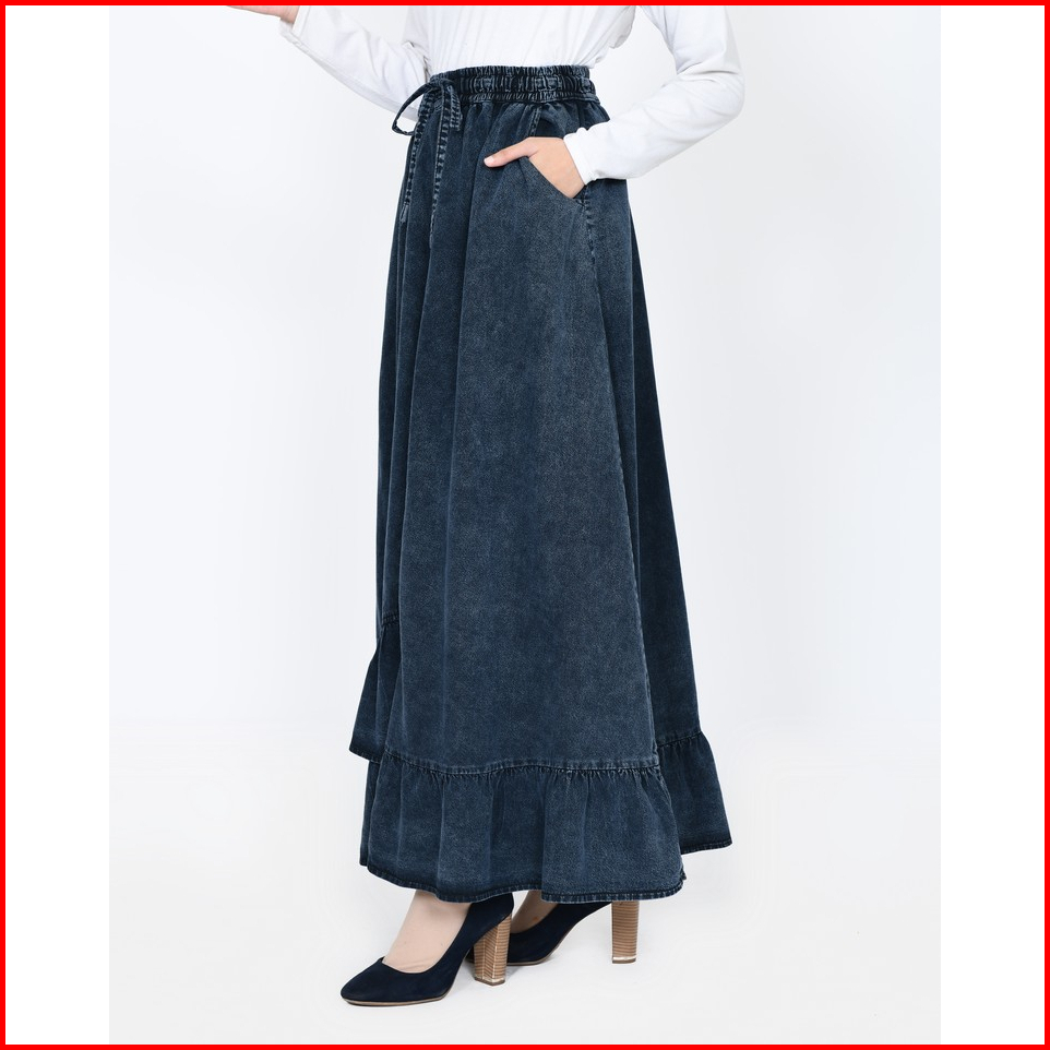 Long Skirt Denim Inayah Rok Jeans Lebar Muslimah Panjang 94cm Pinggang Karet Fit Bb 44- 65kg Lezahrasignature