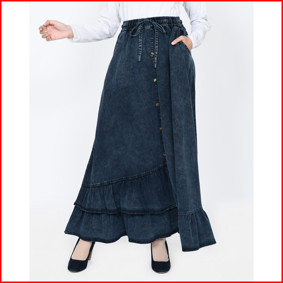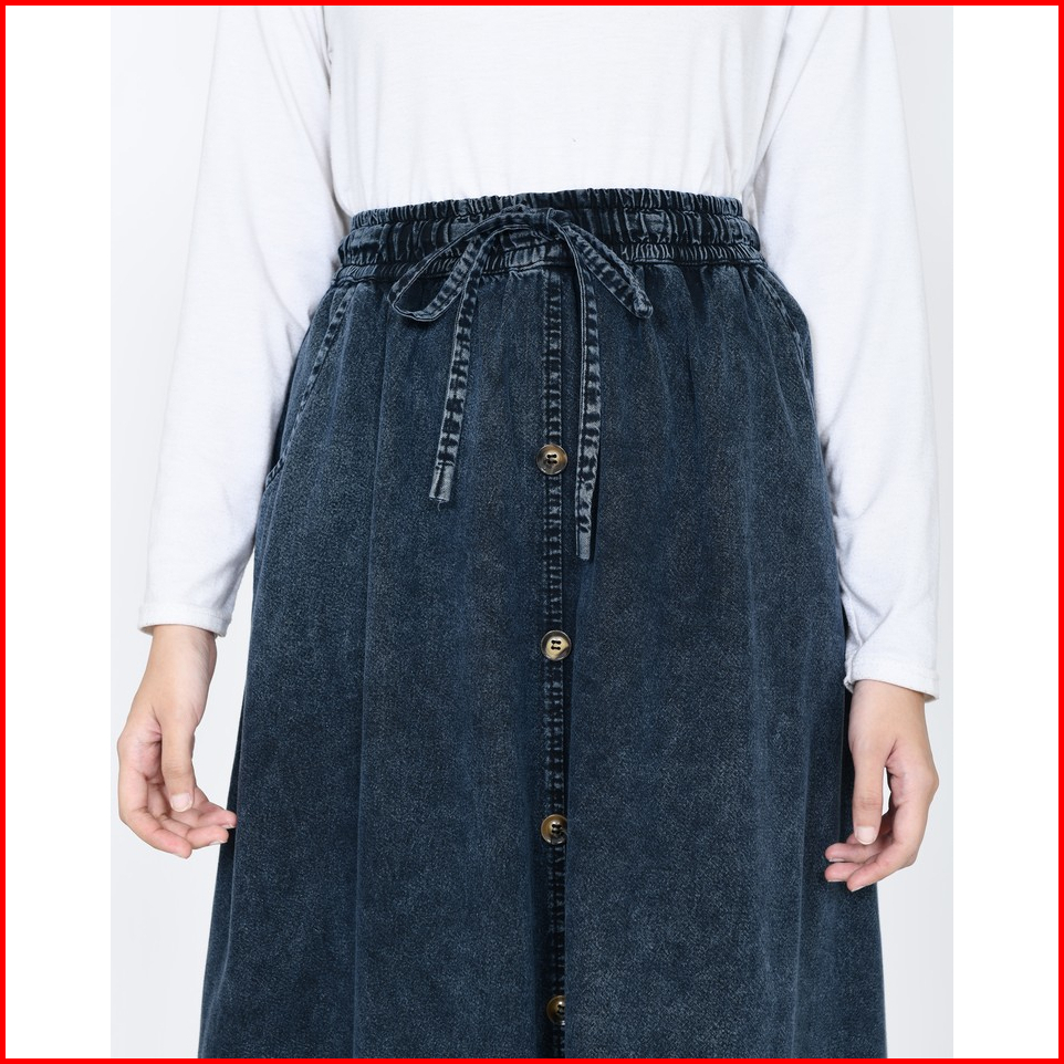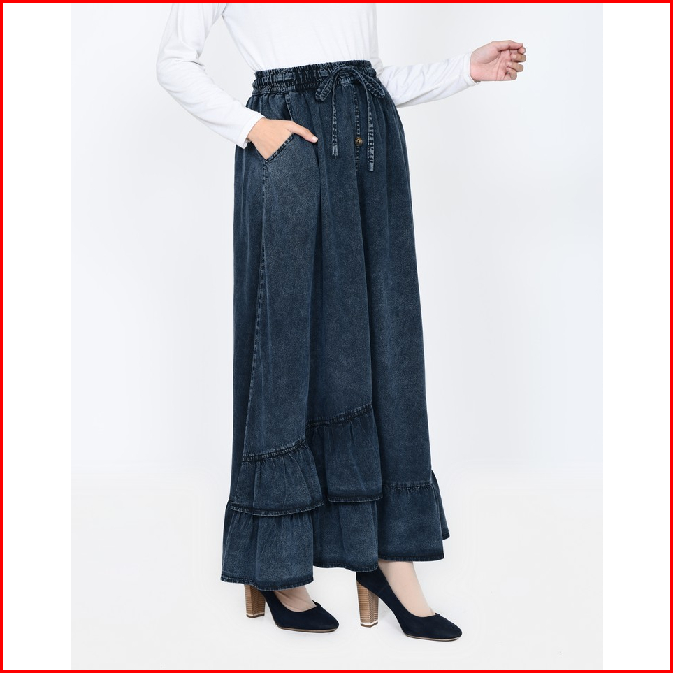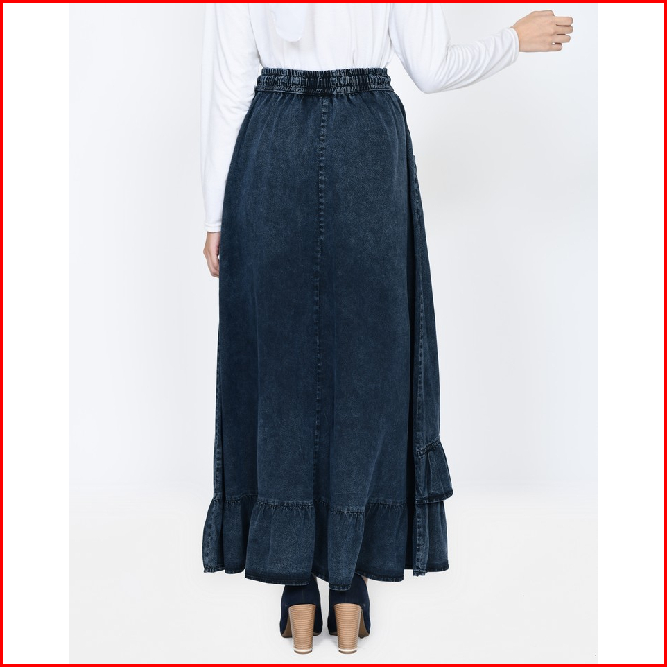 Long Skirt Denim Inayah Rok Jeans Lebar Muslimah Panjang 94cm Pinggang Karet Fit Bb 44- 65kg Lezahrasignature