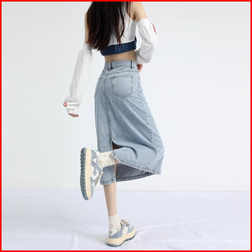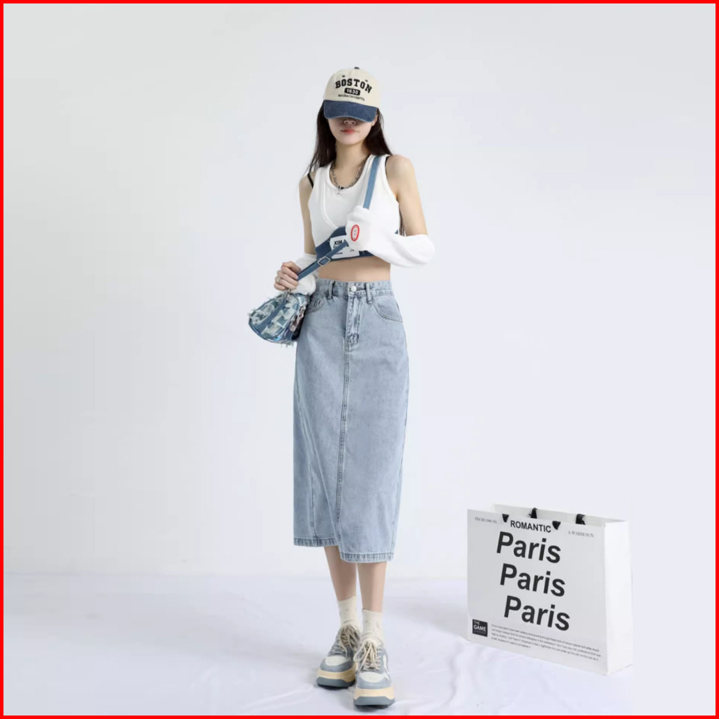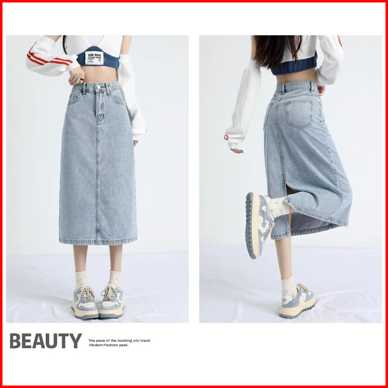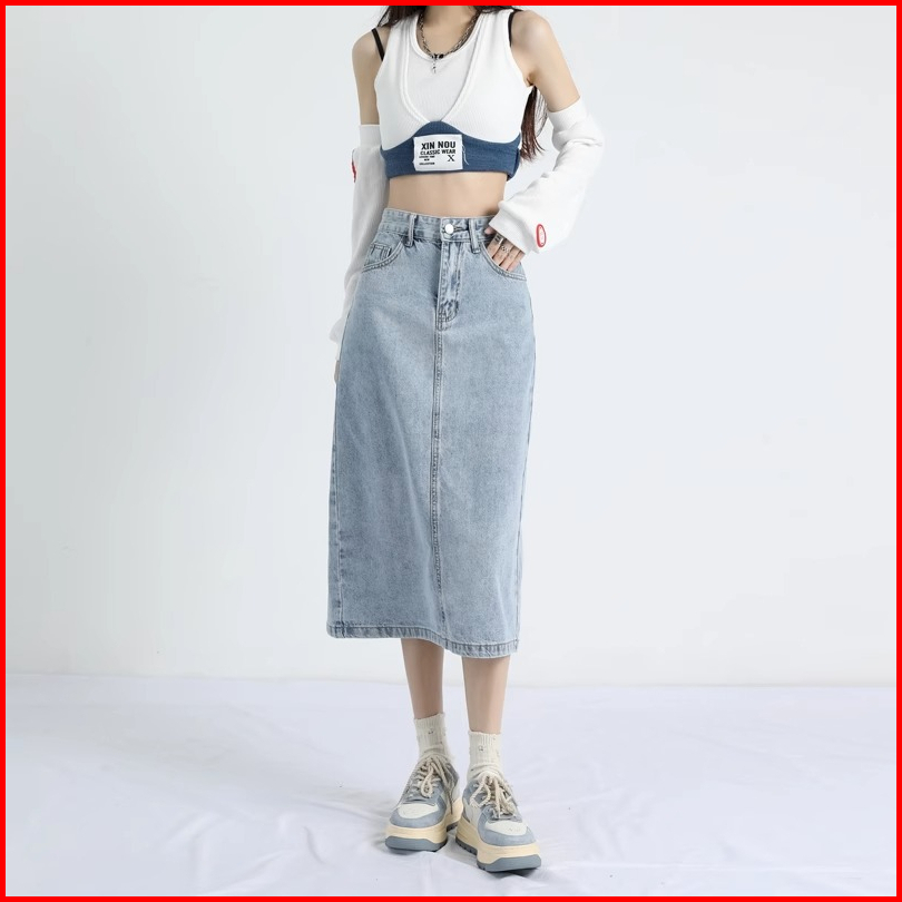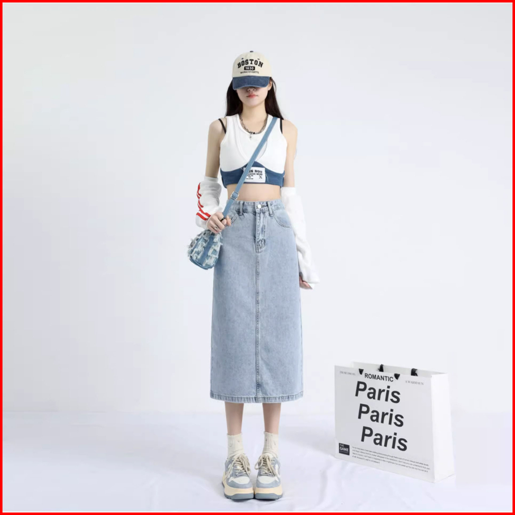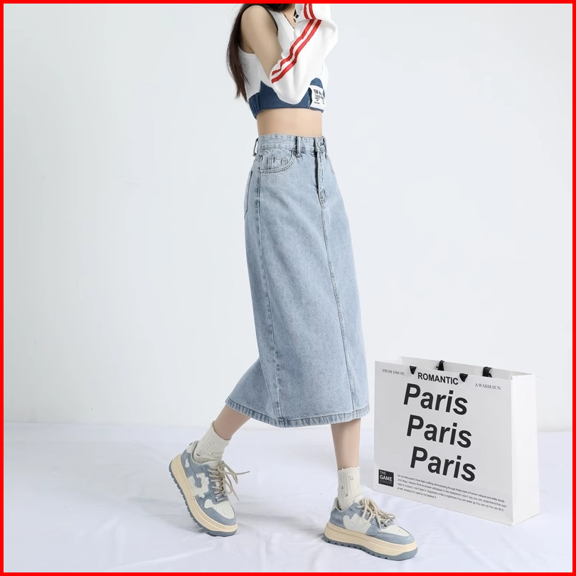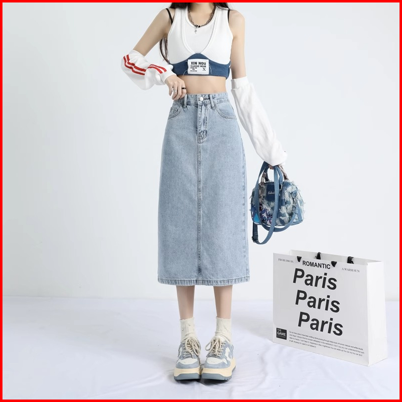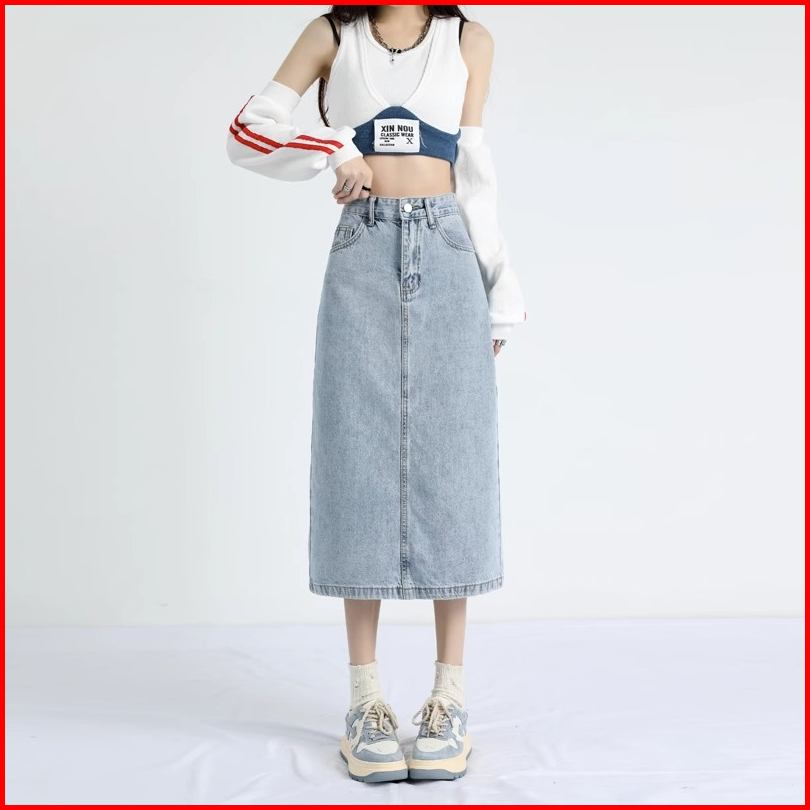 Korea Style Highwaist Kasual Rok Midi A-line Denim