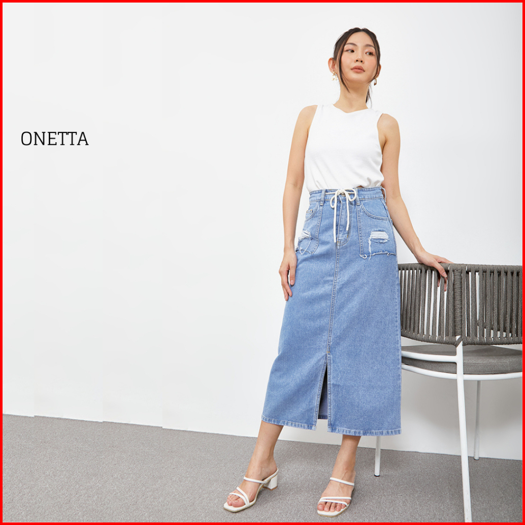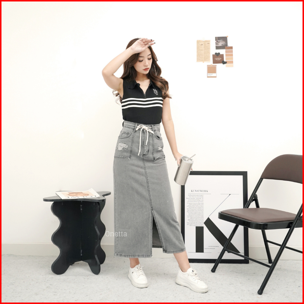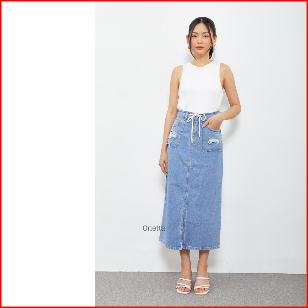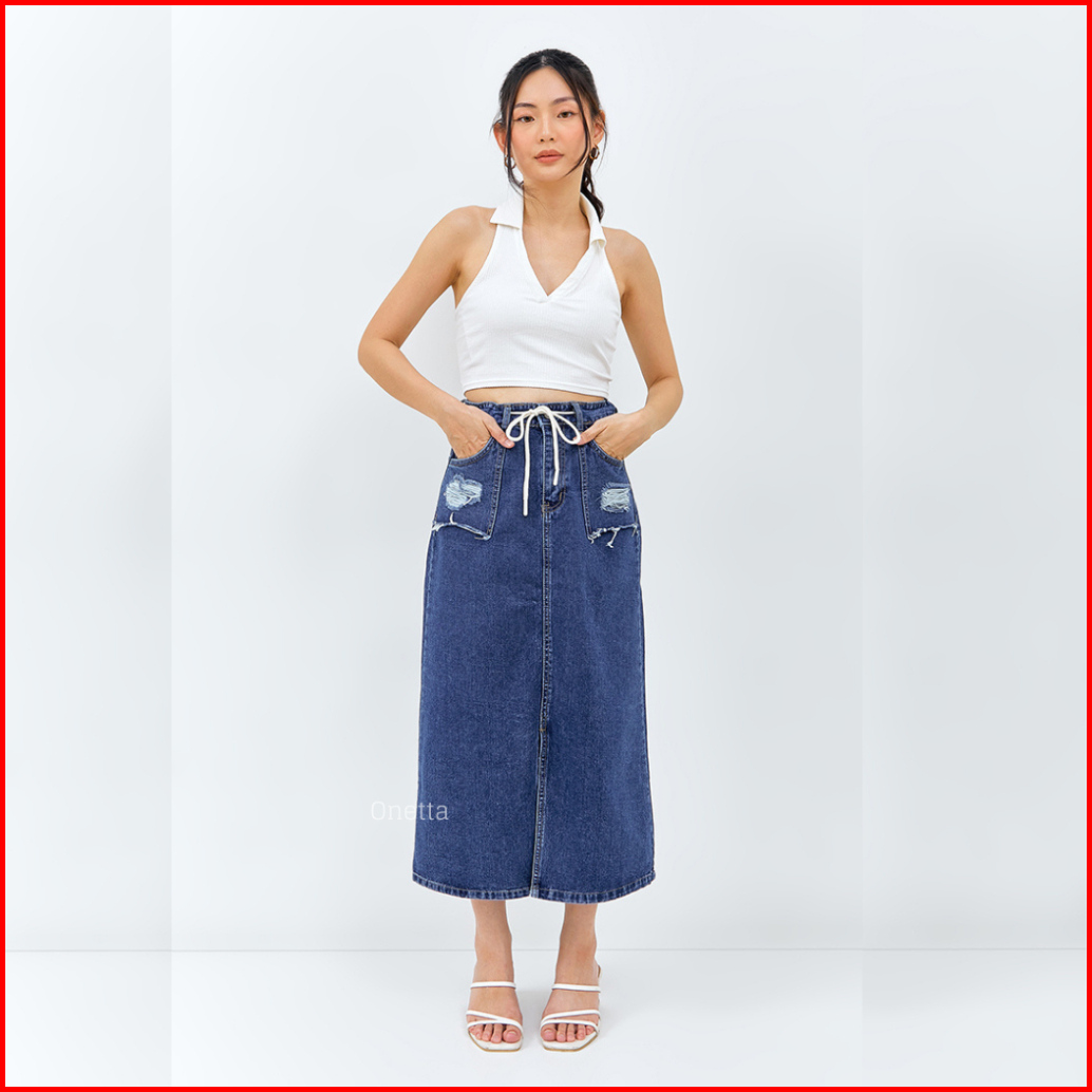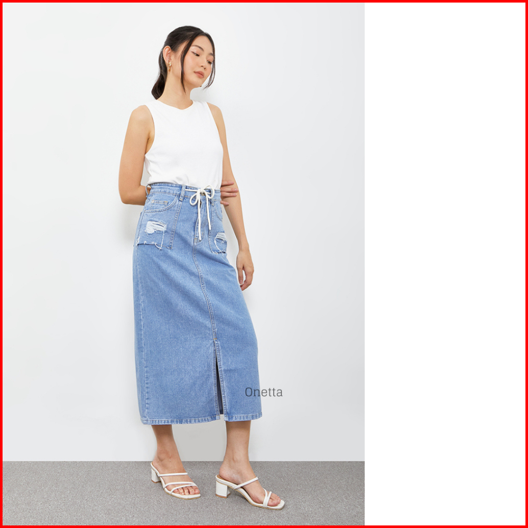 Rok Jeans Midi Belah Depan Highwaist Motif Destroyed Cecil Skirt - Onetta