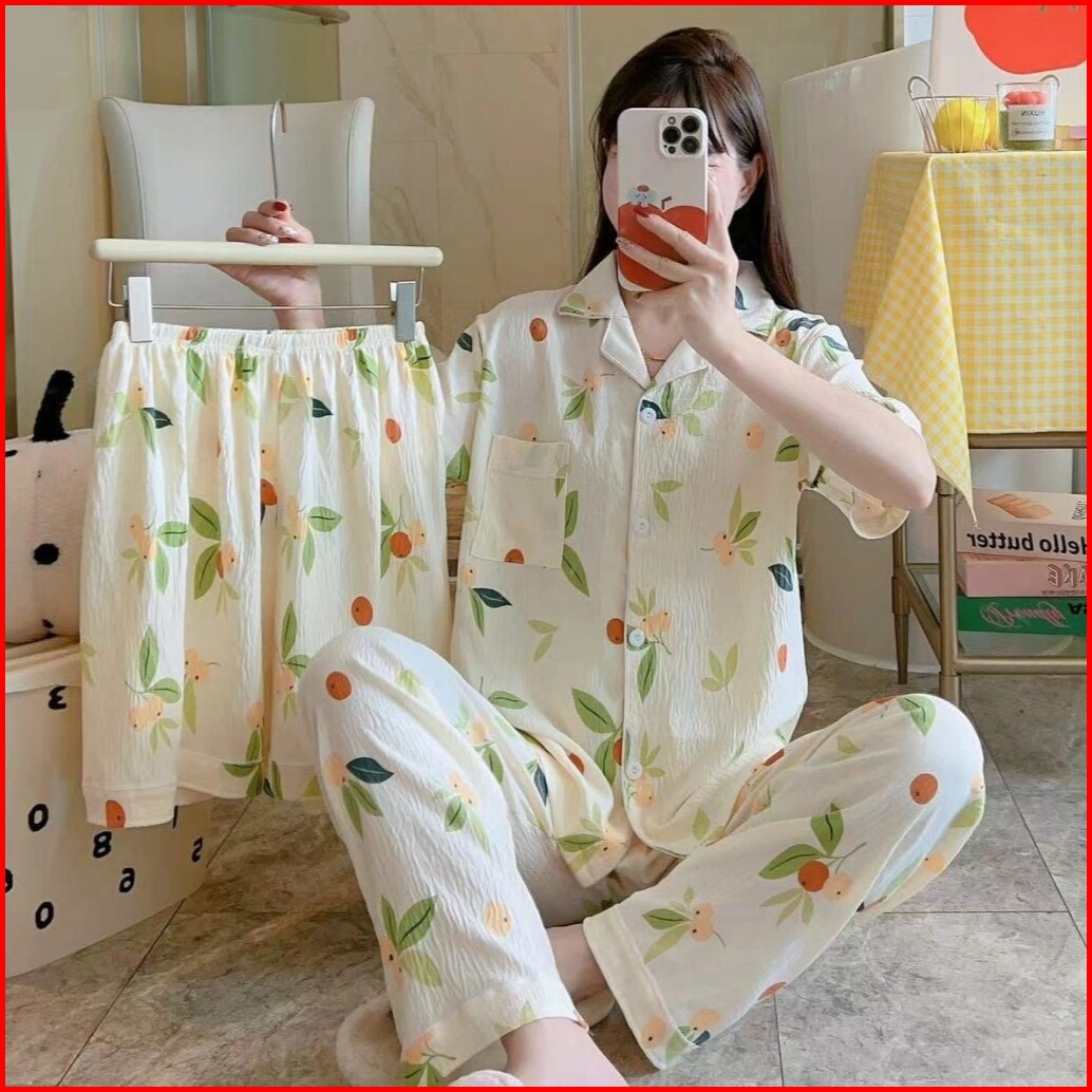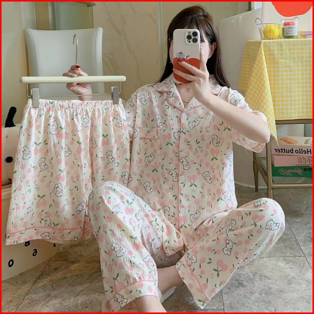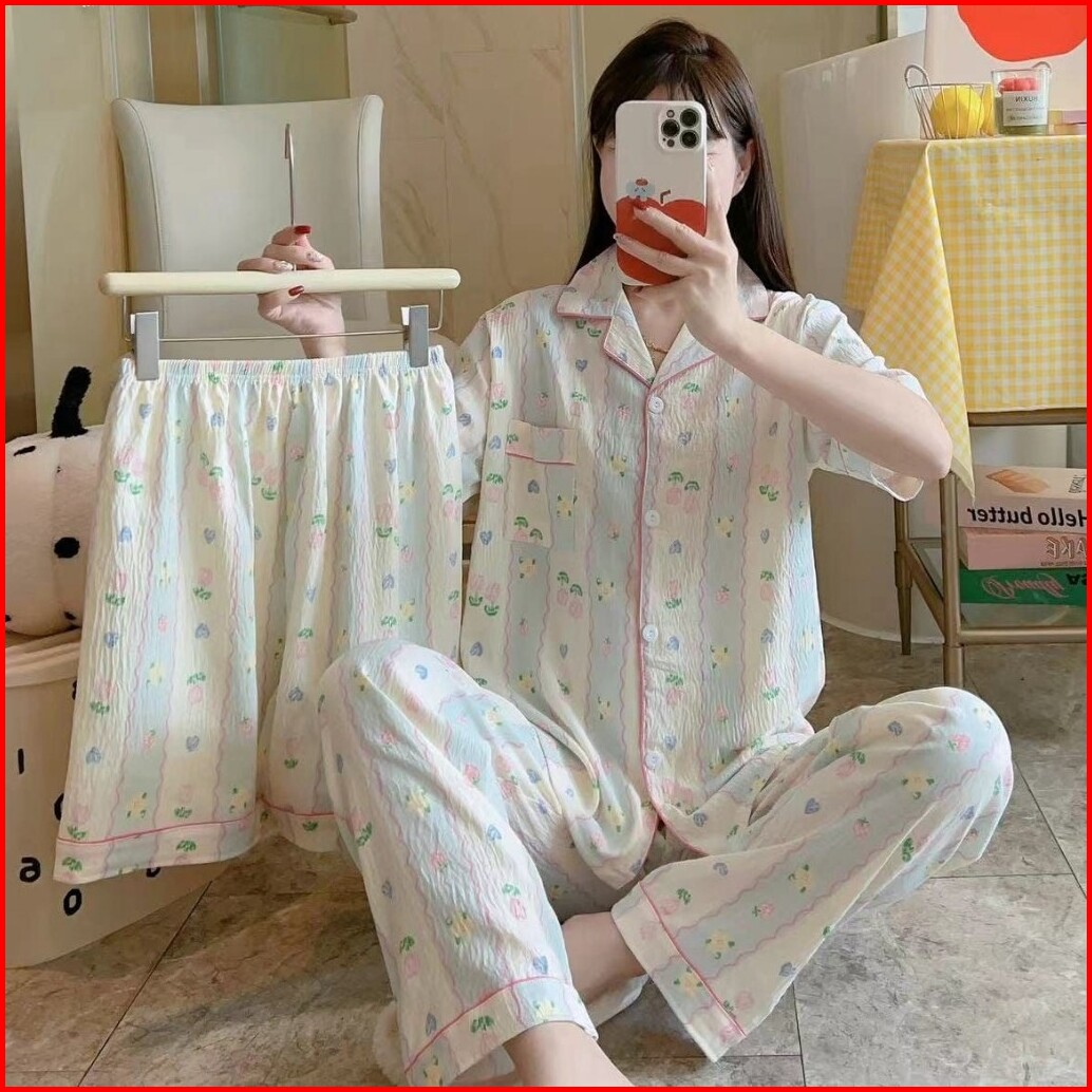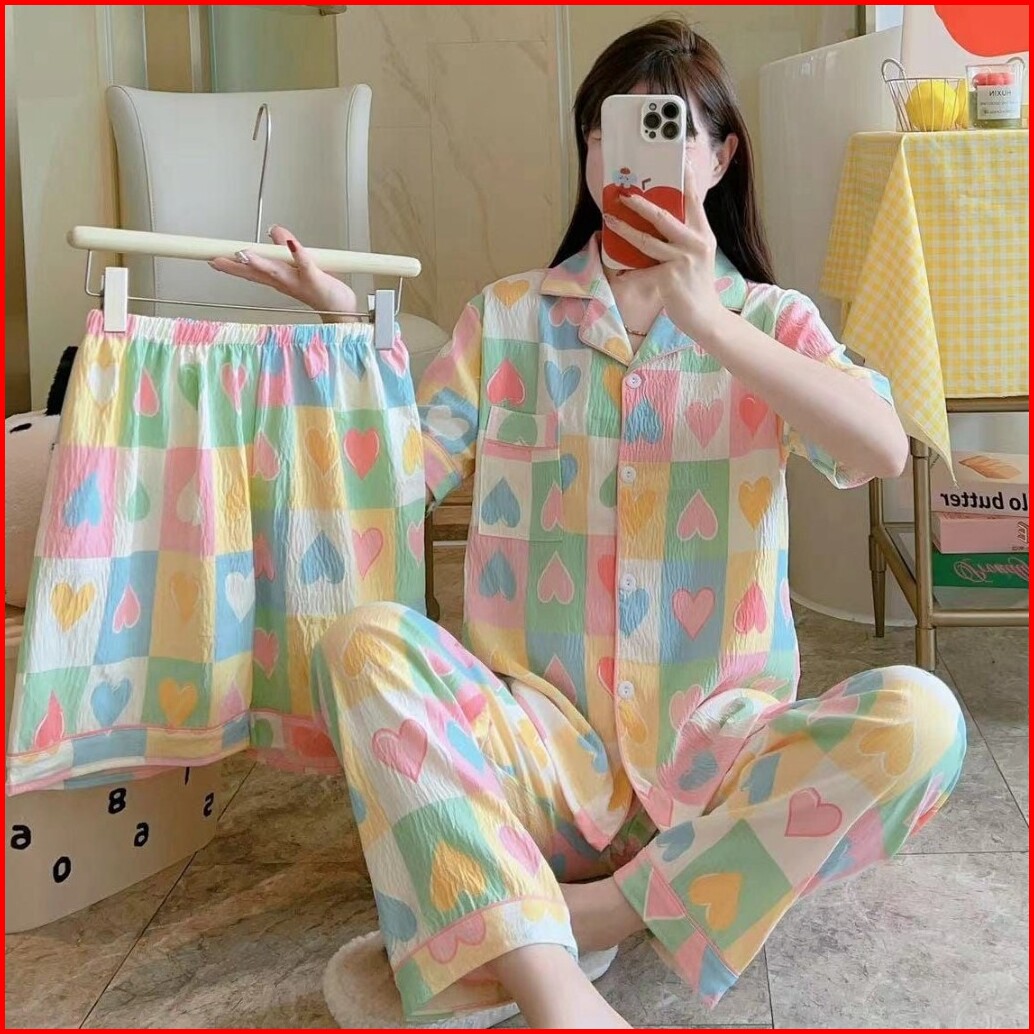 Piyama Kancing Depan Import Set 3in1 Satu Baju Dua Celana Baju Tidur Kancing Depan Piyama Kancing Pendek Baju Tidur Wani