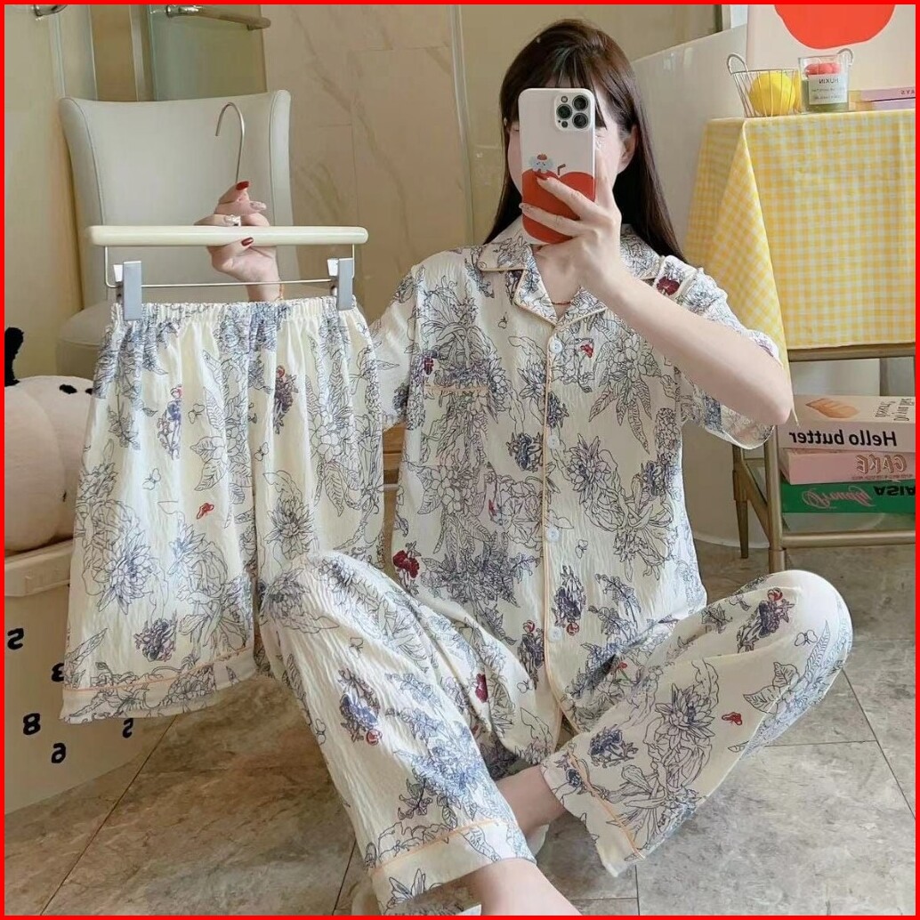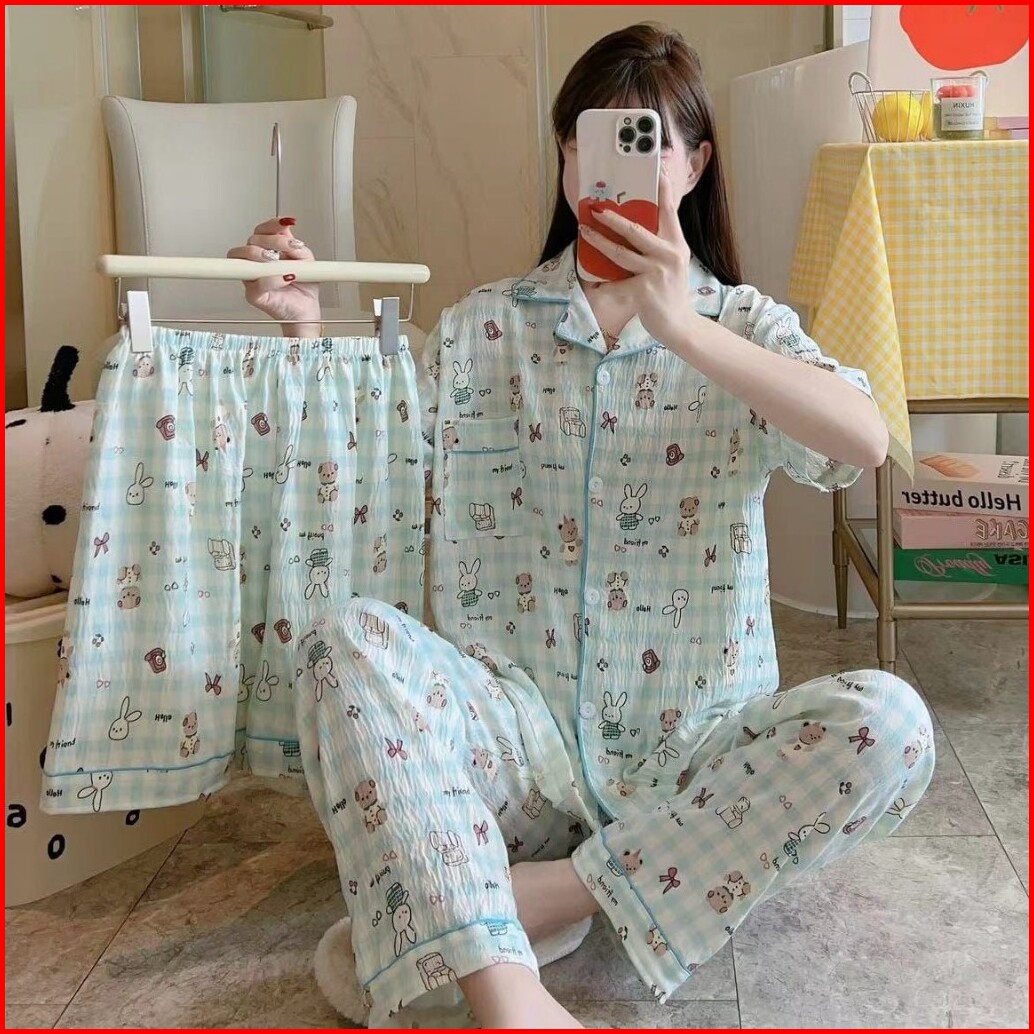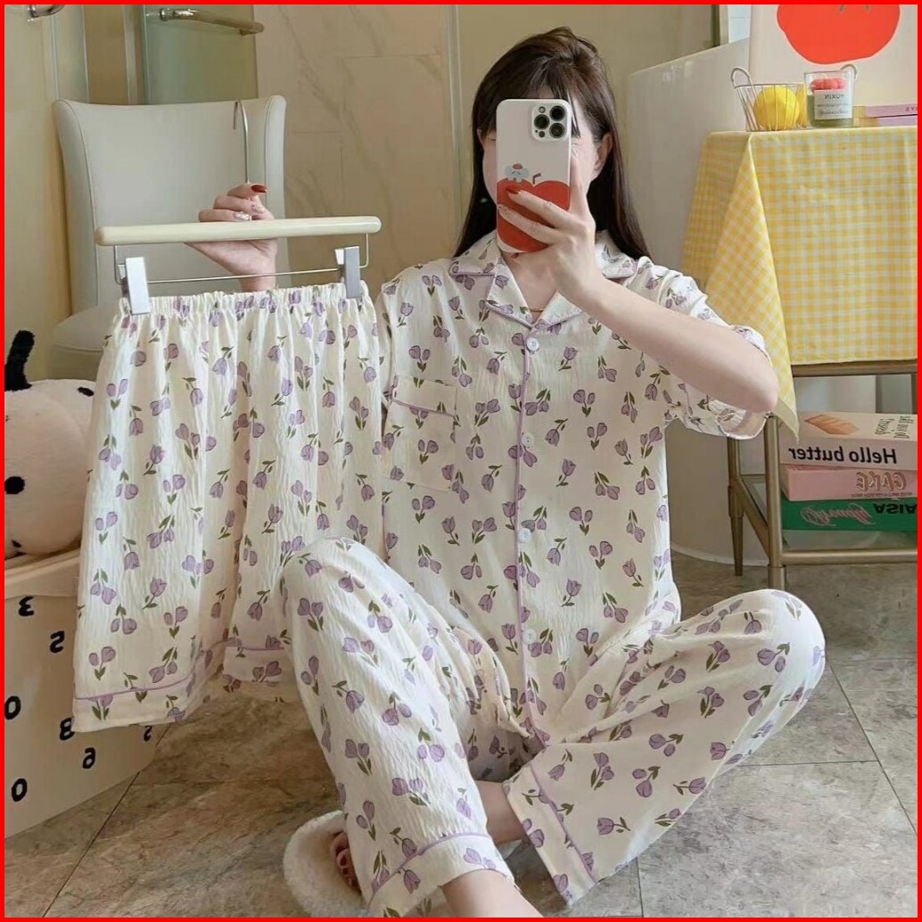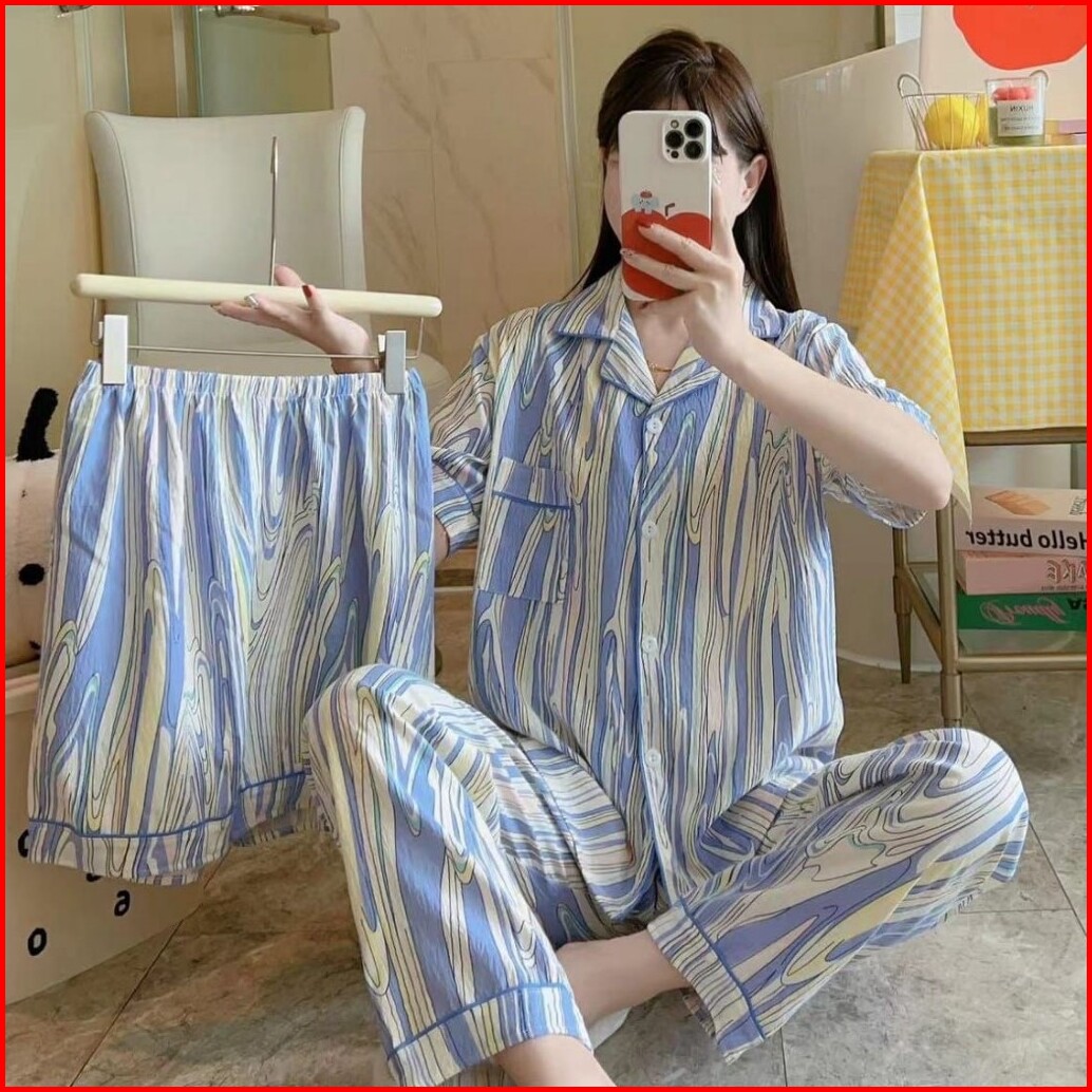 Piyama Kancing Depan Import Set 3in1 Satu Baju Dua Celana Baju Tidur Kancing Depan Piyama Kancing Pendek Baju Tidur Wani
