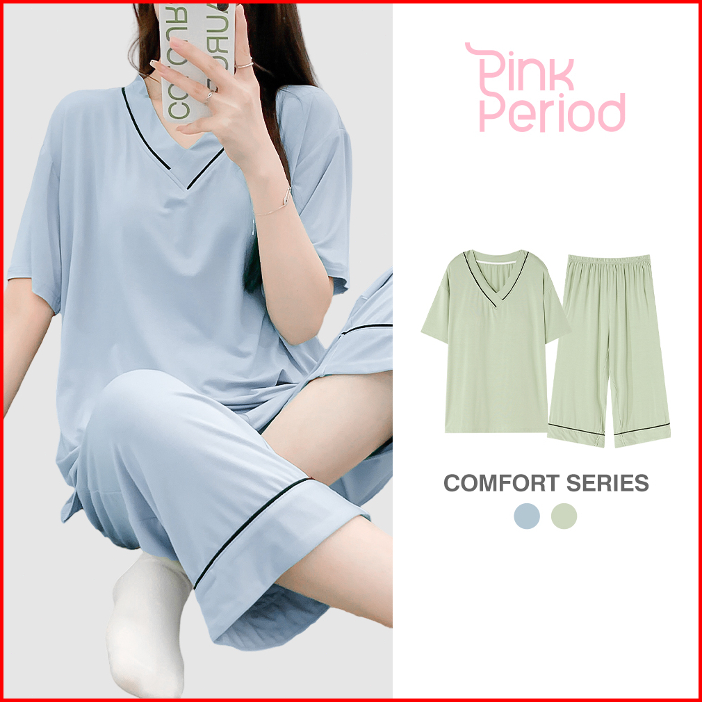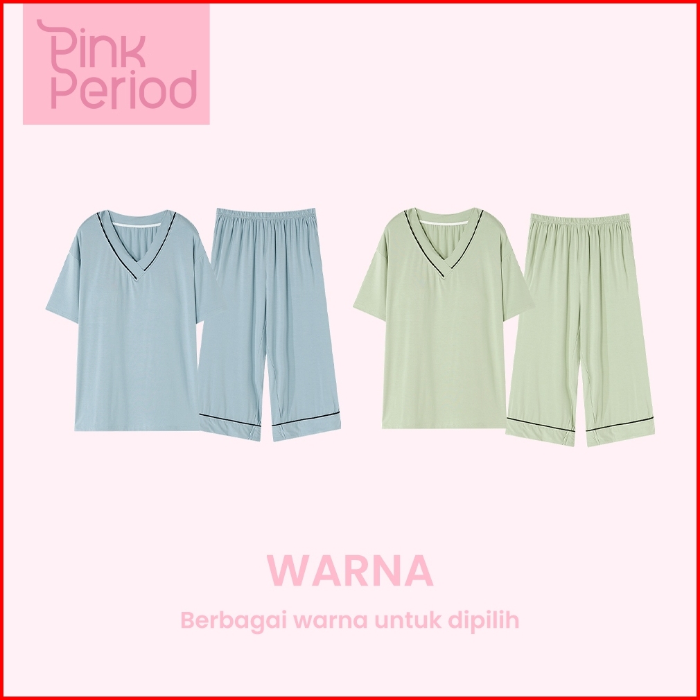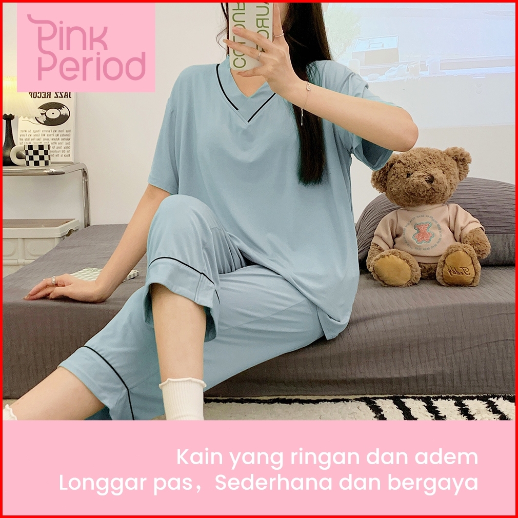 Pink Period Setelan Lengan Pendek Piyama Rayon Piyama V Neck Homewear