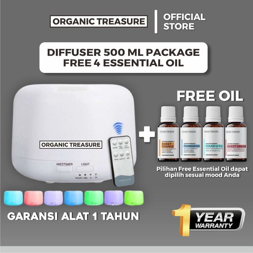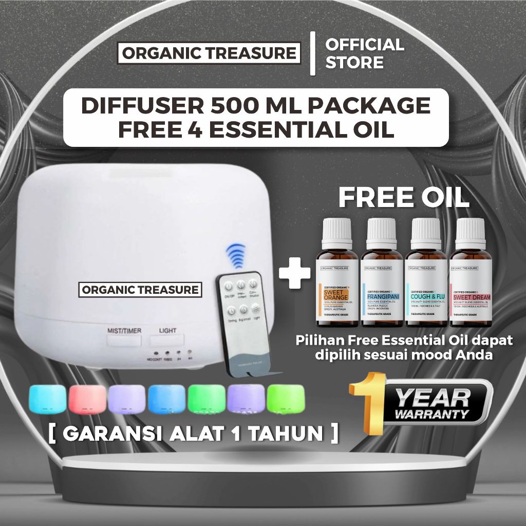 ORGANIC TREASURE - Paket Diffuser 500ML Aromatherapy FREE 4 Essential Oil Grade+ [ 1 YEAR GUARANTEE ]