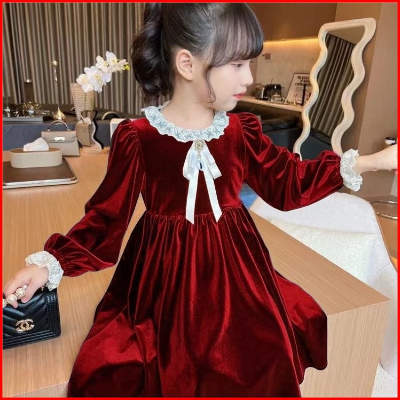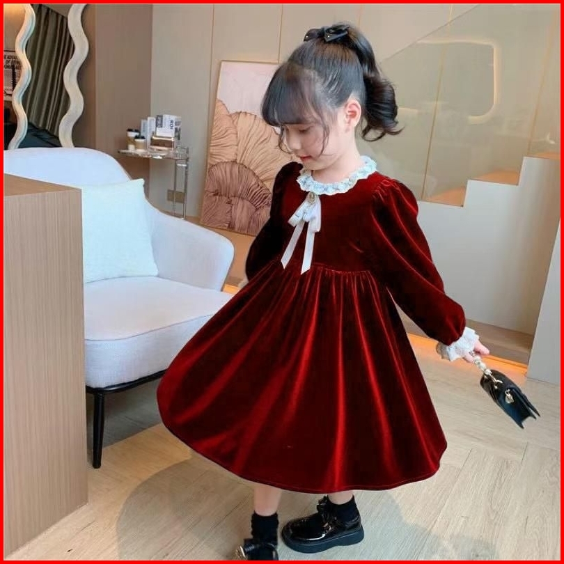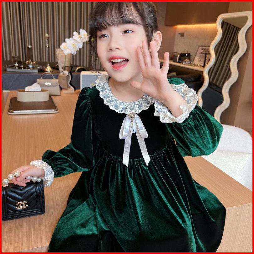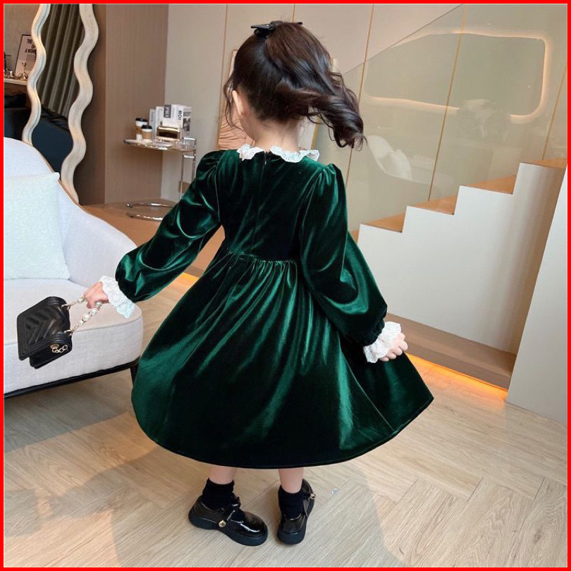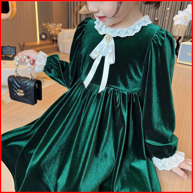 Kh21 Dress Velvet Hijau Brukat Anak Perempuan Lengan Panjang Gaun Anak Cewek 3-14tahun Baju Anak Ukuran Tanggung