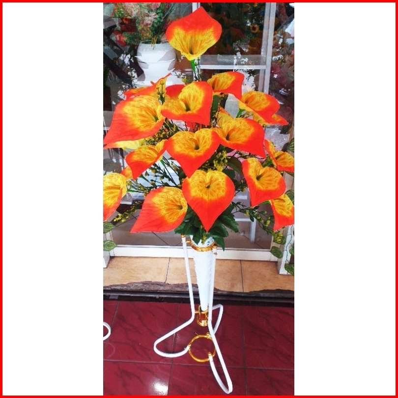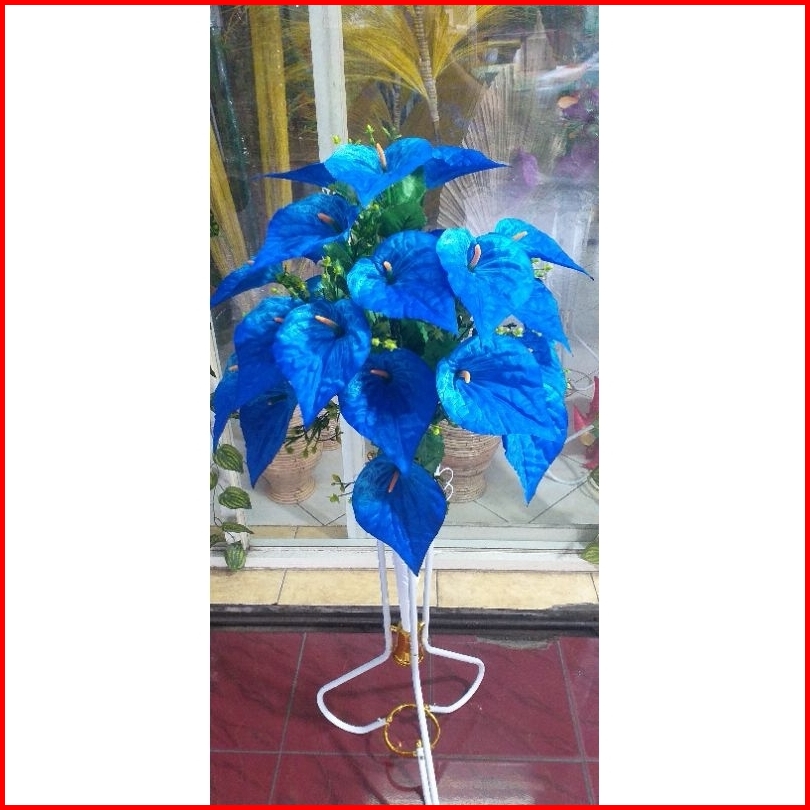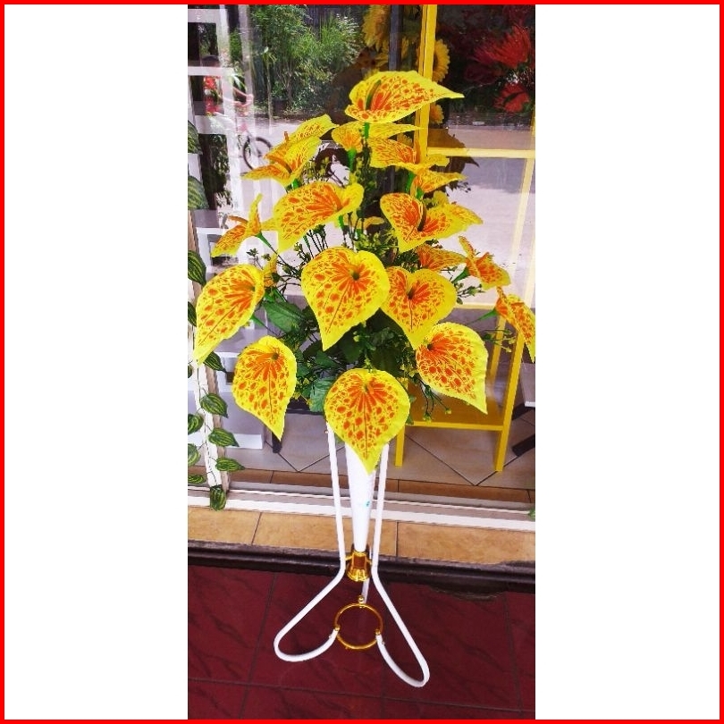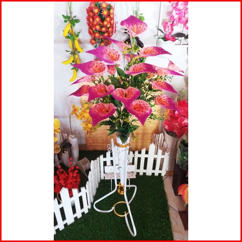 Rangkaian Bunga Anthrium Aron Panda 24 Kuntun Dengan Pot Corong Standing Besi